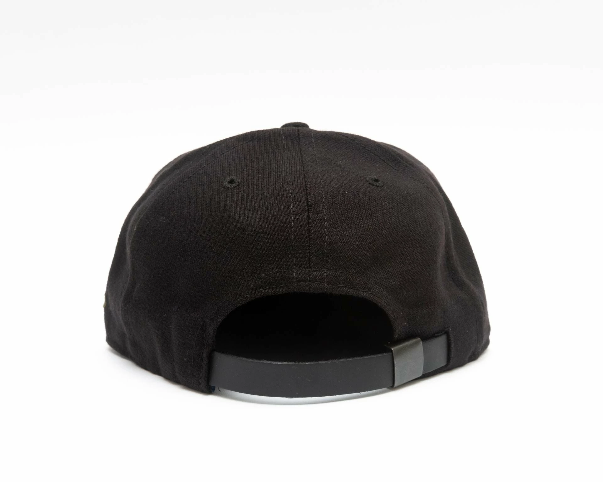 This black strap back hat was made from deadstock heavy twill cotton and finished with an olive-green rip-stop underbrim and navy blue cotton sweatband w/ sweat barrier. Unstructured, crushable upper. Ampal & Eat Dust branding on the inside. Made in the USA.