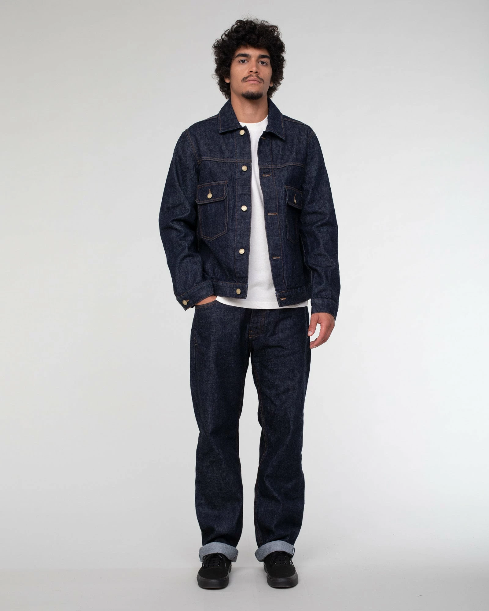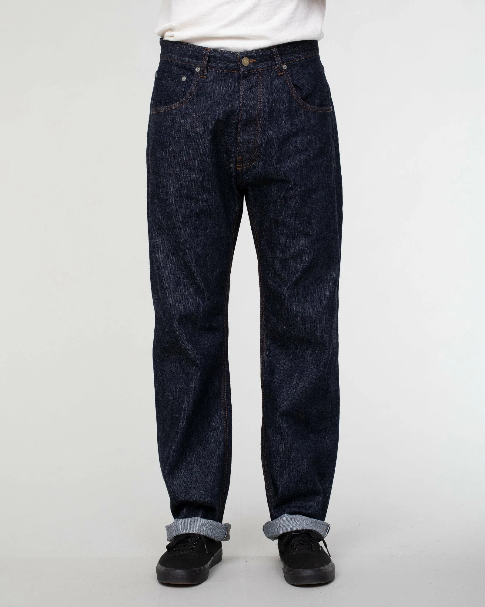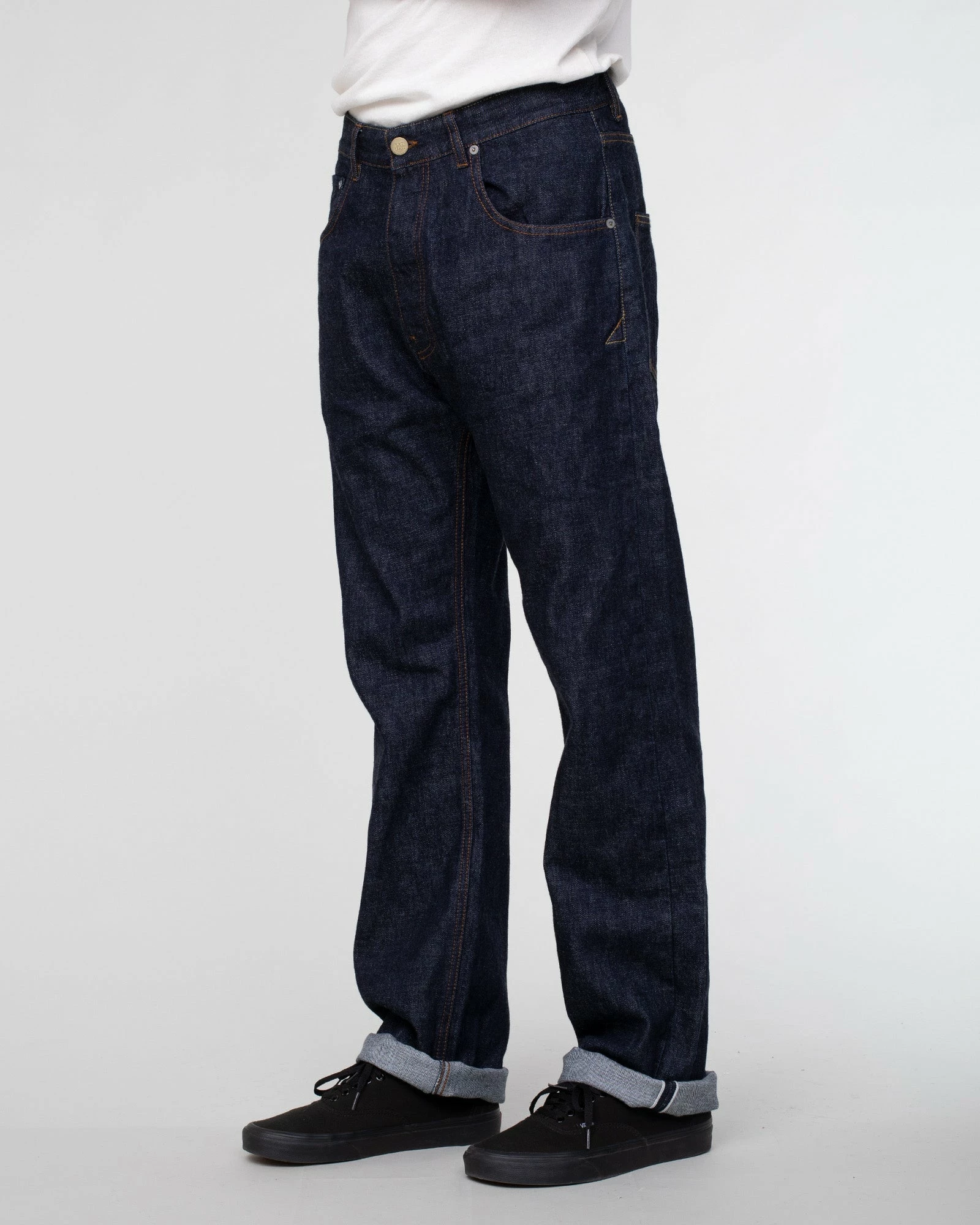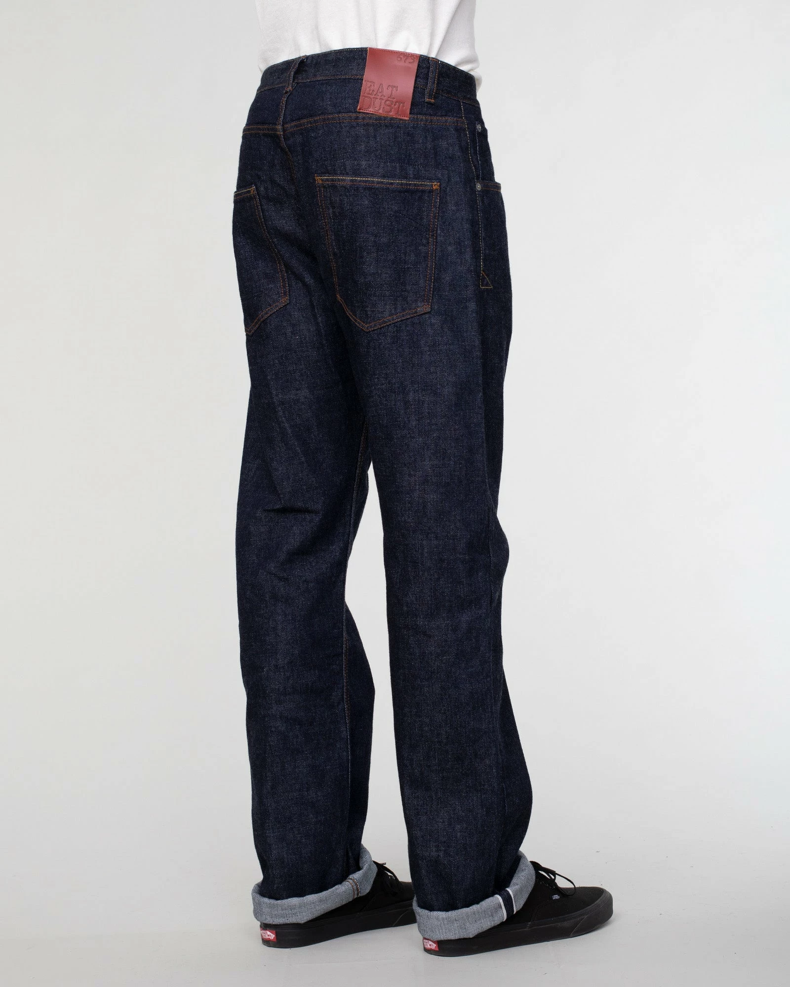 Excited to present our newest addition to the family: The 36 Fit. A loose, oversized pair of pants made from 14 Oz Japanese indigo denim, pink selvedge. Two reinforced back pockets with signature tonal Z-bar stitching. Finished with branded faded copper buttons & double prawn fly buttons, authentic rivets, leather Eat Dust label and a coin pocket with signature Z-bar stitching. Front pockets in heavy cotton as well.