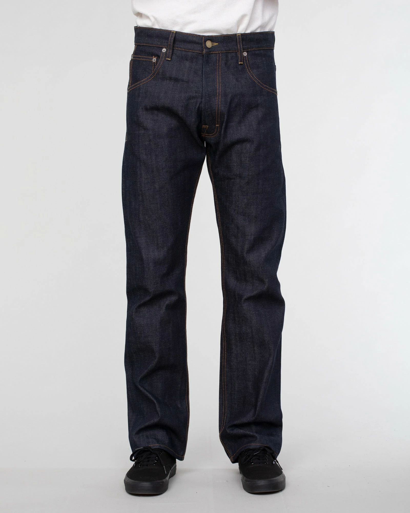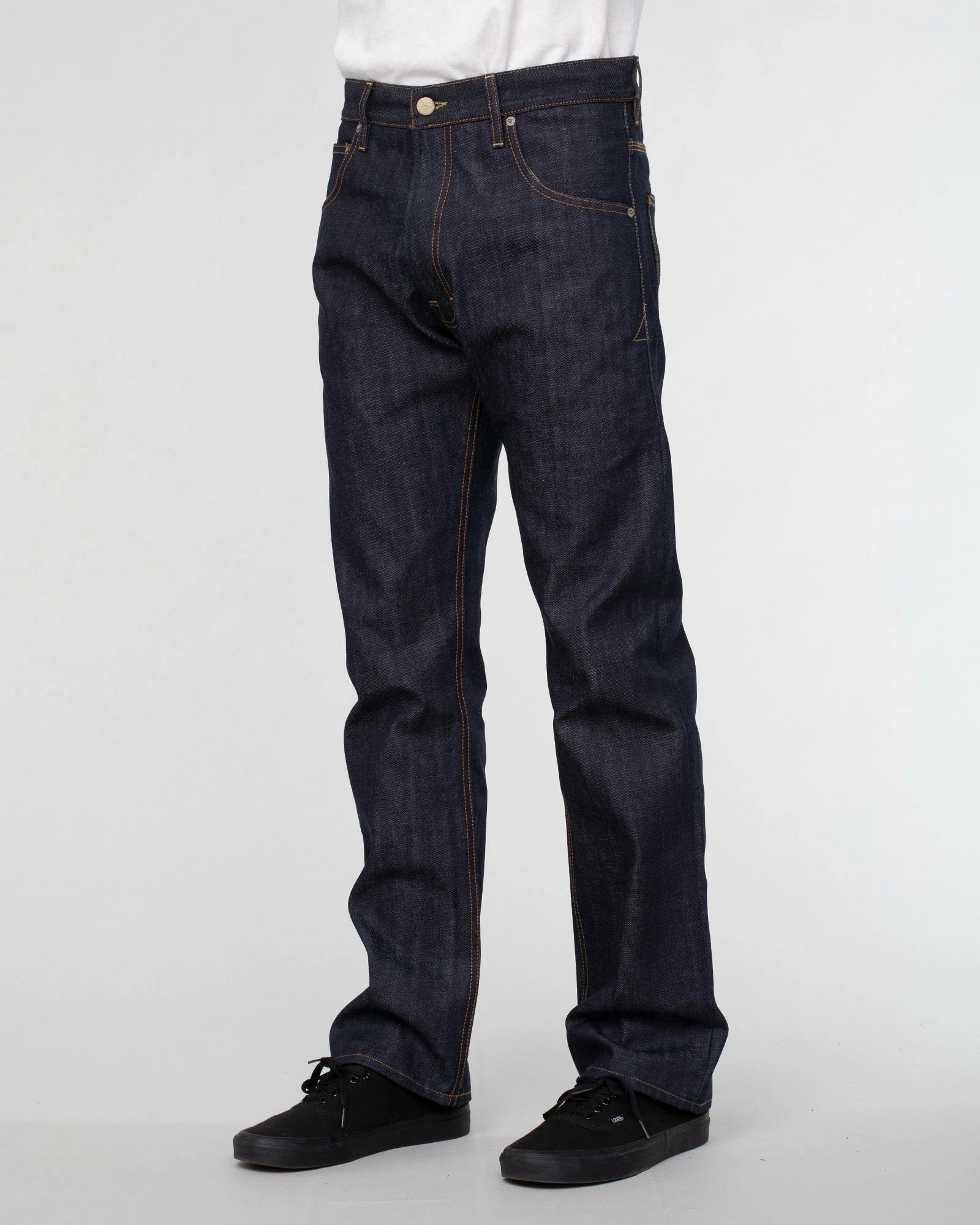 Meet The 67 Fit, a loose fitting pair of pants with straight legs. Made from 13 3/4 Oz double ring Japanese indigo blue selvedge denim. Finished with two reinforced back pockets with signature Z-bar stitching. Also features a faded copper Eat Dust button, double prawn fly buttons, authentic rivets & a leather Eat Dust label. Heavy cotton front pockets, plus coin pocket. For extra strength, we added triple stitching on the yoke and back rise.
