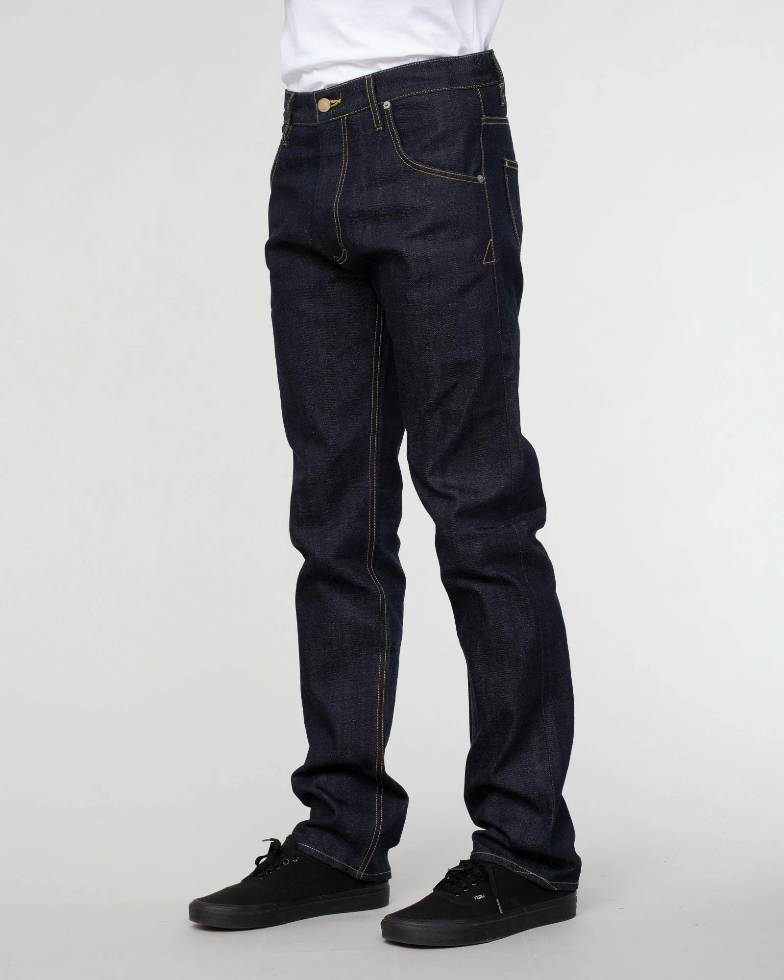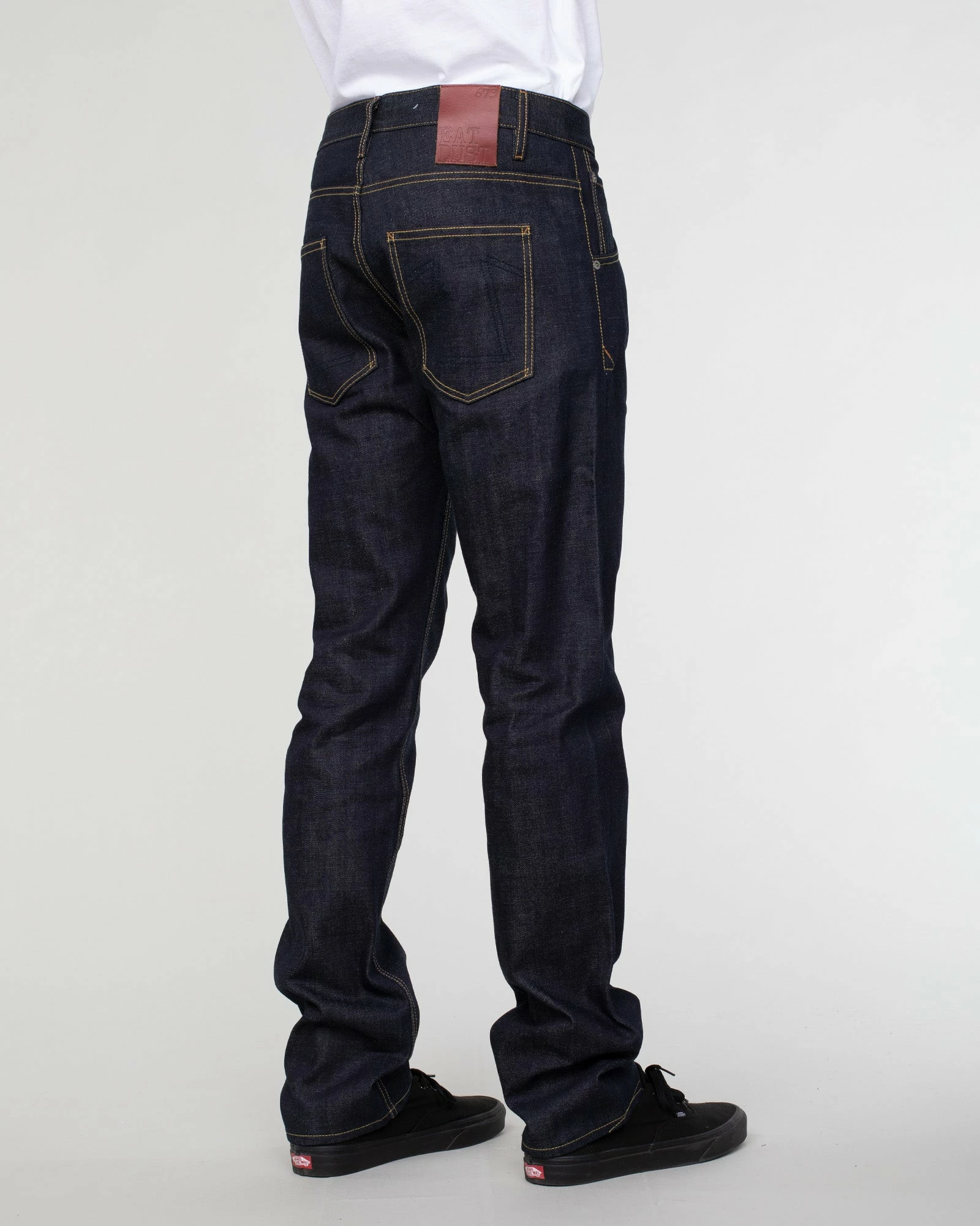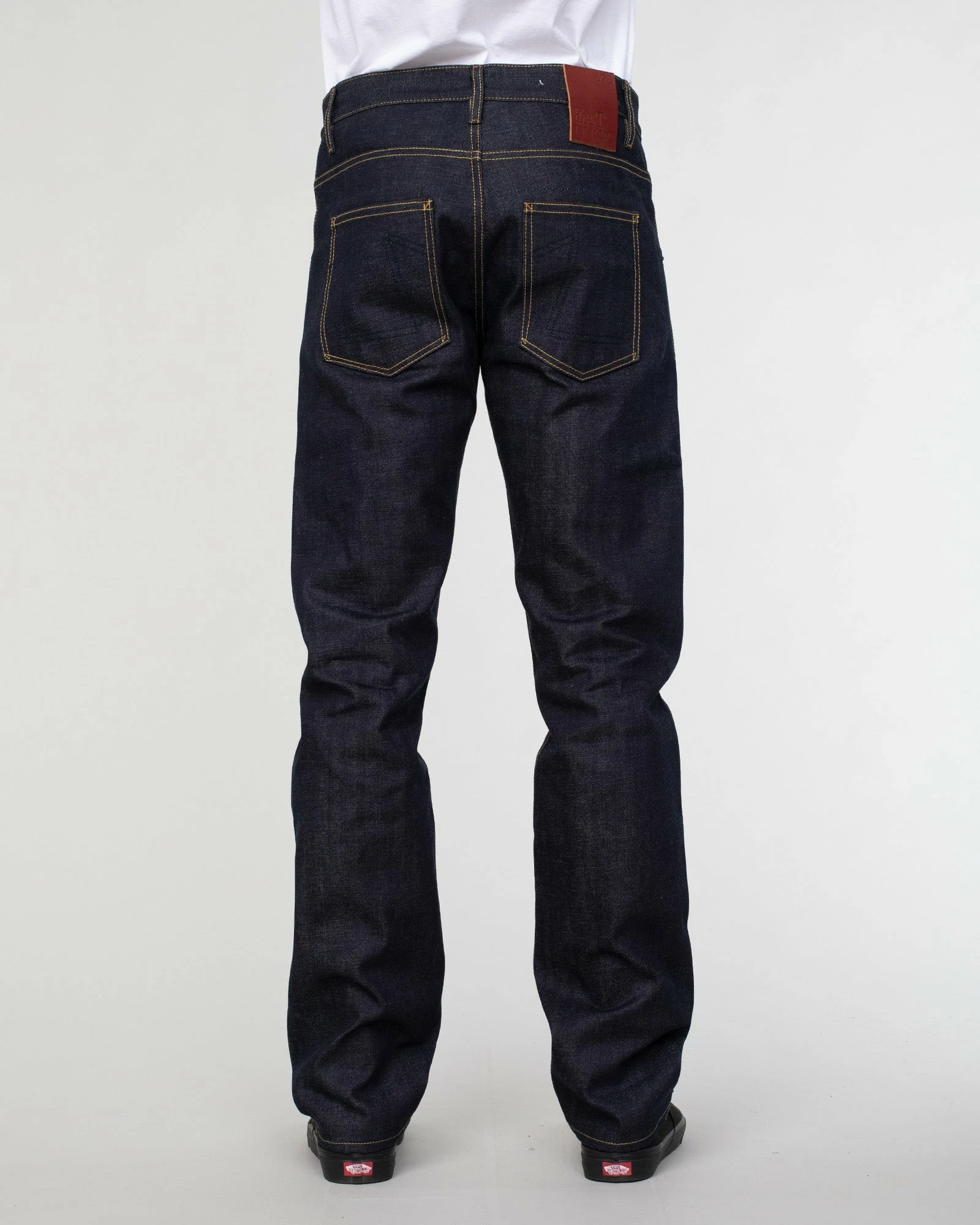 Our Fit 76 is a tried and tested classic, a key part of our collection. It’s a regular, somewhat slimmer fit with straight legs, in a 13 3/4 Oz double ring Japanese selvedge denim in indigo blue. Features 2 reinforced back pockets with signature tonal Z-bar stitching, faded copper Eat Dust button, double prawn fly buttons, authentic rivets & leather Eat Dust label on the back. Heavy cotton front pockets, plus an extra coin pocket with signature tonal Z-bar stitching.