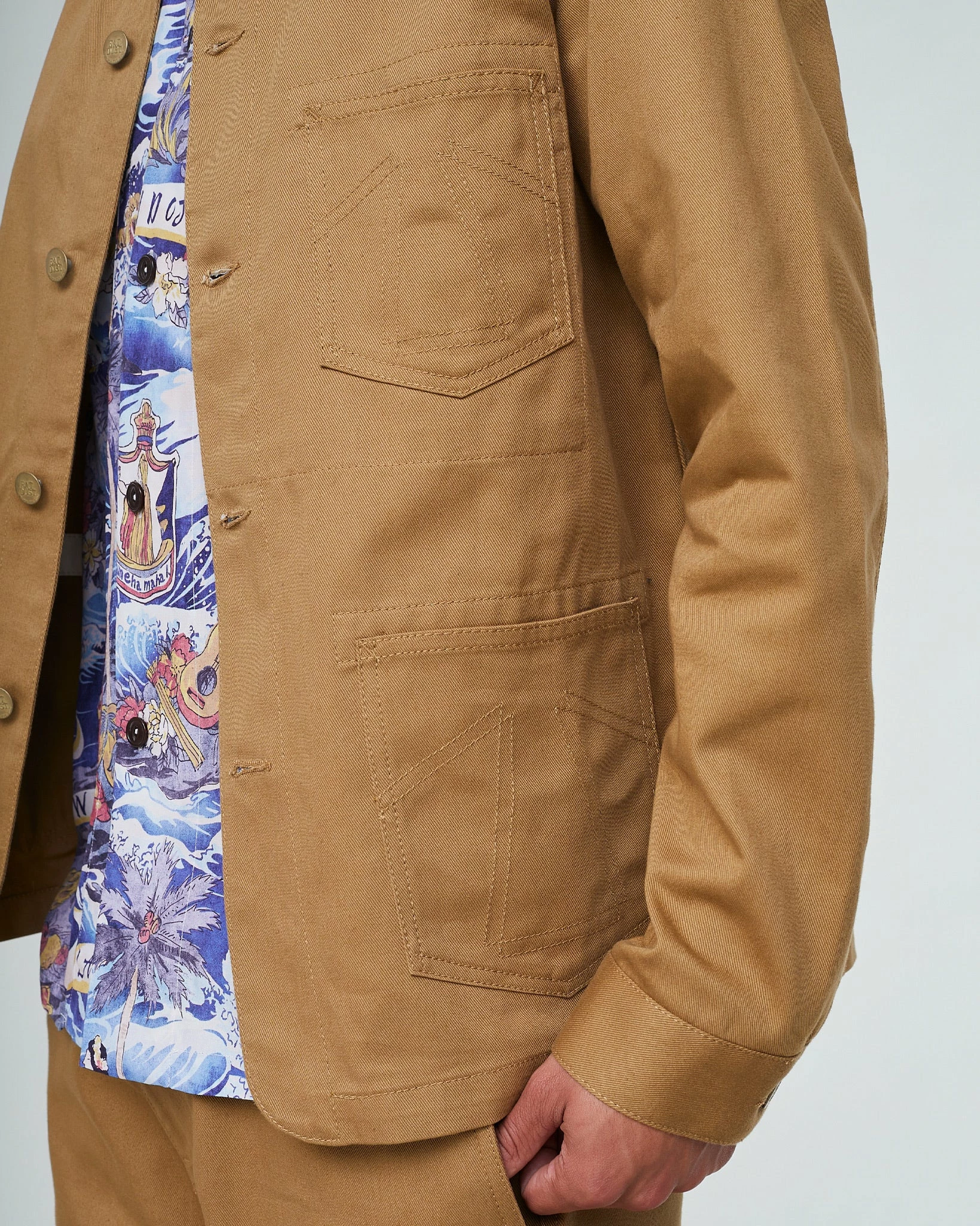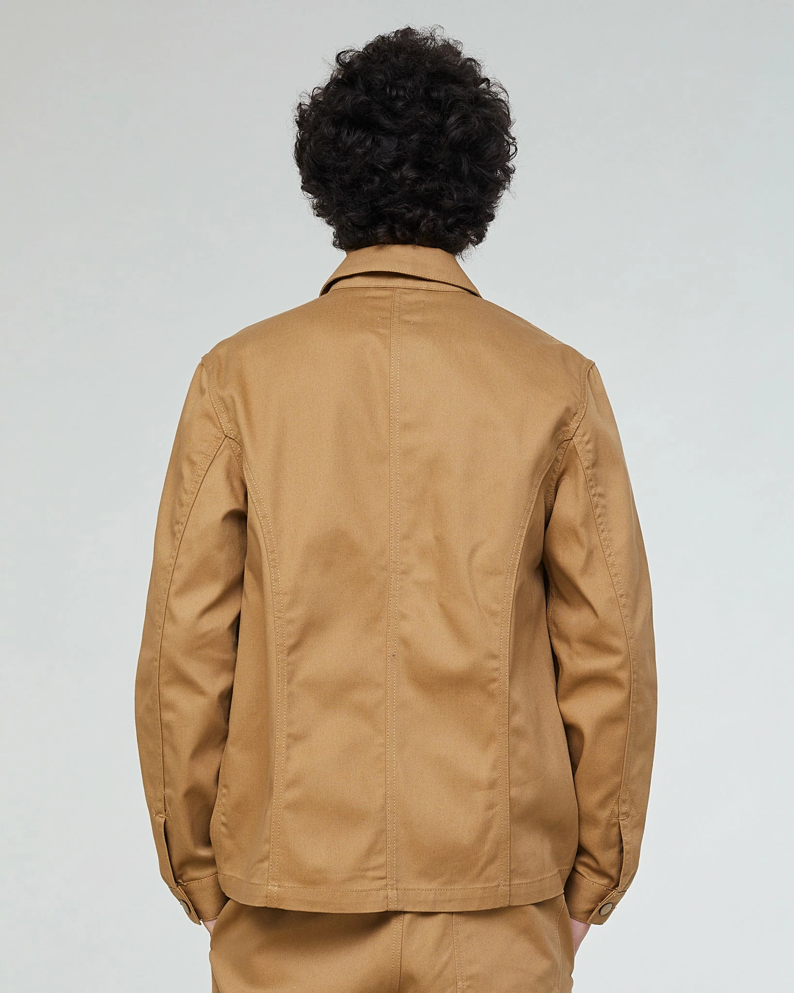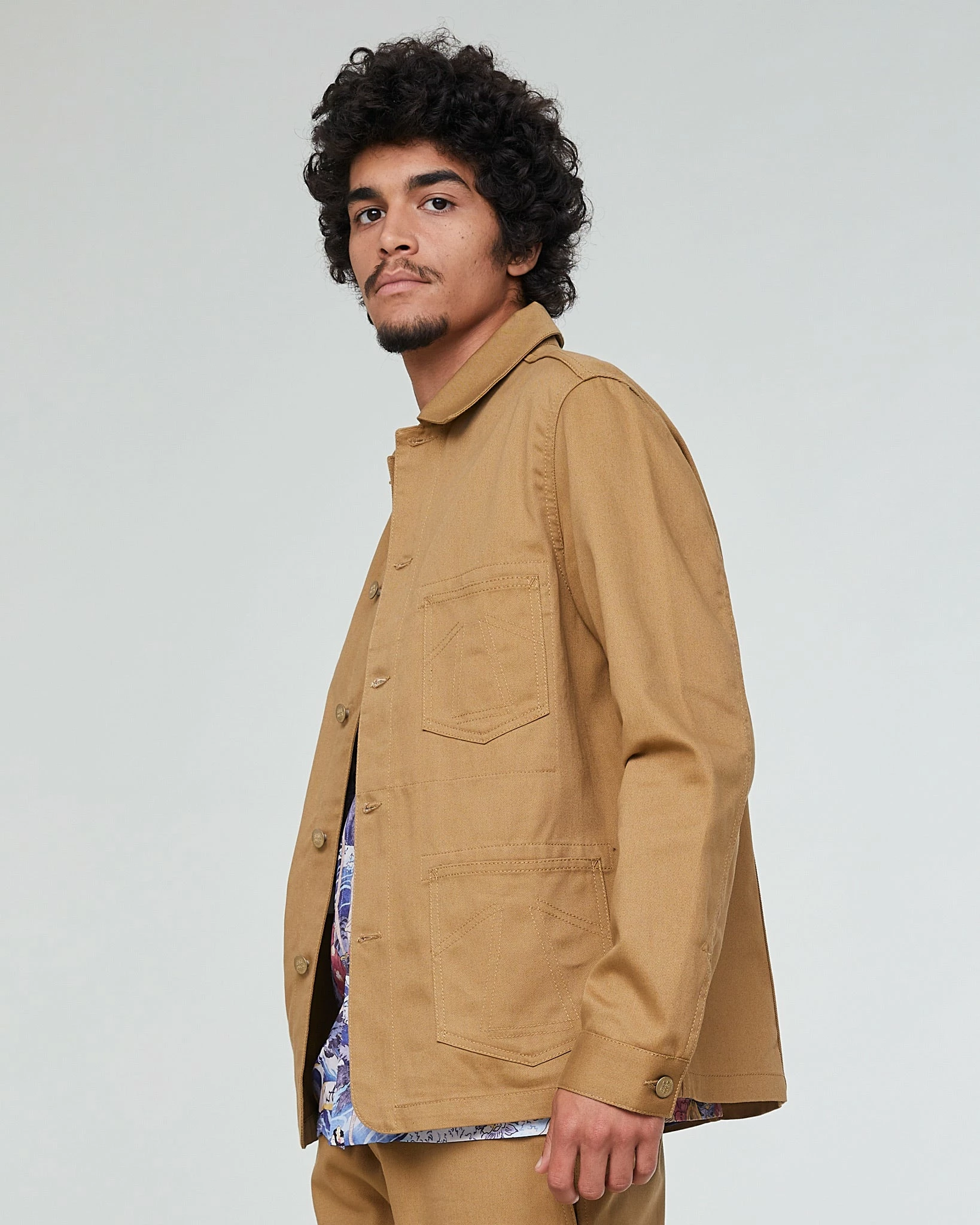 An updated version of our classic 673 Chore Jacket, made from a safari color utility cotton twill. Classic workwear, but with a contemporary twist. An easy, unfussed style that you can wear anytime. Regular fitting, with 2 front hip pockets and a chest pocket with tonal z-bar stitching.Â