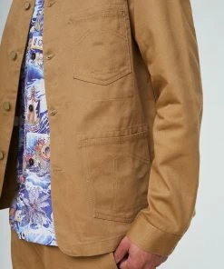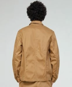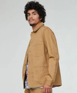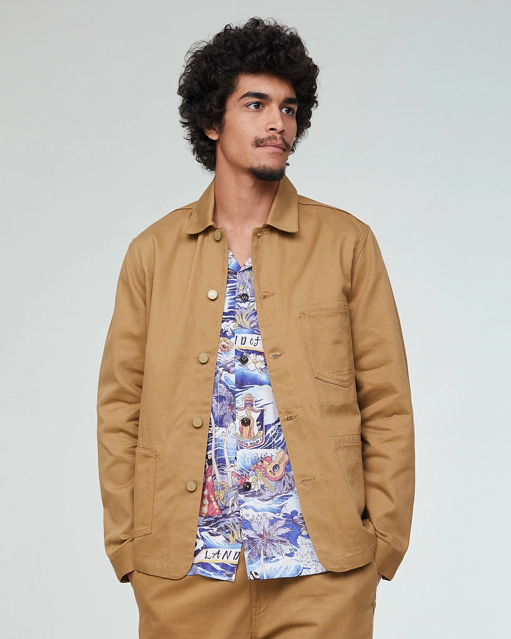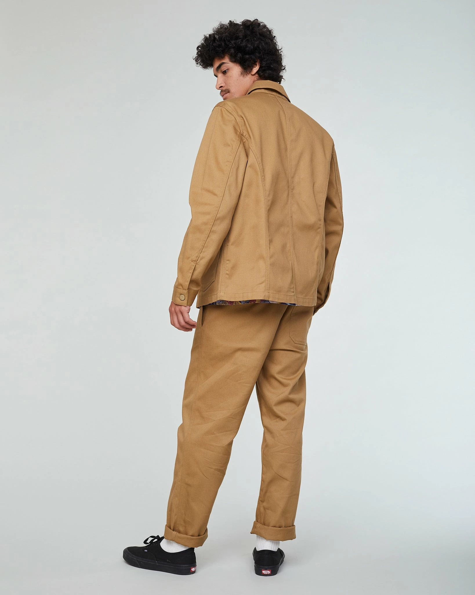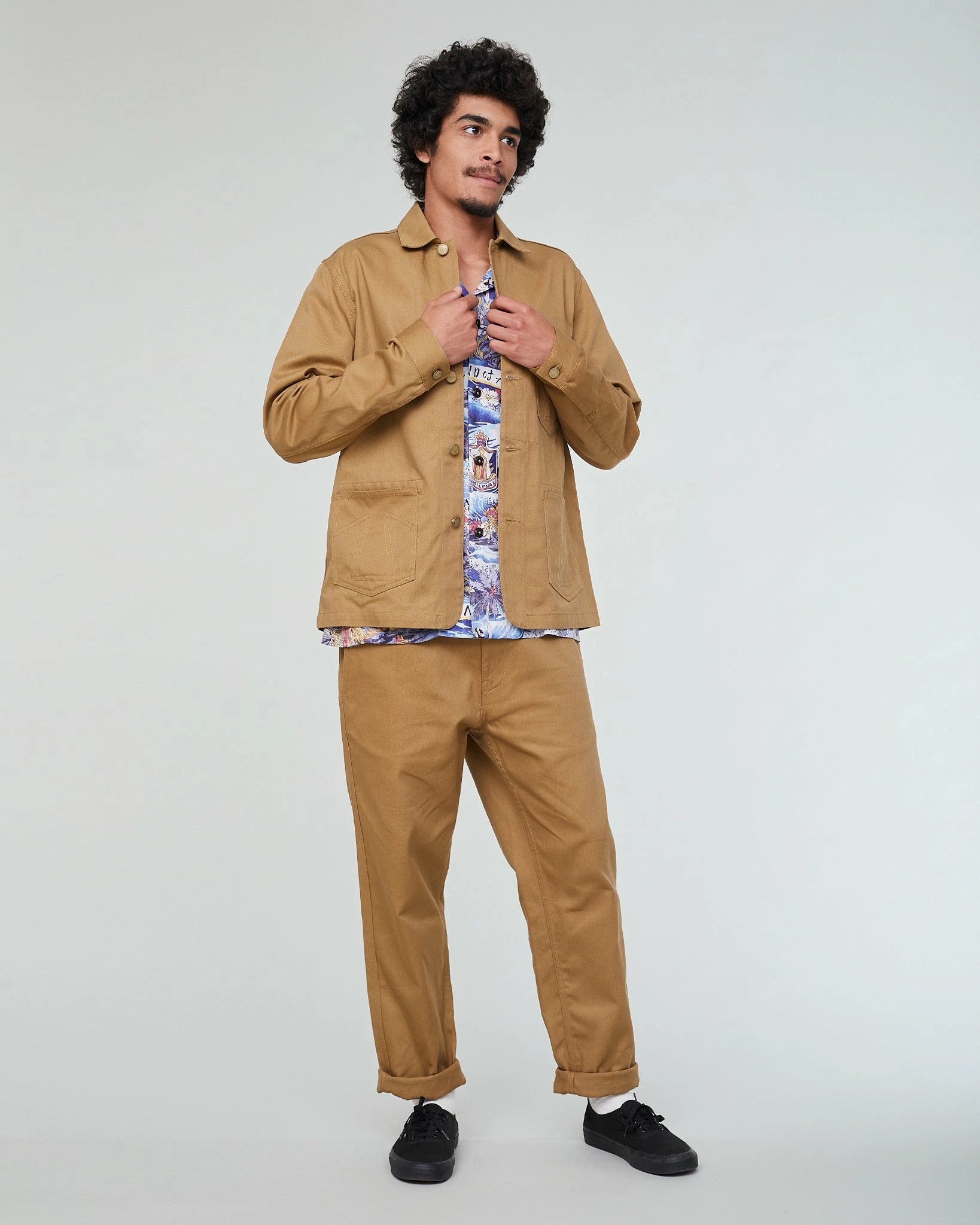 An updated version of our classic 673 Chore Jacket, made from a safari color utility cotton twill. Classic workwear, but with a contemporary twist. An easy, unfussed style that you can wear anytime. Regular fitting, with 2 front hip pockets and a chest pocket with tonal z-bar stitching.Â