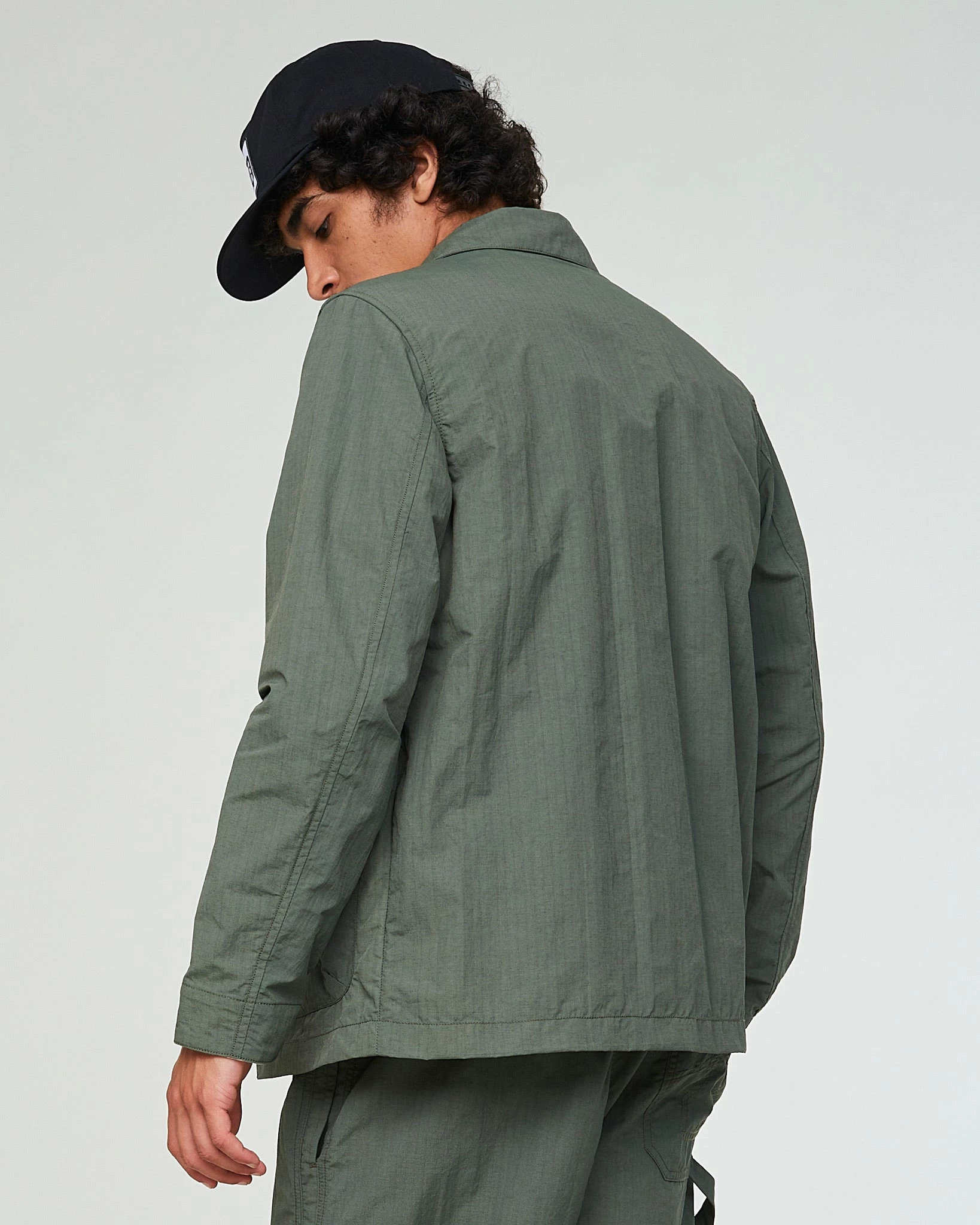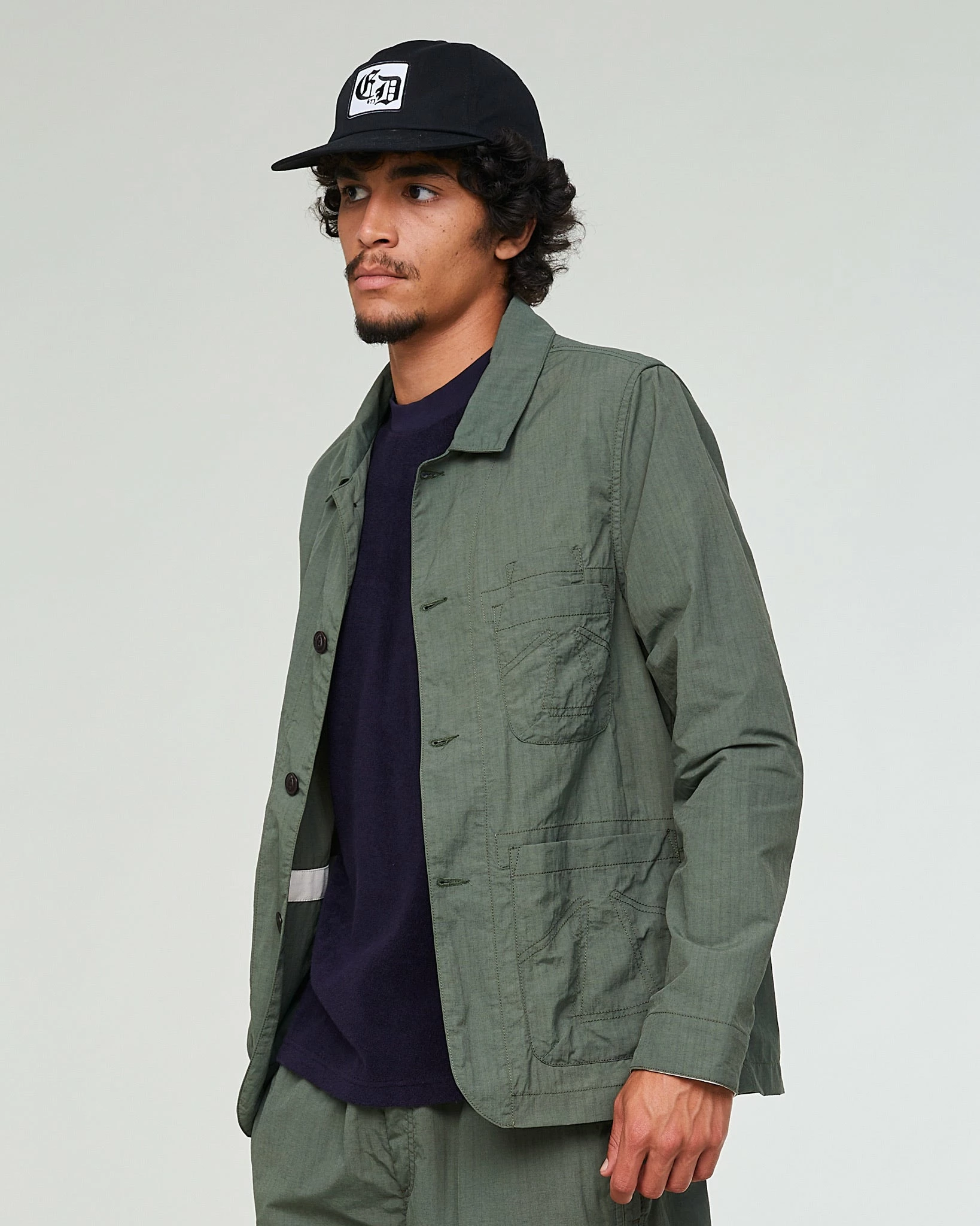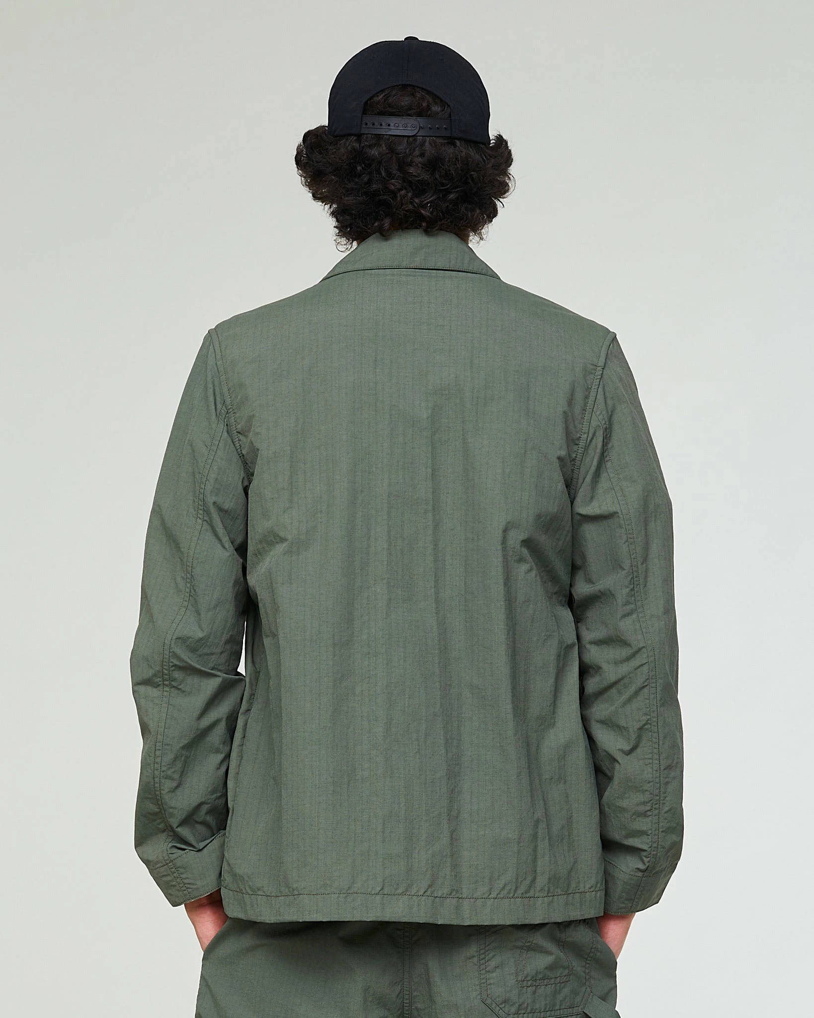 Our Combat Blazer is a loose fitting worker jacket, that can be worn as a blazer as well, as it’s cut on the same length. Made from a rip-stop nylon, featuring 2 large and reinforced hip pockets with tonal Z-bar stitching, and a double chest pocket. All finished with signature Eat Dust corozo buttons.Â