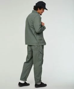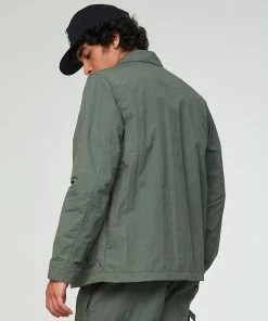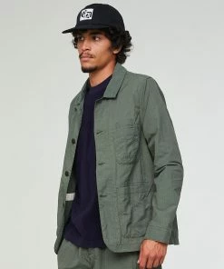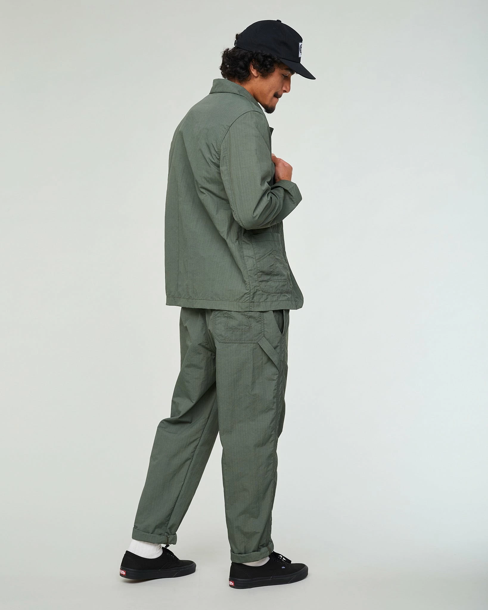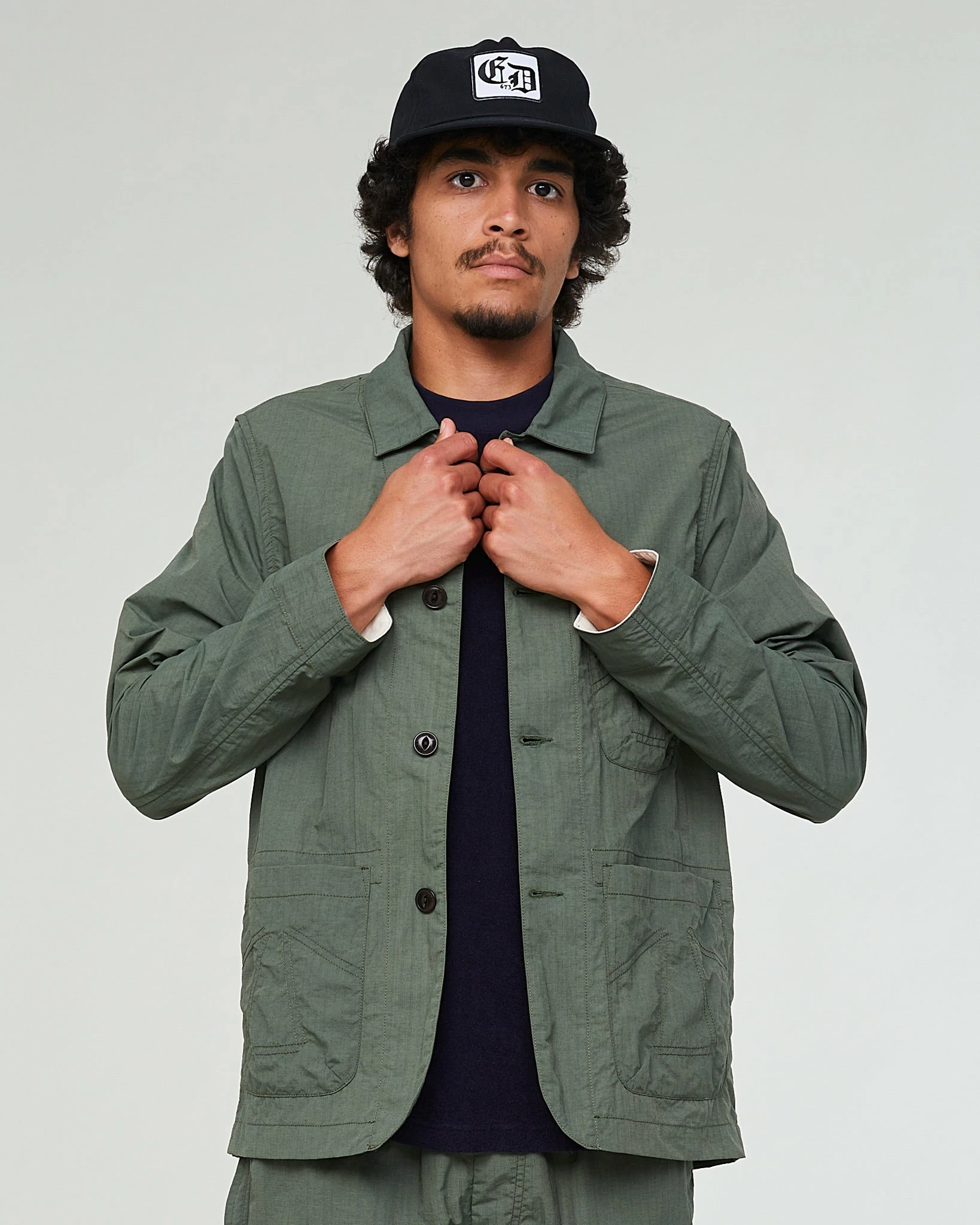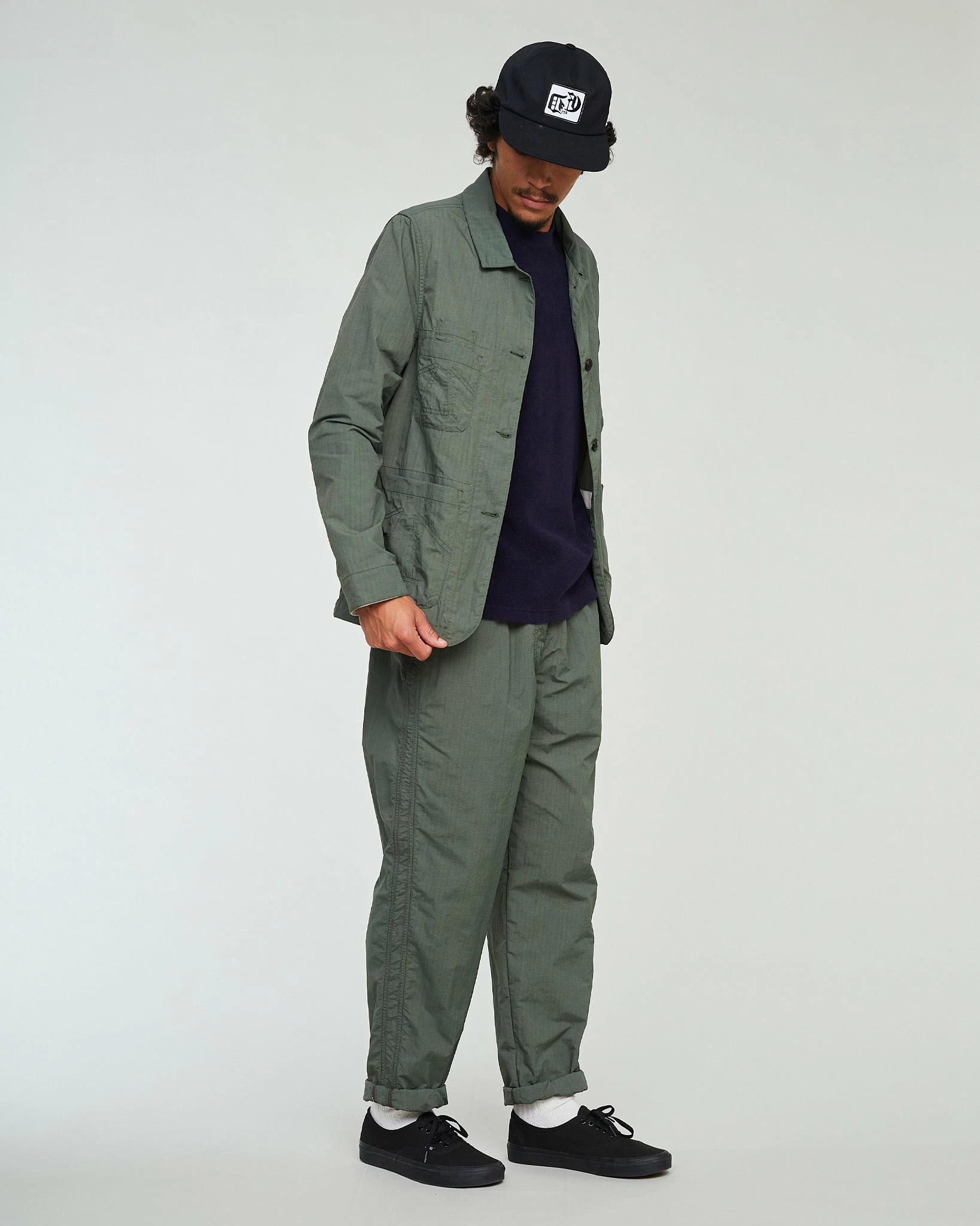 Our Combat Blazer is a loose fitting worker jacket, that can be worn as a blazer as well, as it’s cut on the same length. Made from a rip-stop nylon, featuring 2 large and reinforced hip pockets with tonal Z-bar stitching, and a double chest pocket. All finished with signature Eat Dust corozo buttons.Â