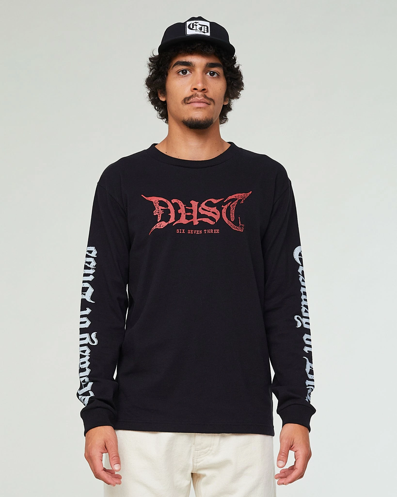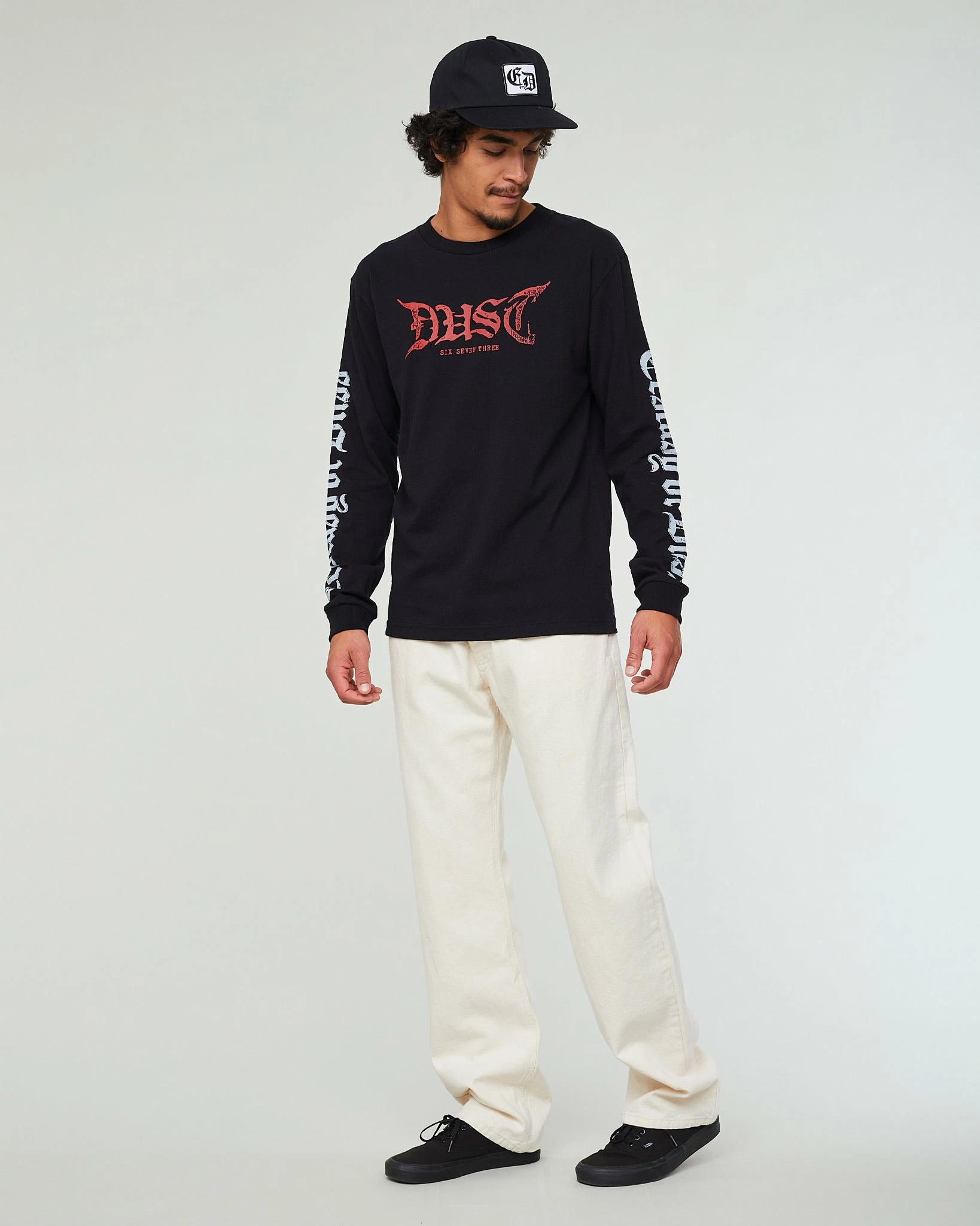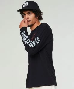 Classic black longsleeve t-shirt, with prints on both sleeves as well. Regular, easy fit. Made from a premium open end jersey cotton fabric.