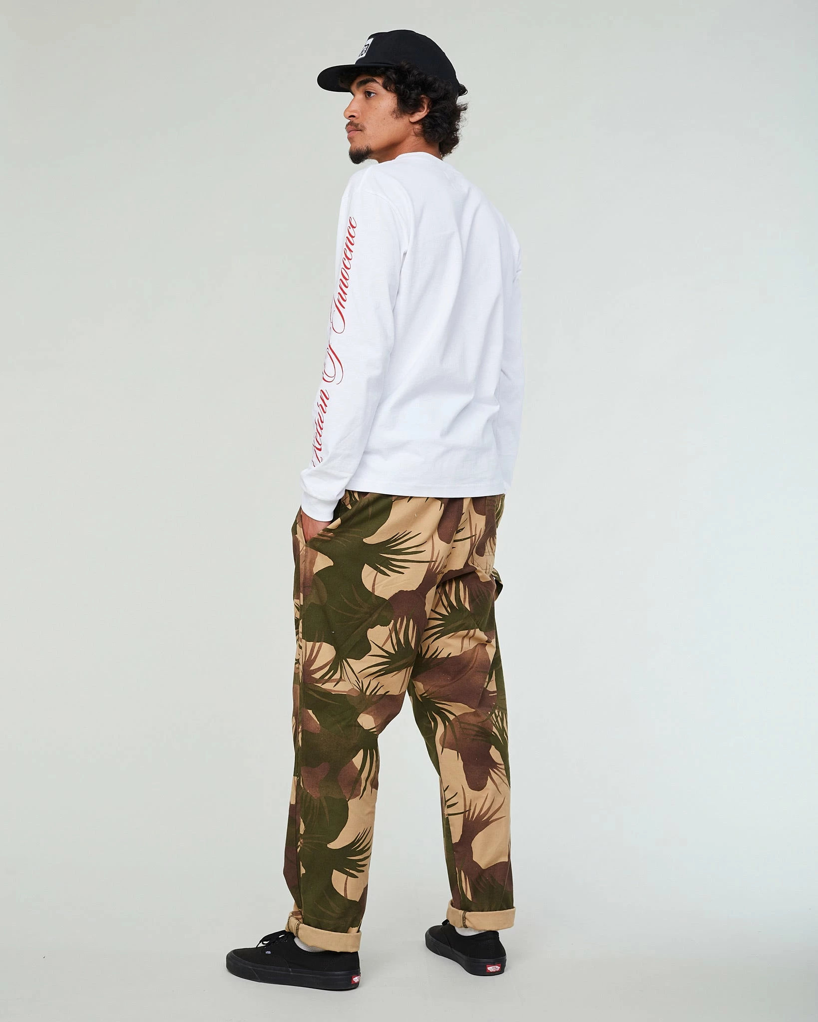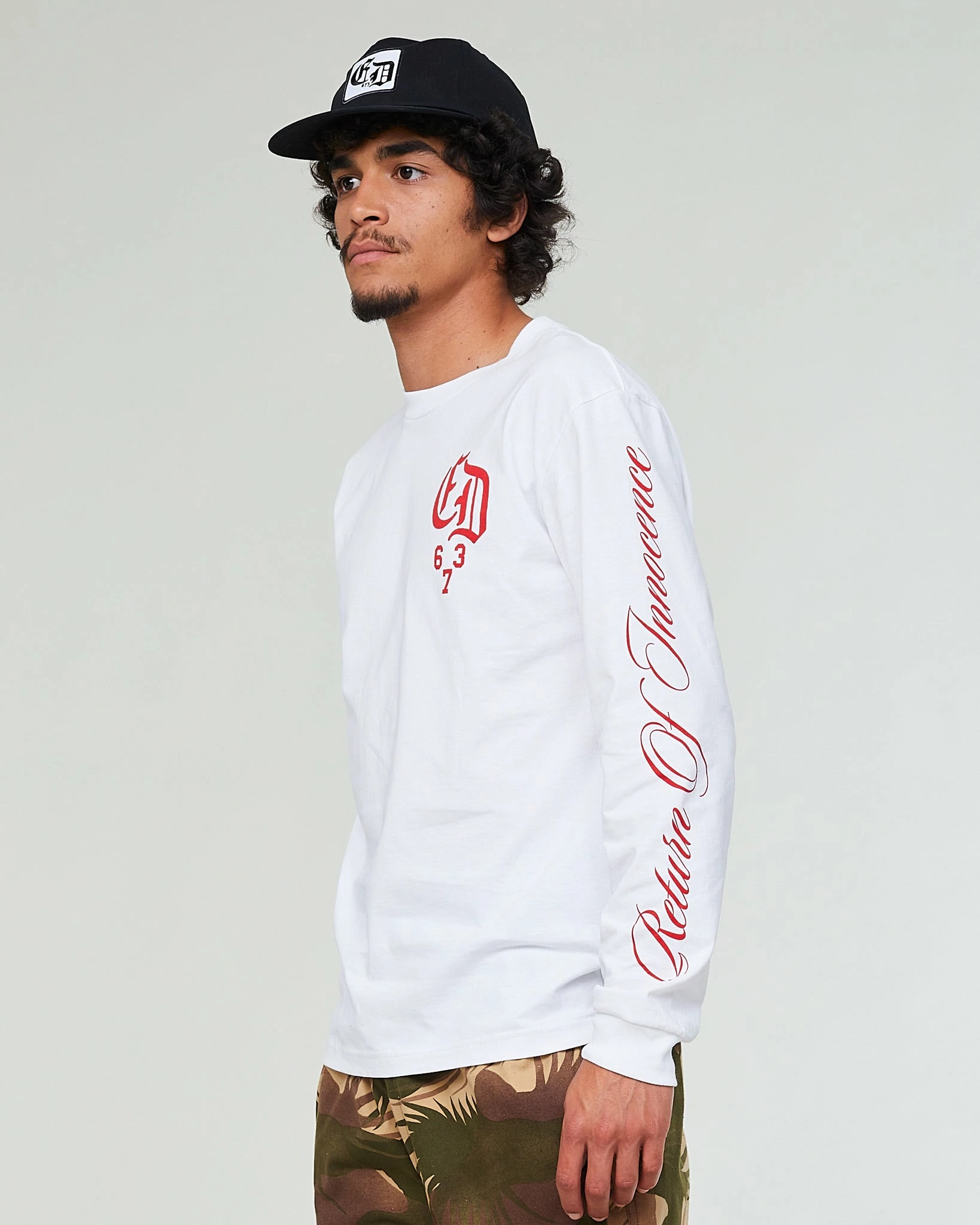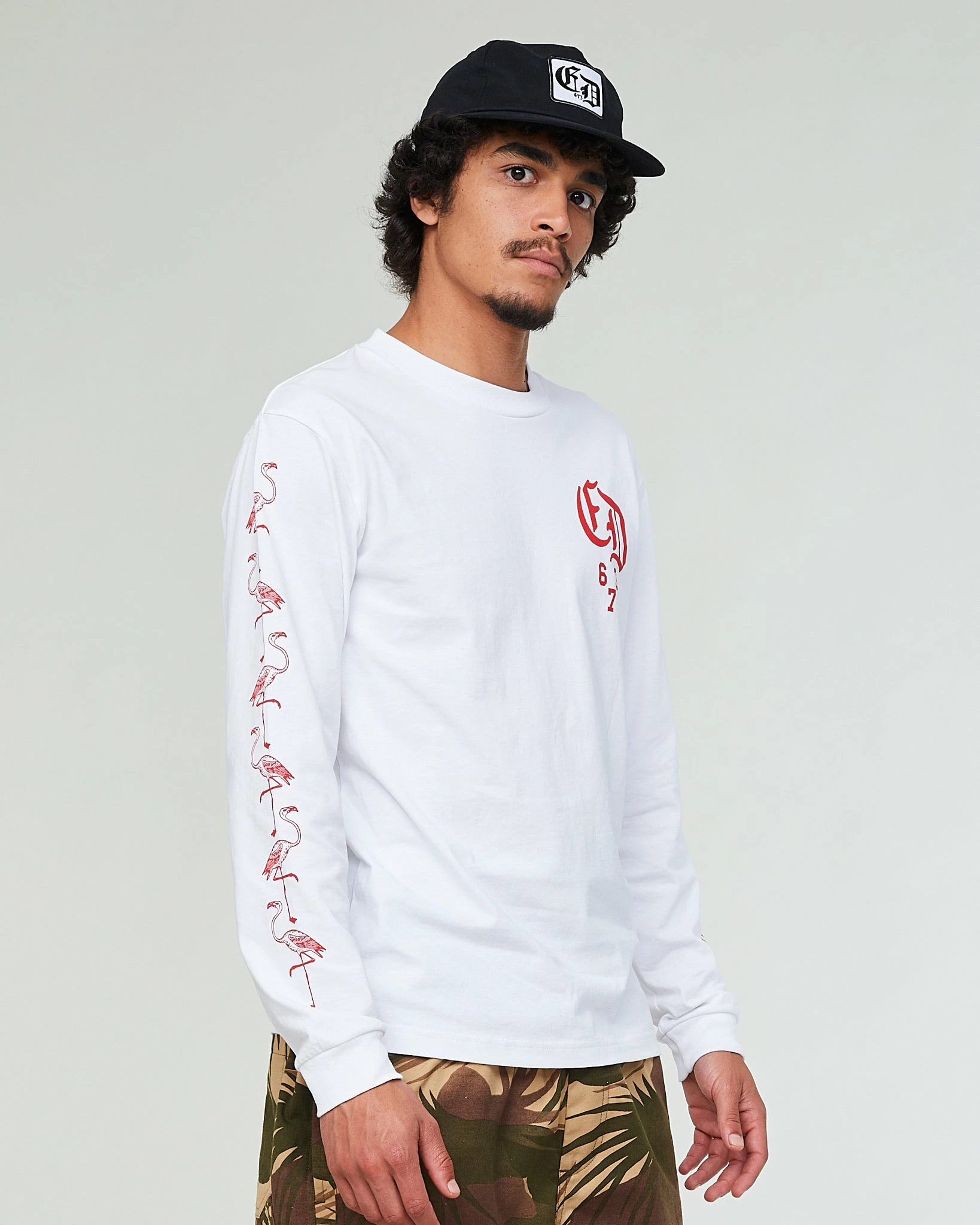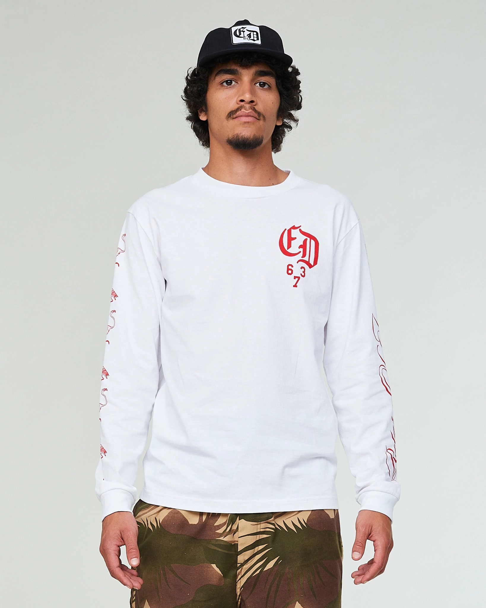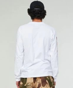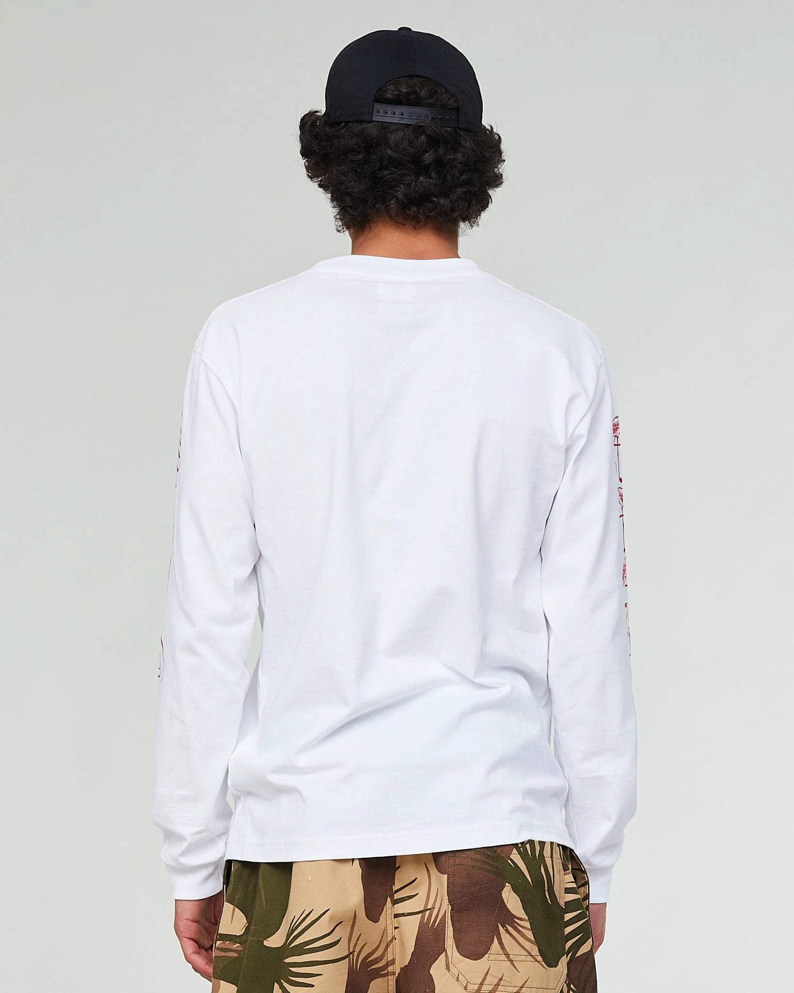 Classic white longsleeve t-shirt, with prints on both sleeves as well. Regular, easy fit. Made from a premium open end jersey cotton fabric.