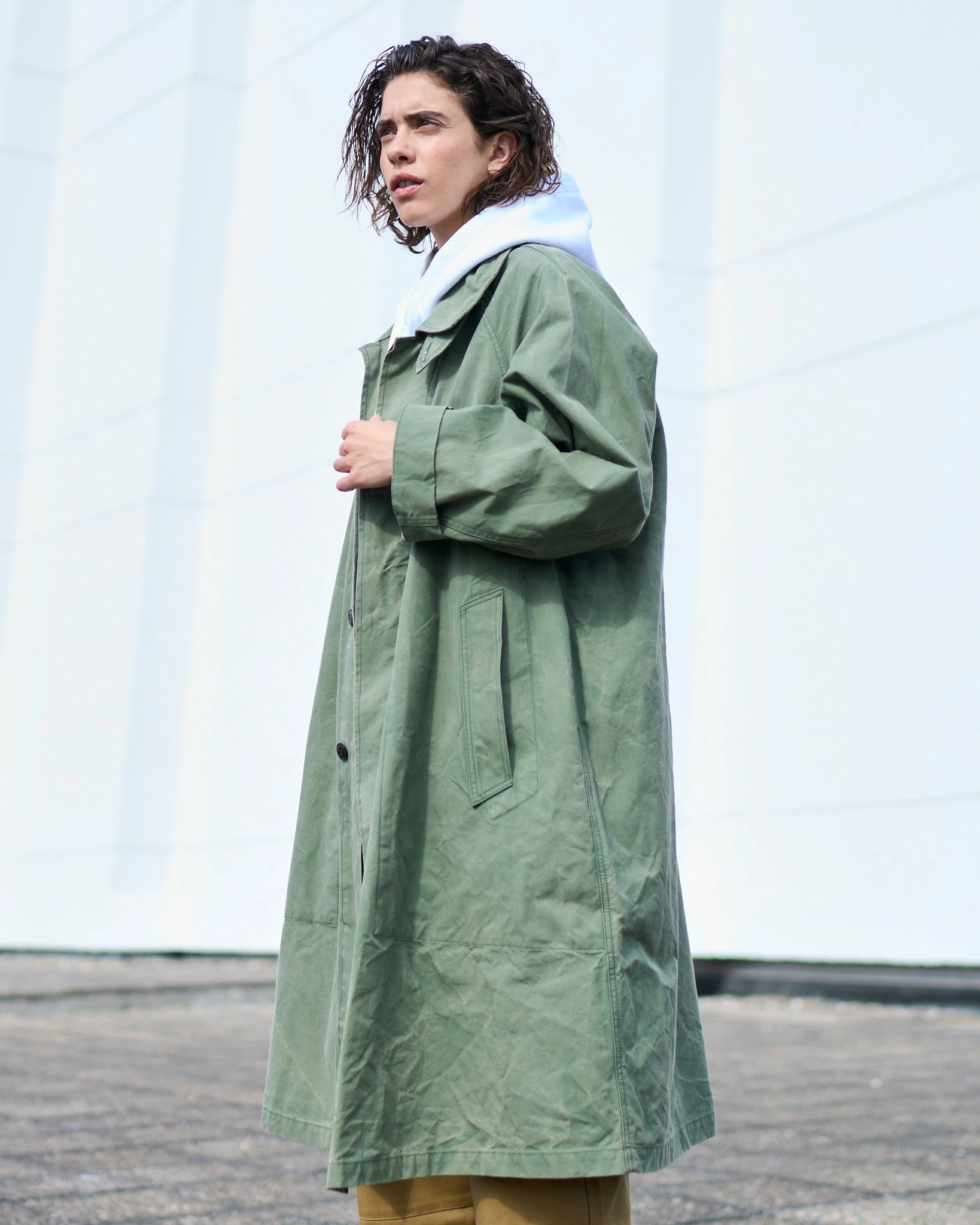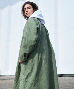 This oversized, knee-length trench offers all the comfort, protection and functionality one needs, plus a style that is unique and lively. Made from a premium waxed British cotton, sourced from Halley Stevensons, washed to obtain a unique, vintage look.