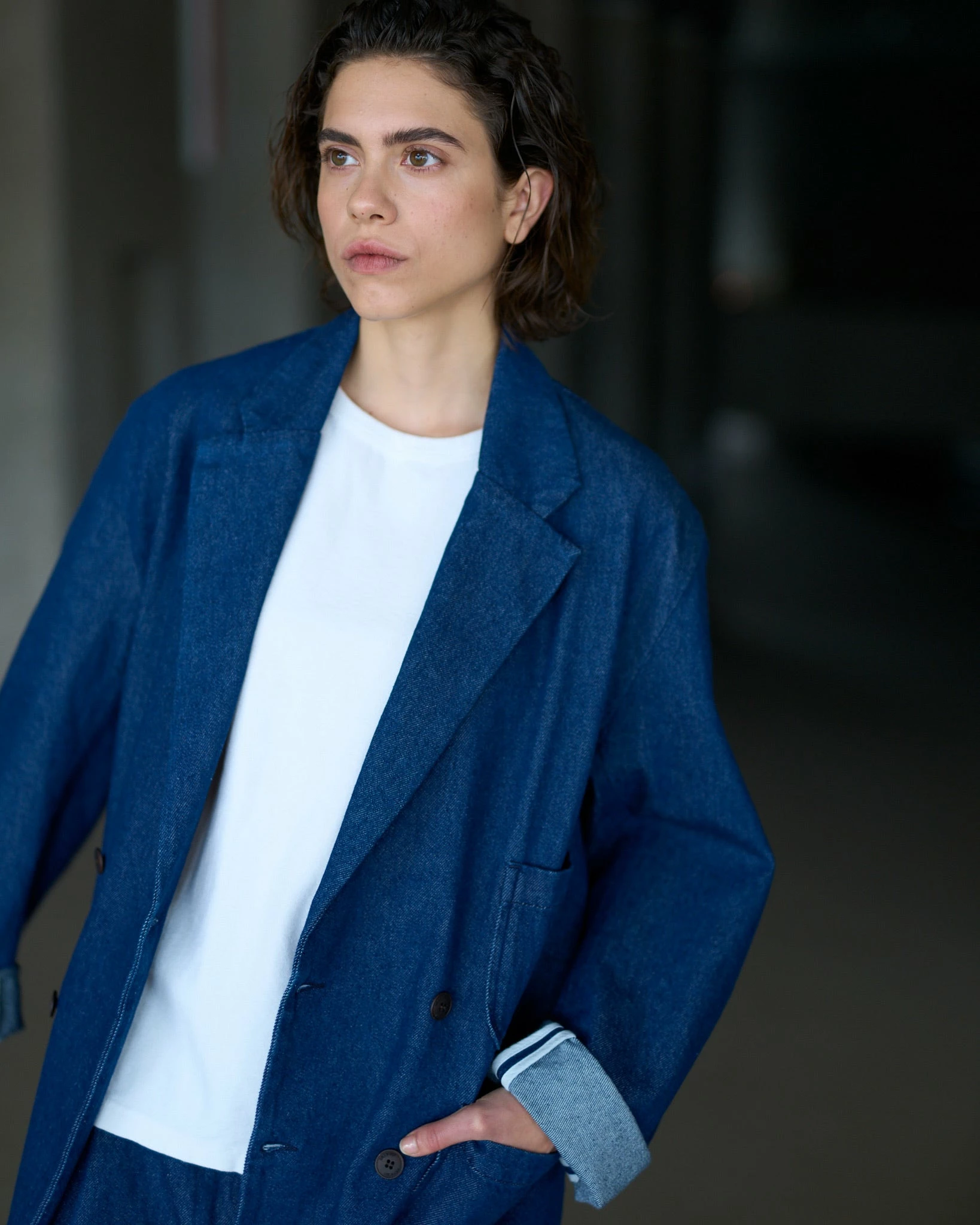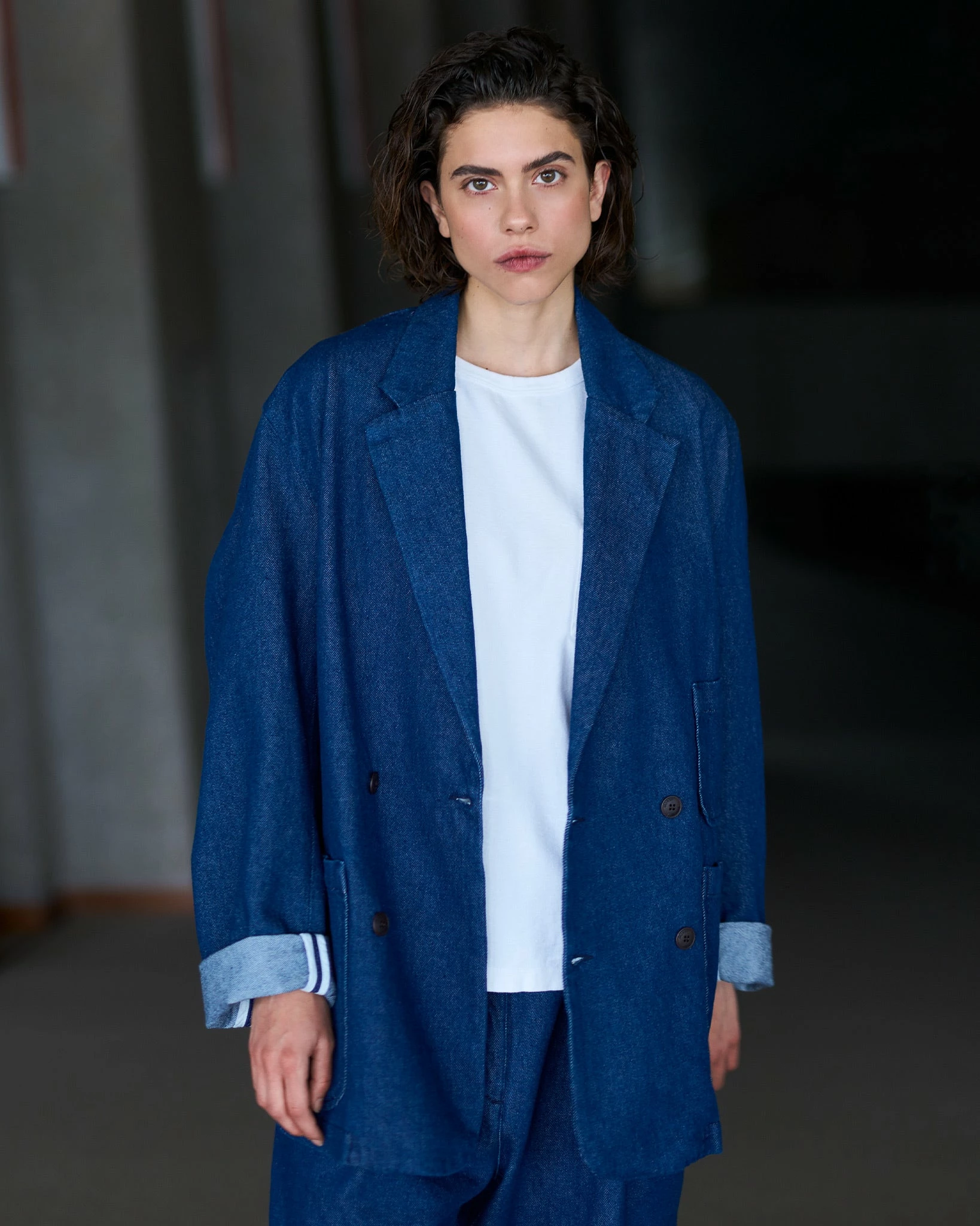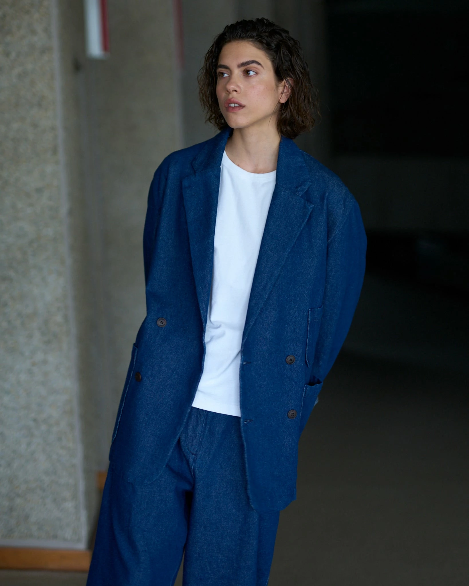 A relaxed fitting blazer with soft shoulders and big lapels. The loose fit and ample pockets bring in a bit of a workwear vibe, as well as the recycled denim fabric. Wear these with the British Worker pants in the same fabric for that total look.