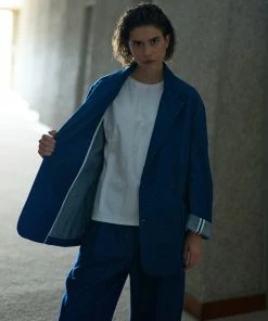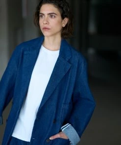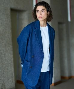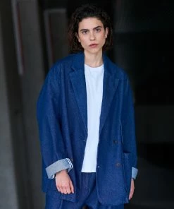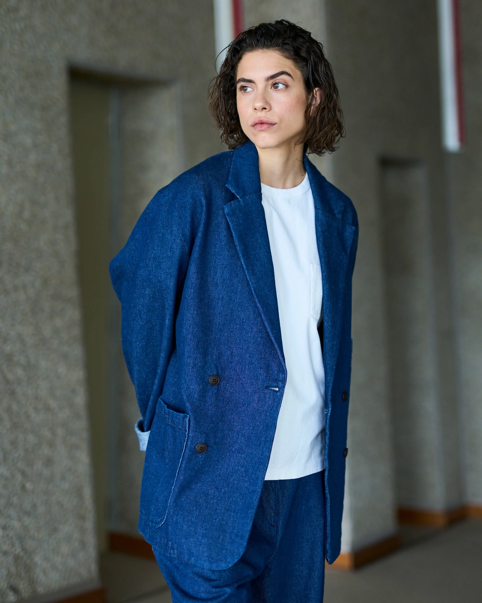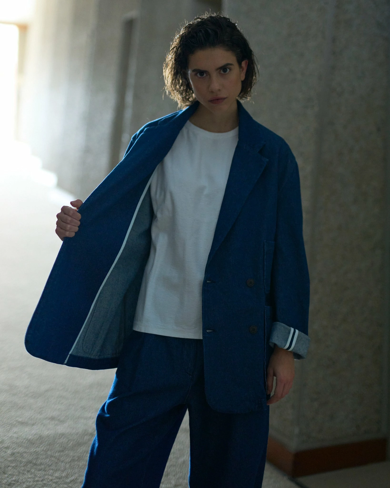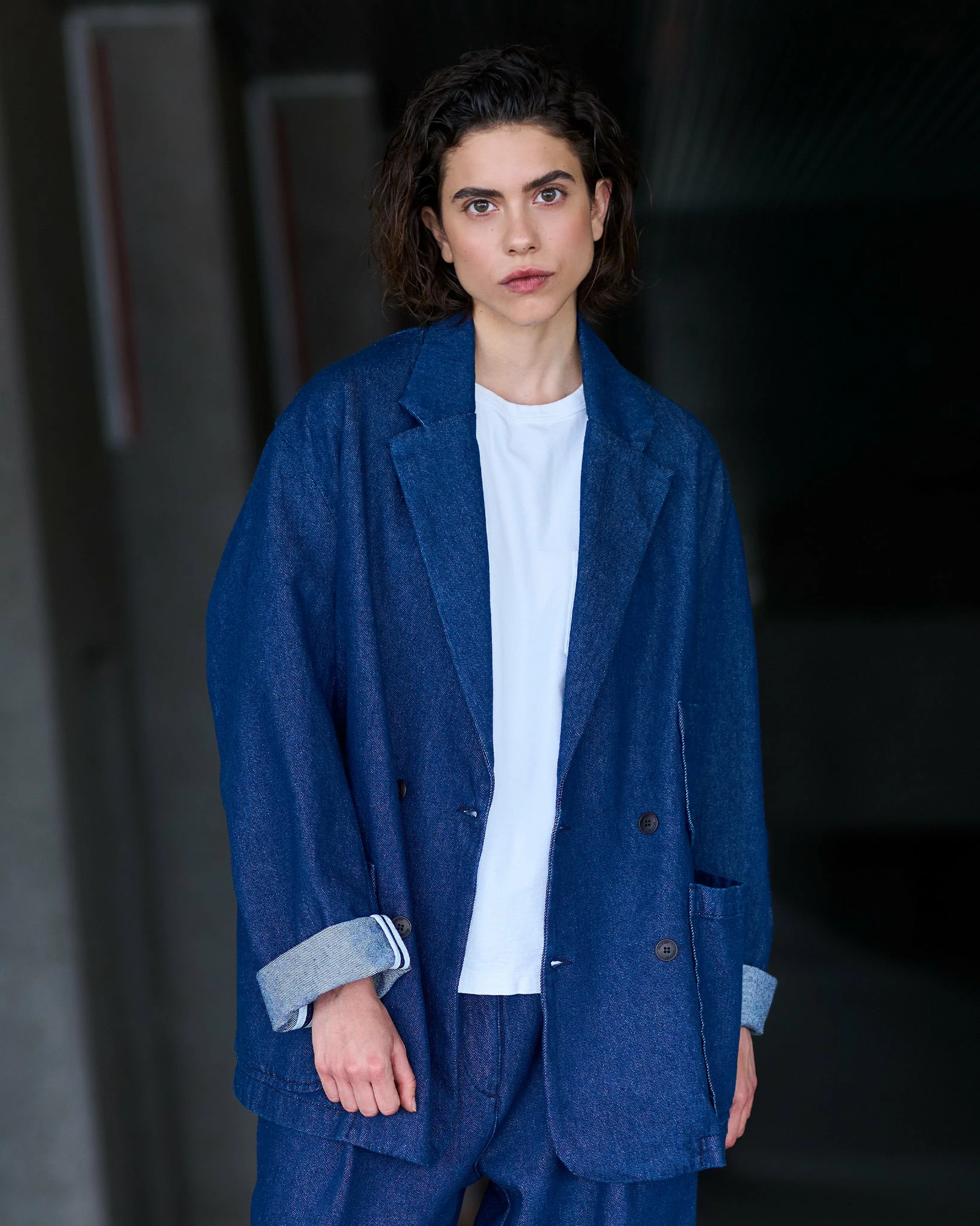 A relaxed fitting blazer with soft shoulders and big lapels. The loose fit and ample pockets bring in a bit of a workwear vibe, as well as the recycled denim fabric. Wear these with the British Worker pants in the same fabric for that total look.