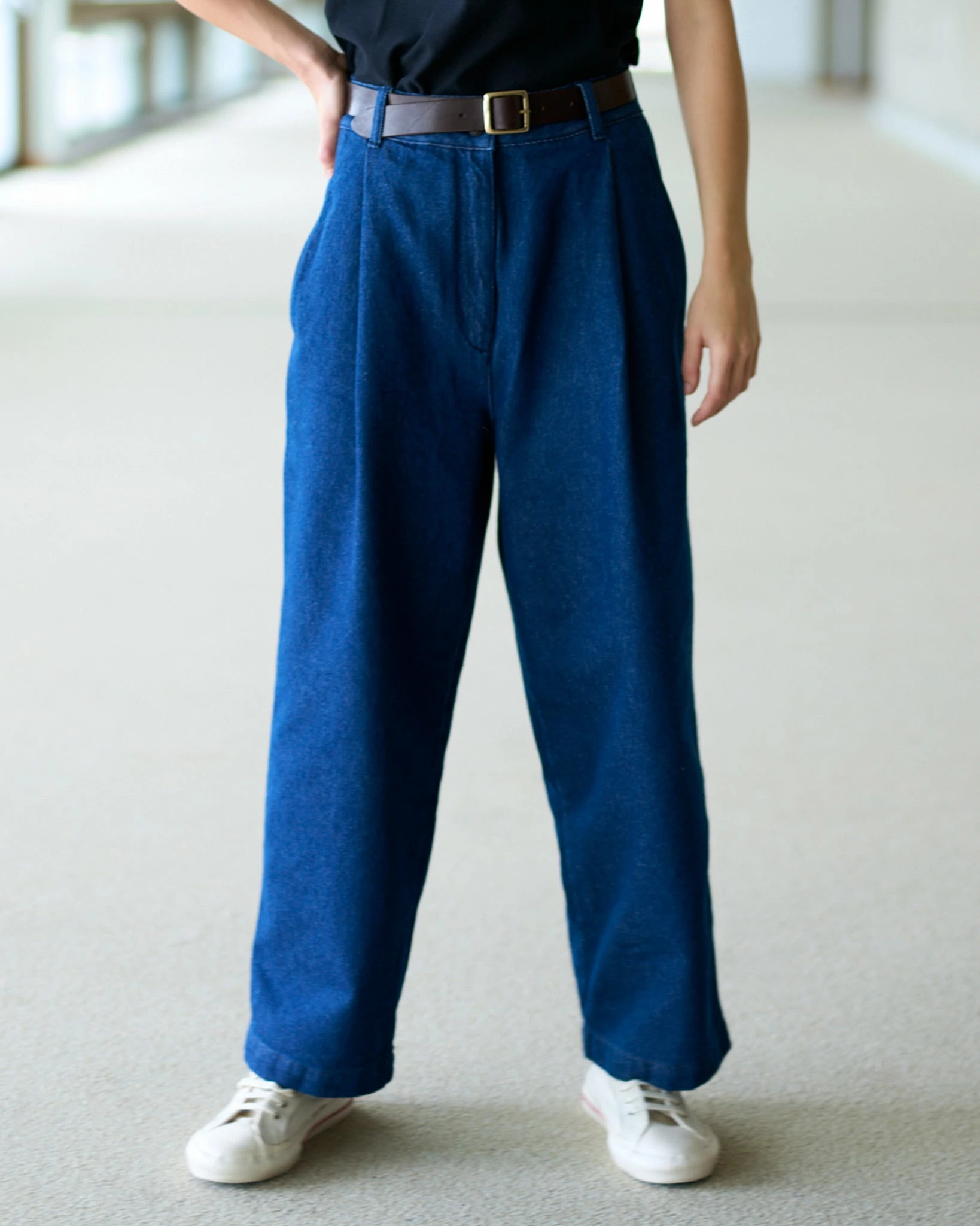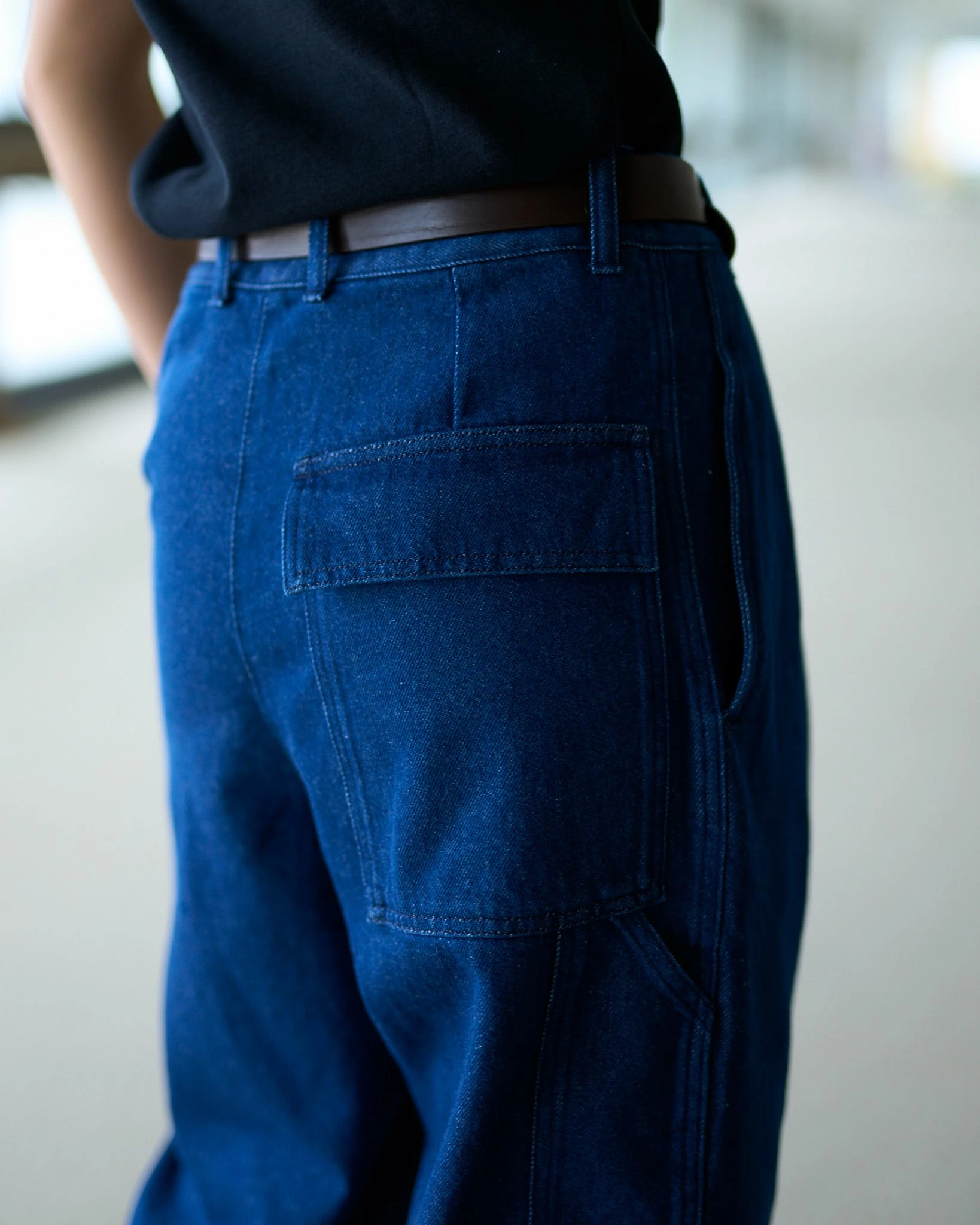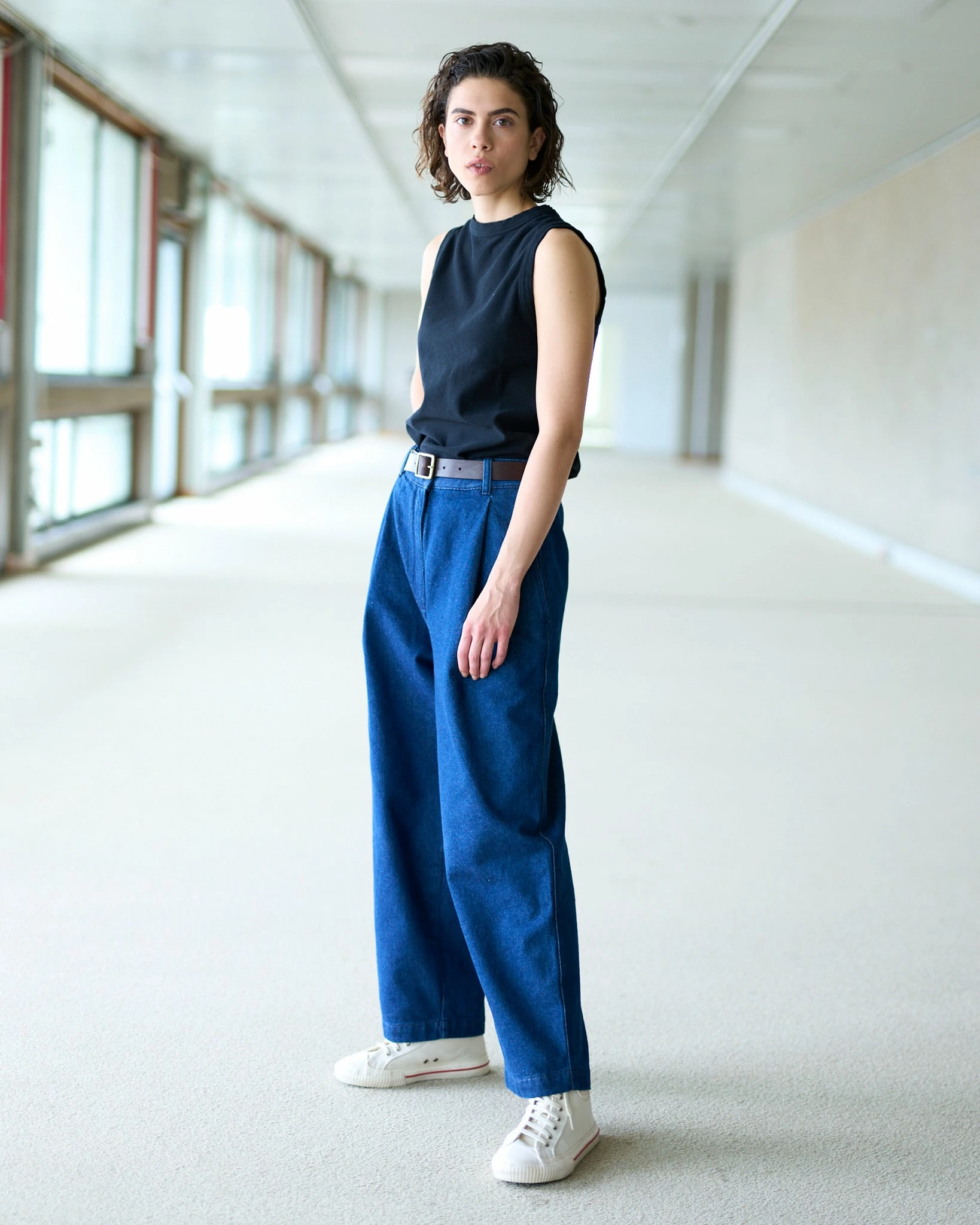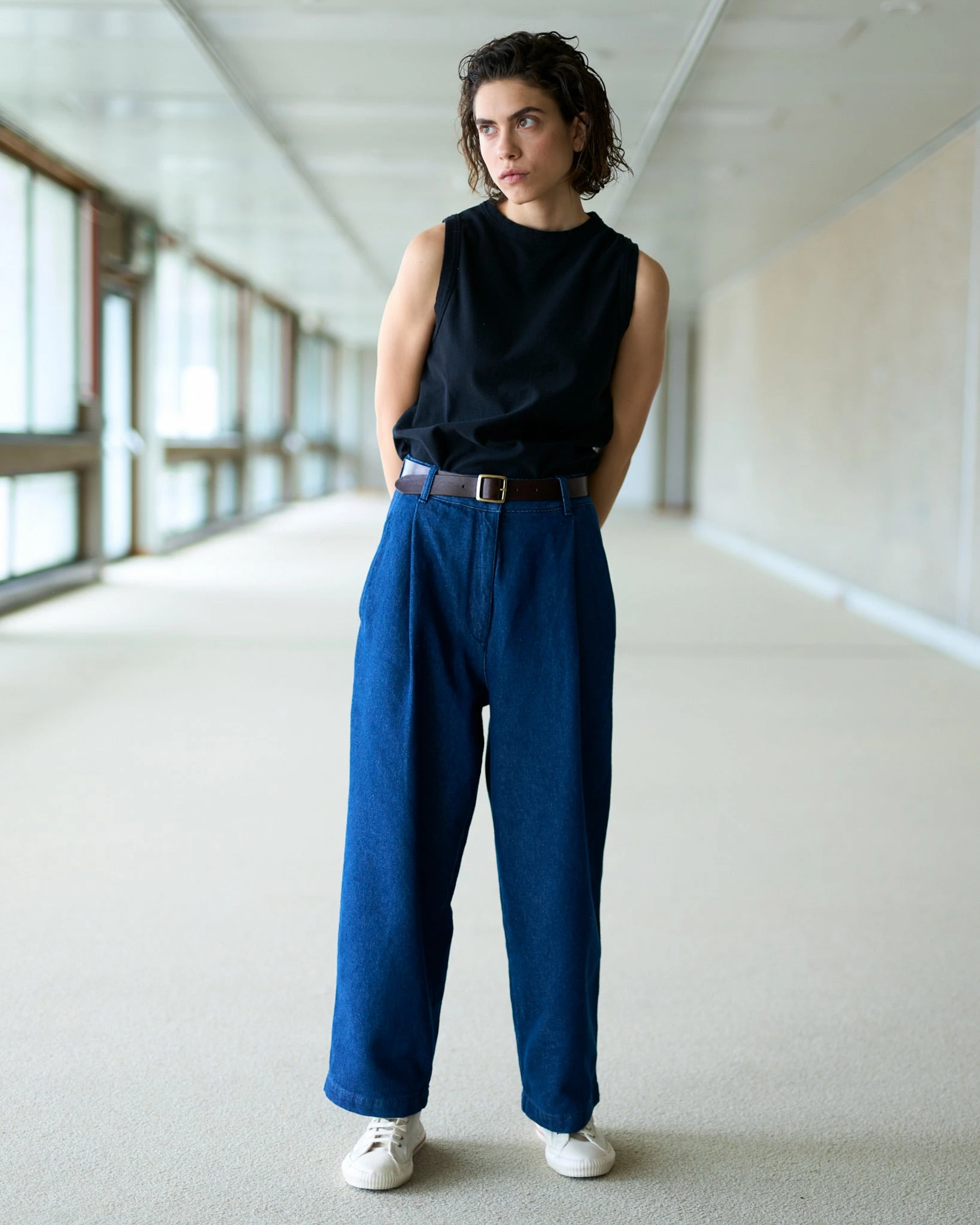 The British Worker is the absolute best seller among our women’s pants and we can see why. It combines a contemporary street style with a rugged worker edge. High on the waist, pleated legs, with a singe flap pocket on the back. Legs are loose and rounded, tapering towards the ankles. This one has a softer, washed blue tone that takes it back to the 1970s, kind of.