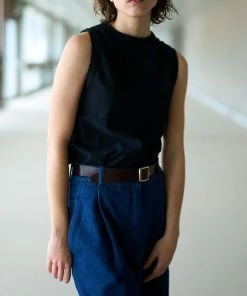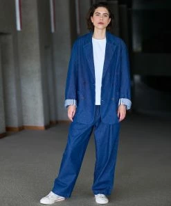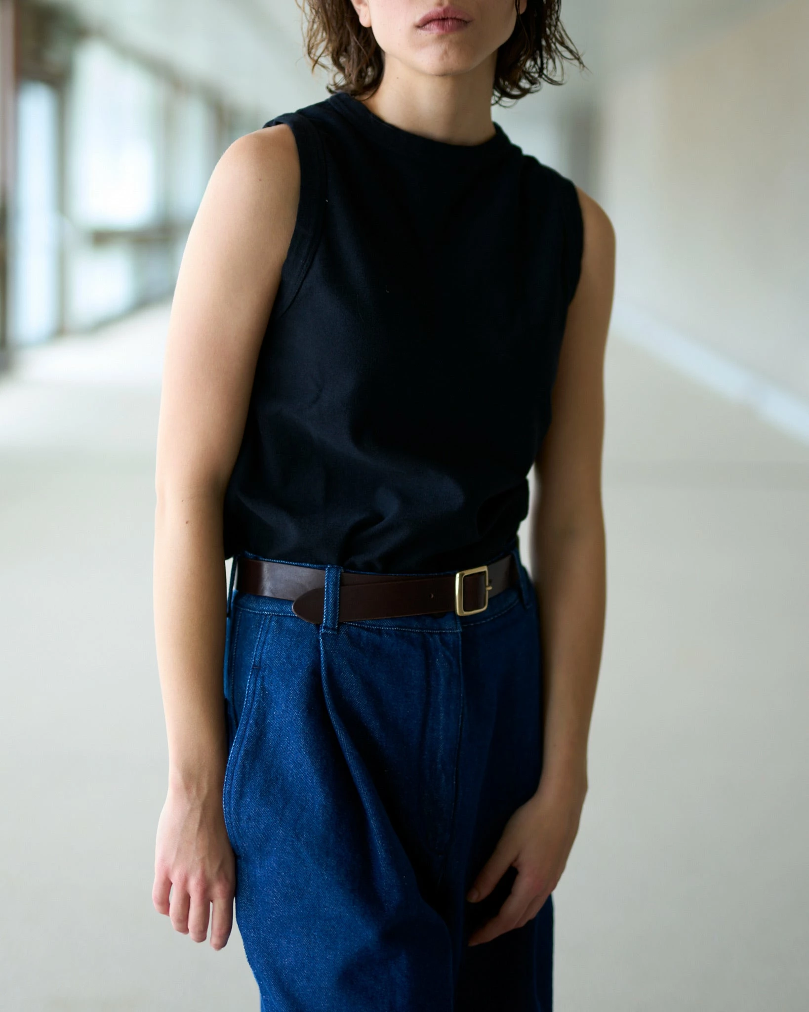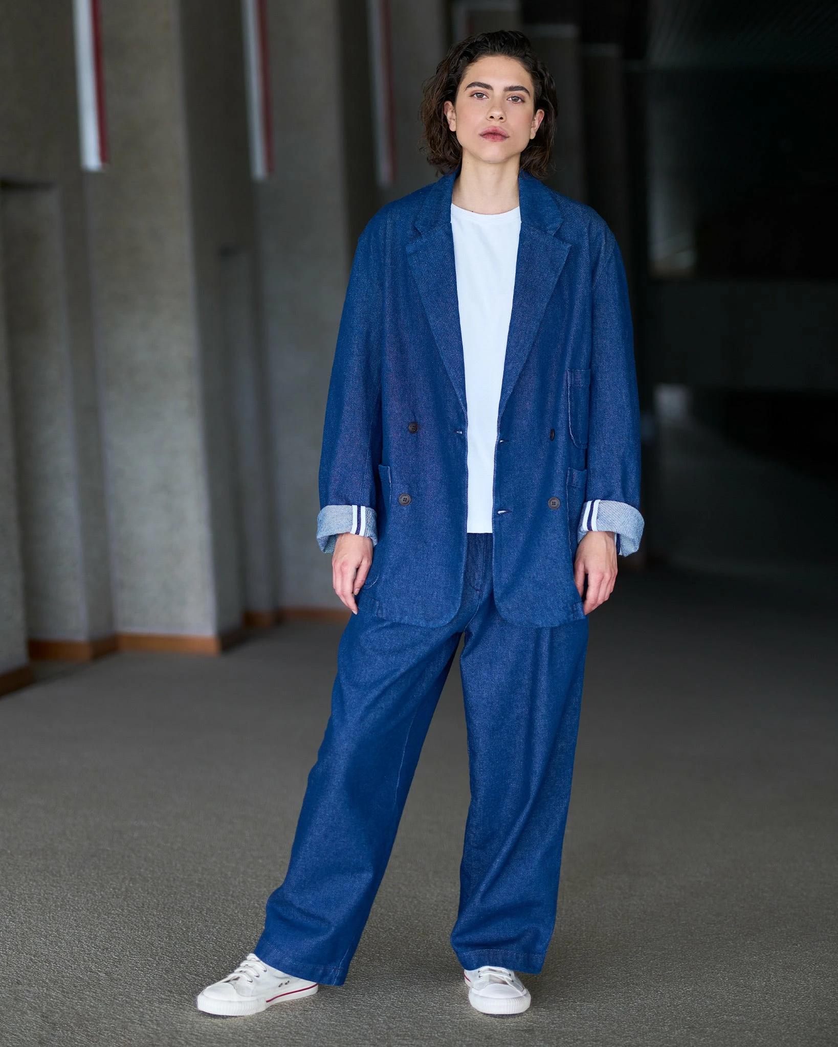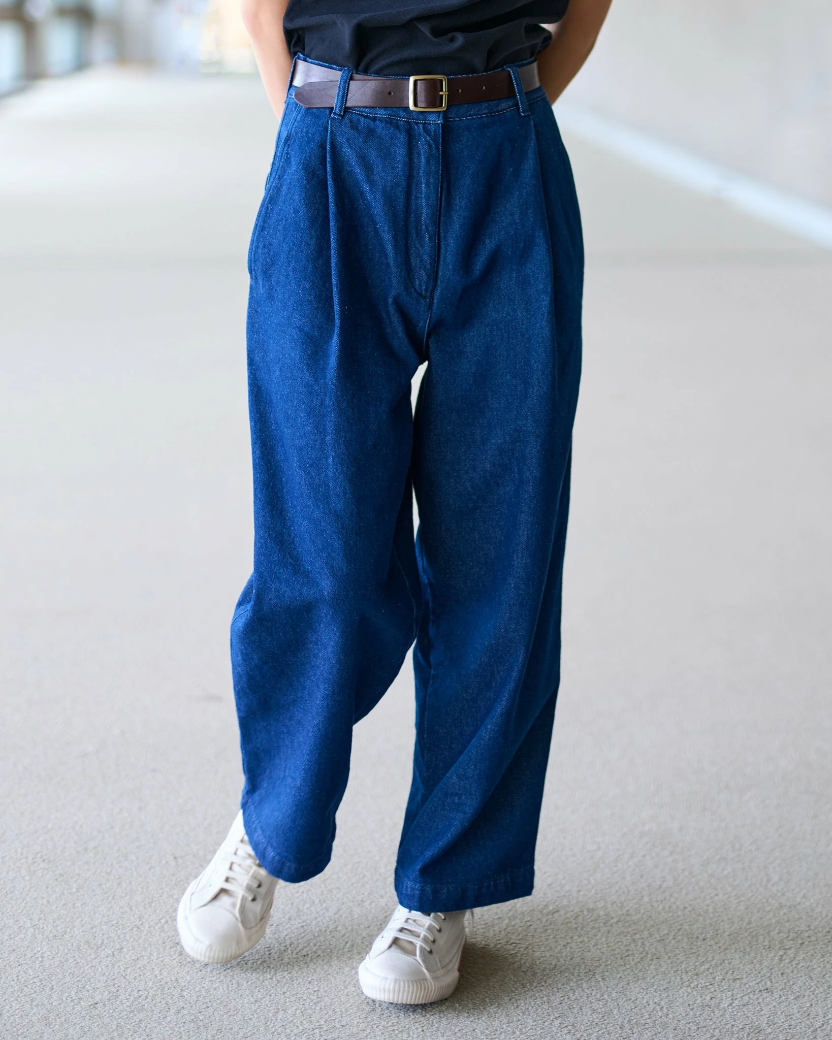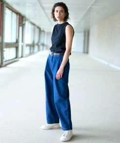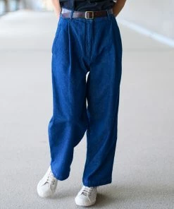 The British Worker is the absolute best seller among our women’s pants and we can see why. It combines a contemporary street style with a rugged worker edge. High on the waist, pleated legs, with a singe flap pocket on the back. Legs are loose and rounded, tapering towards the ankles. This one has a softer, washed blue tone that takes it back to the 1970s, kind of.