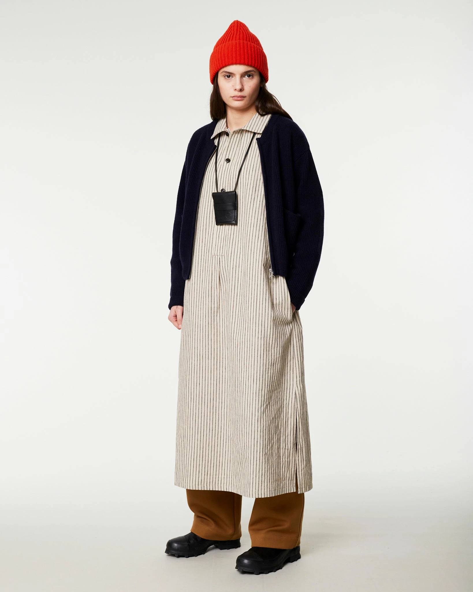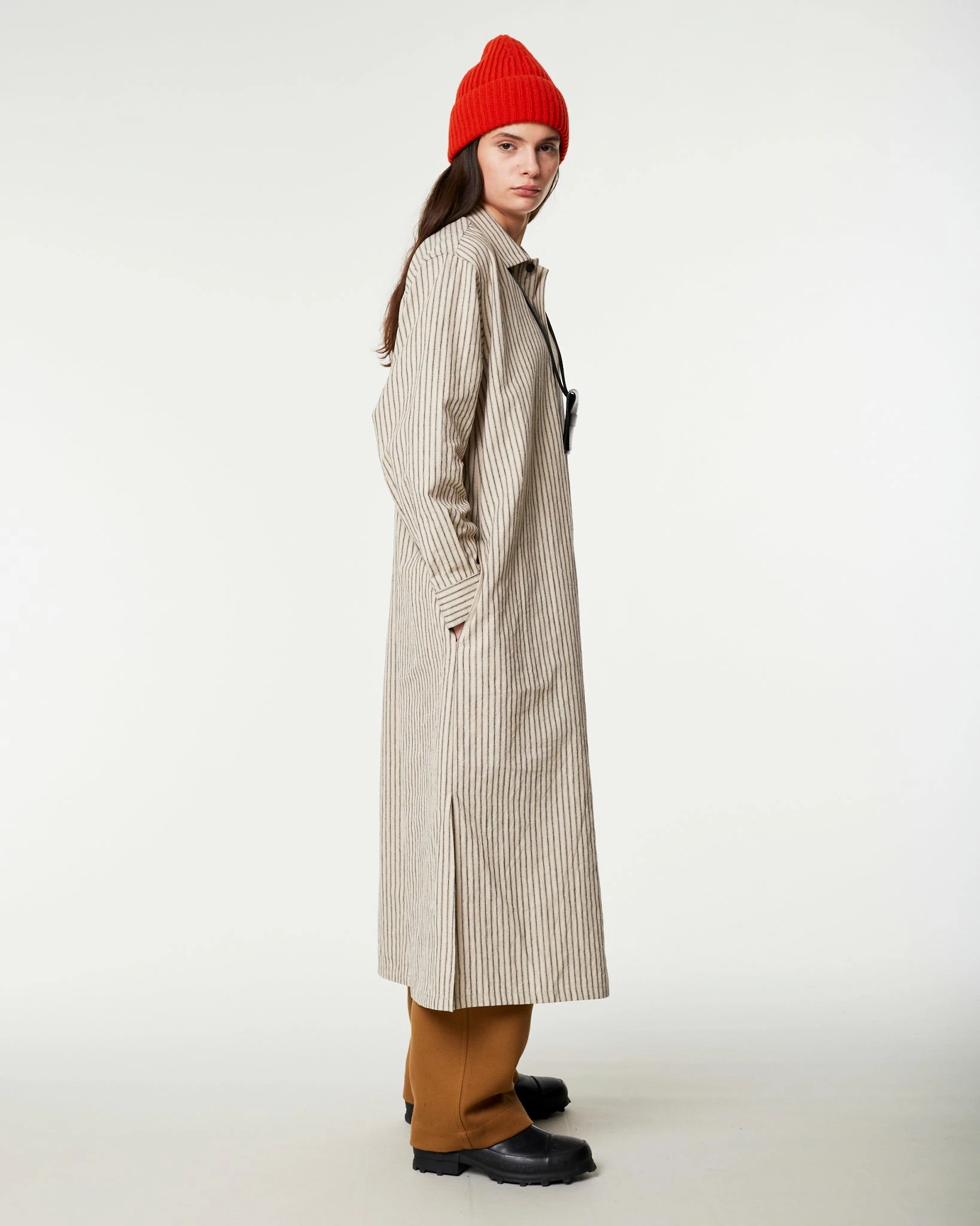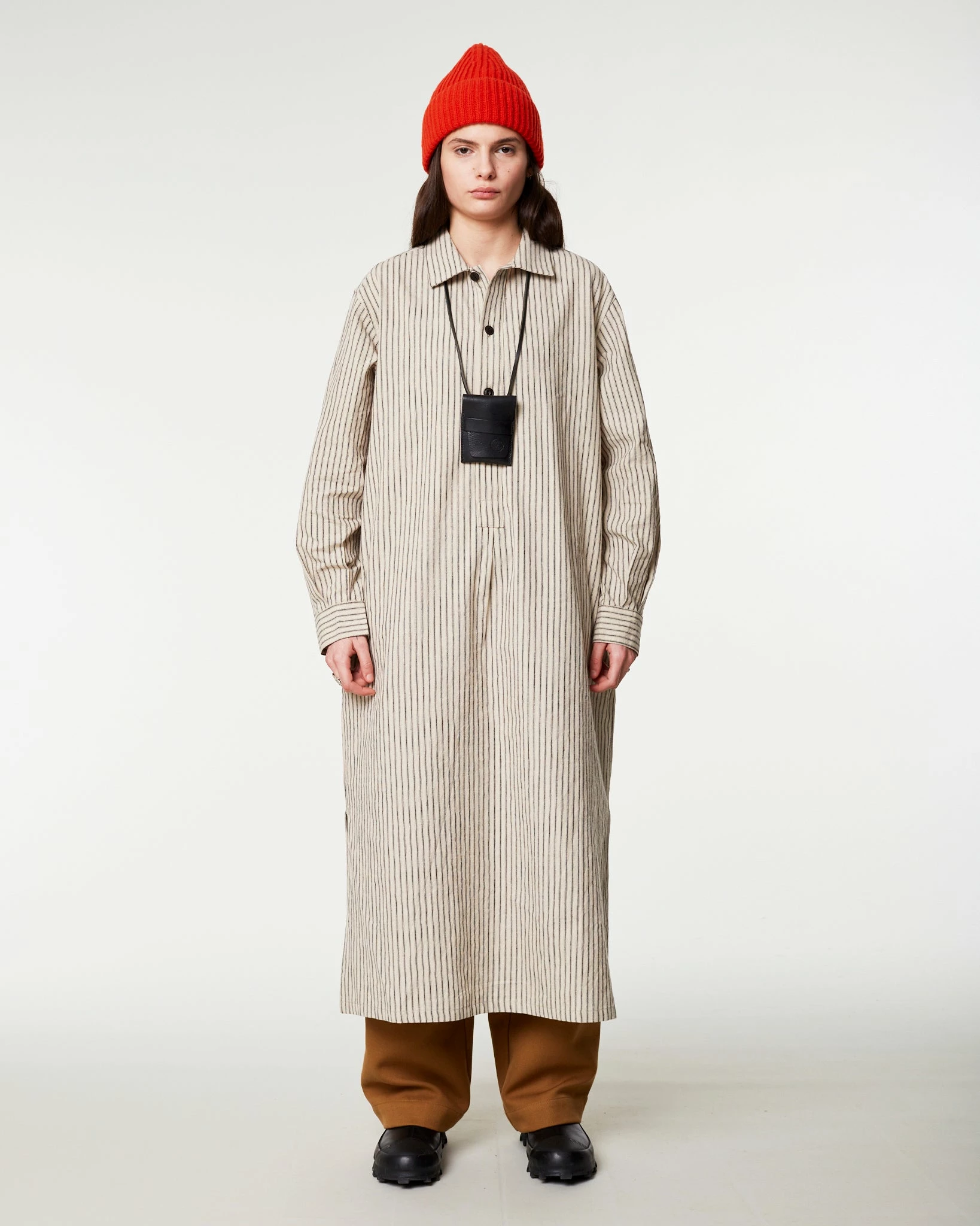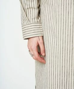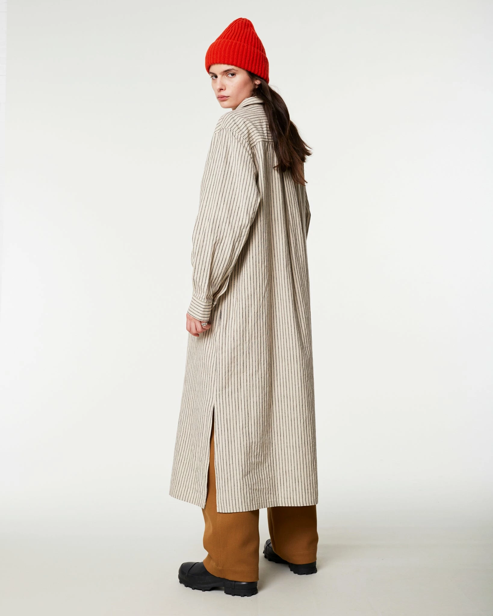 A slightly nonchalant dress full of attitude? Sure. This pull-on shirt dress falls at half calf length and was made from a striped cotton / linen blend. A relaxed fit with 2 hidden pockets at the side seam, finished with corozo buttons and side slits.Â