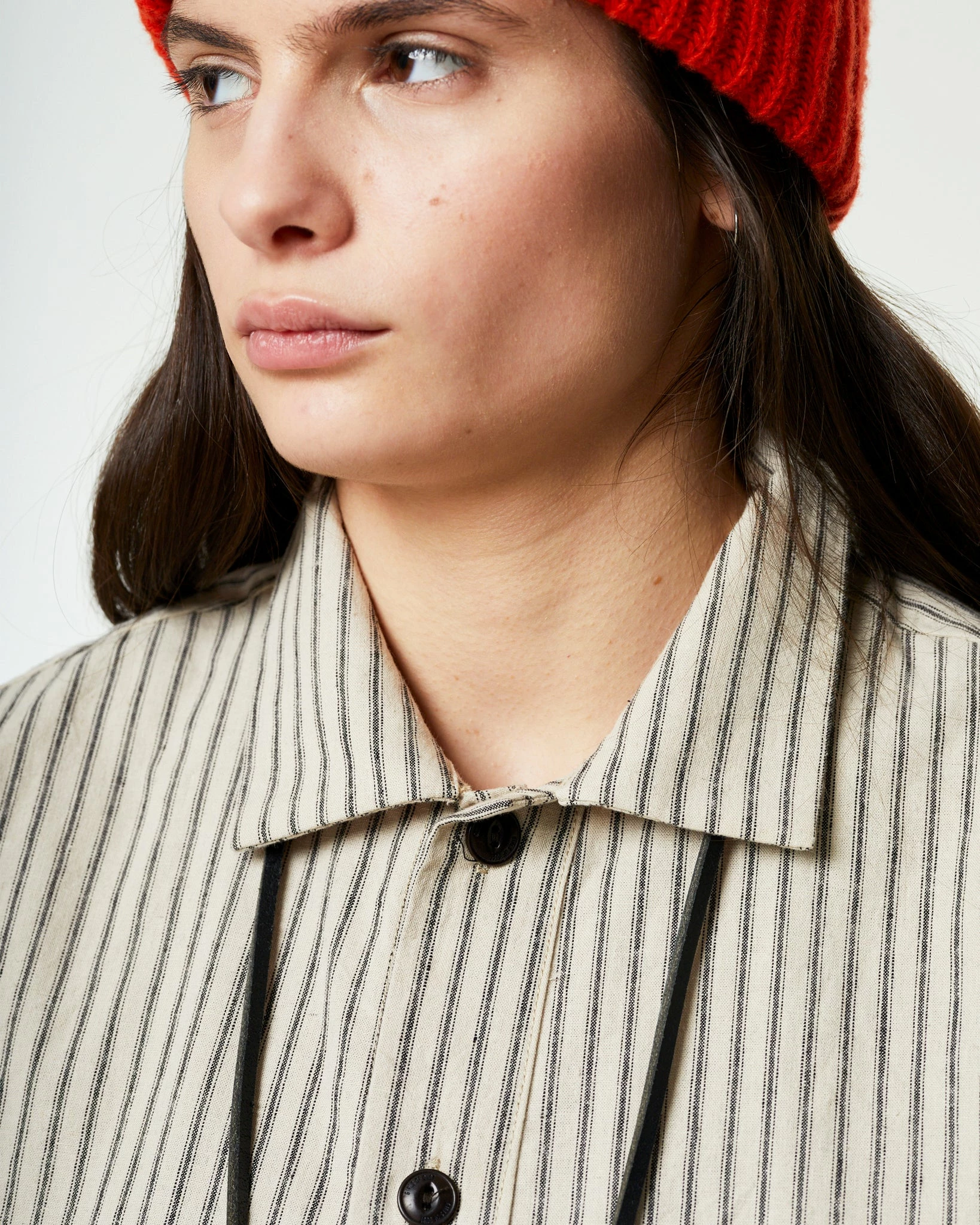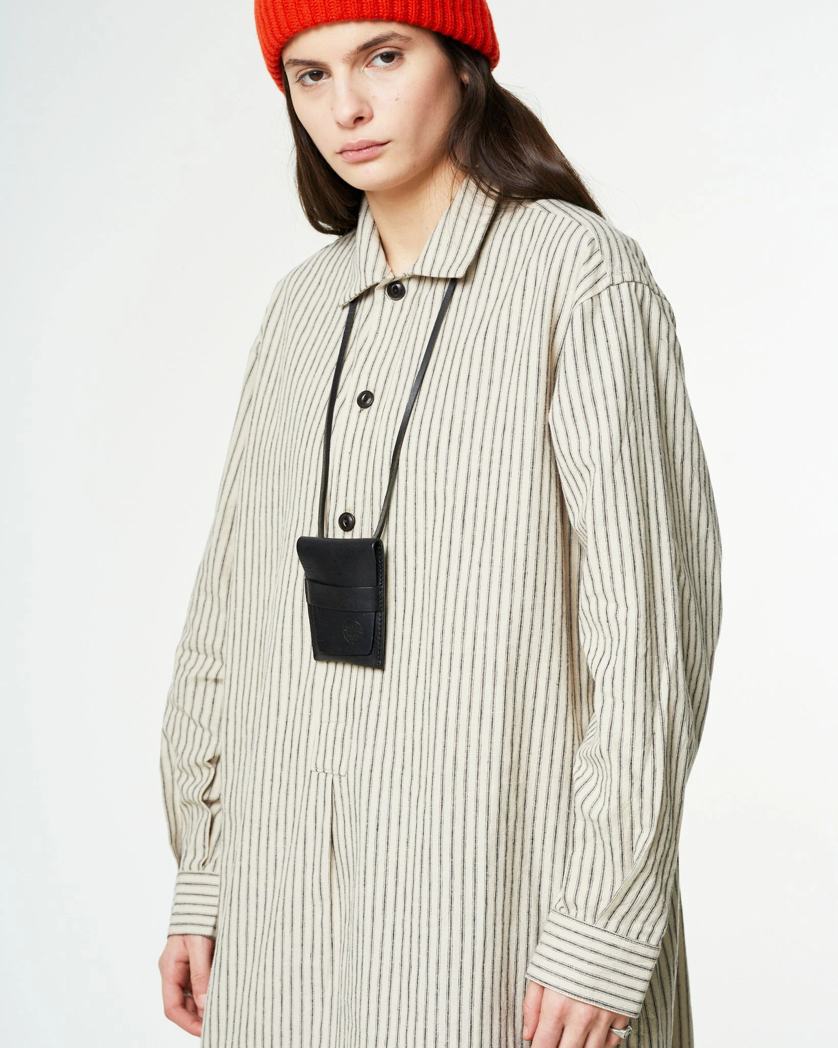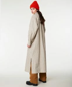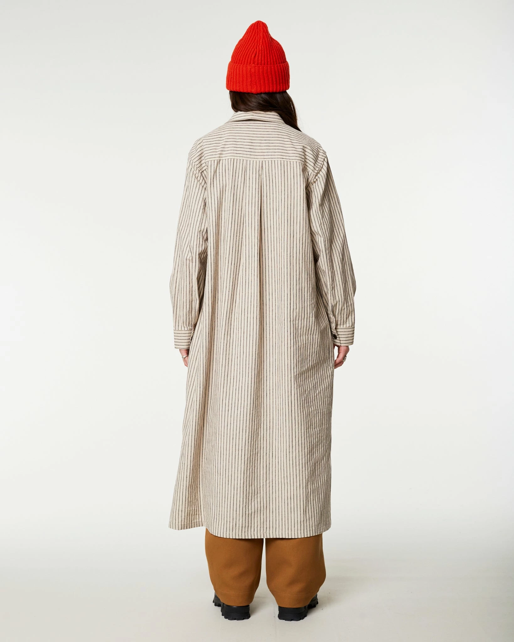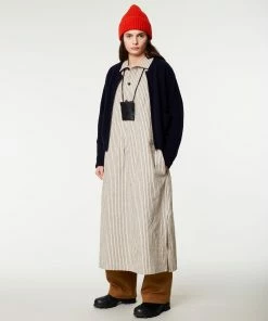 A slightly nonchalant dress full of attitude? Sure. This pull-on shirt dress falls at half calf length and was made from a striped cotton / linen blend. A relaxed fit with 2 hidden pockets at the side seam, finished with corozo buttons and side slits.Â