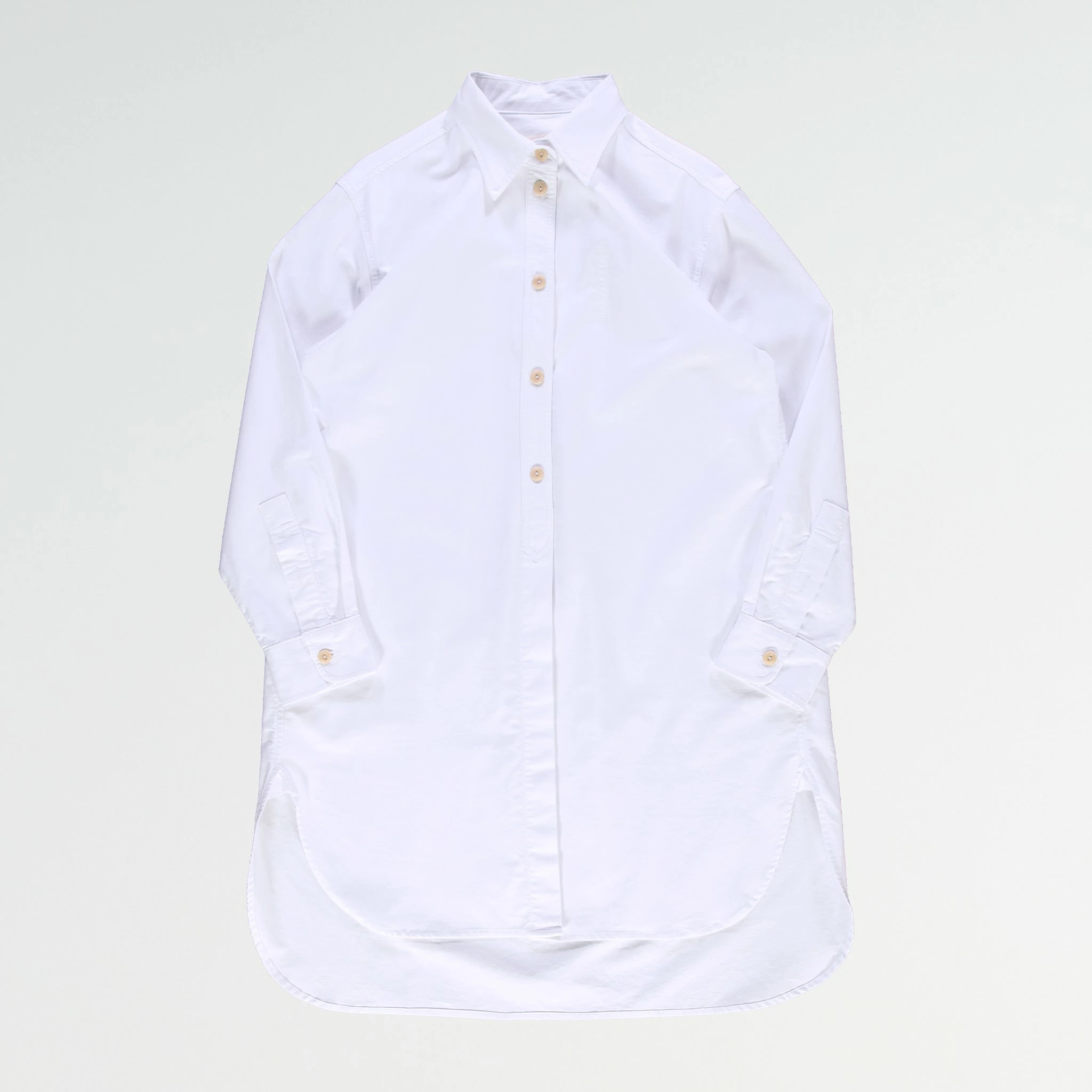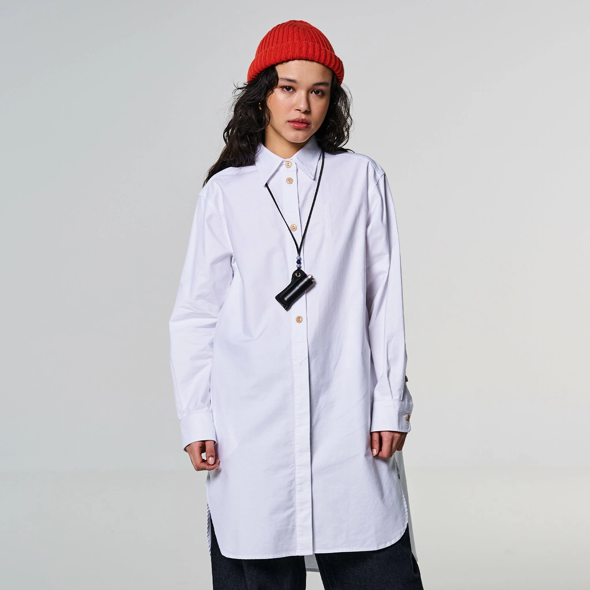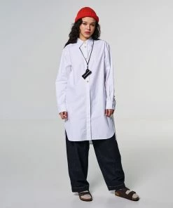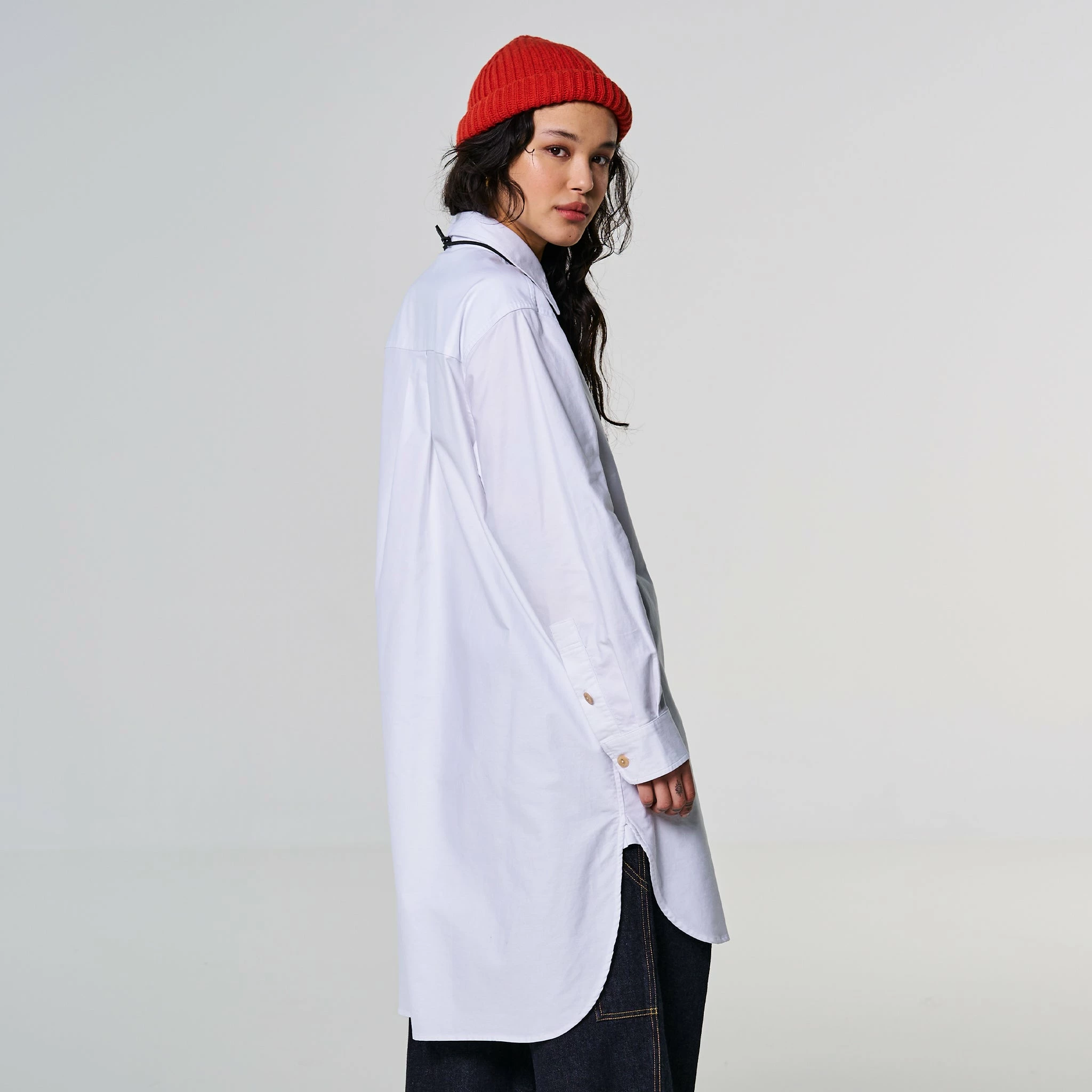 Say hi to Cyrus, our newest shirt style, but it’s a bit more than just a shirt. Cut at a 3/4 length, this is a maxi tunic-style shirt with a curved hem, half hidden button placket and a longer length on the back panel. Classic white Oxford cotton. You can wear it as a dress as well, with tights.Â