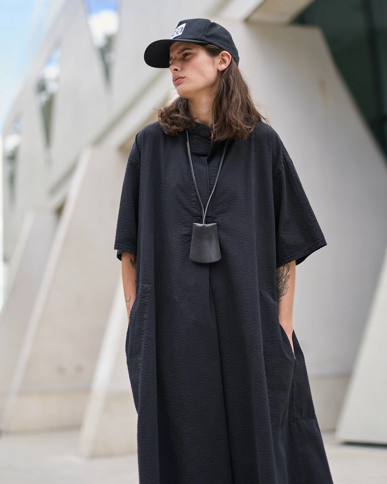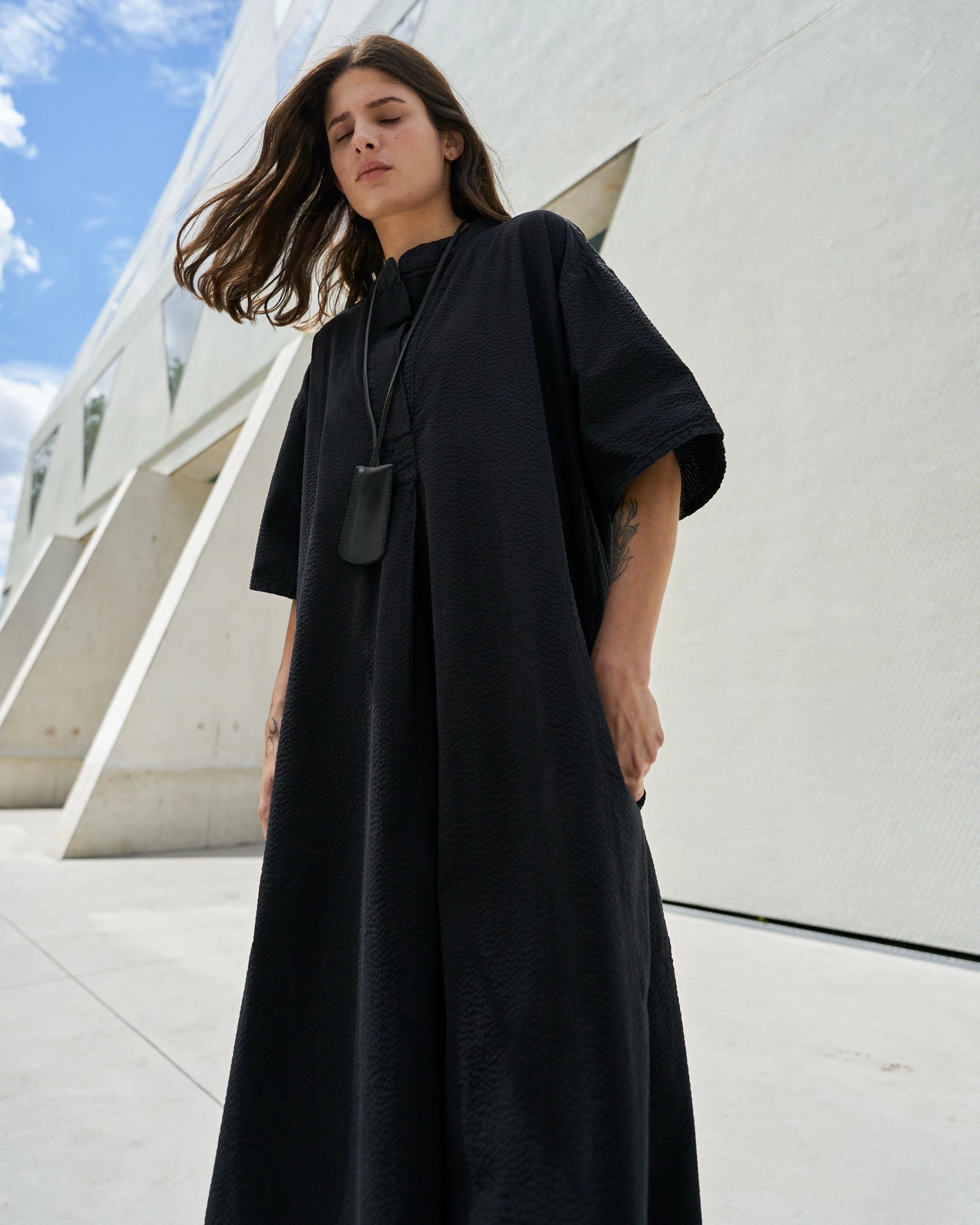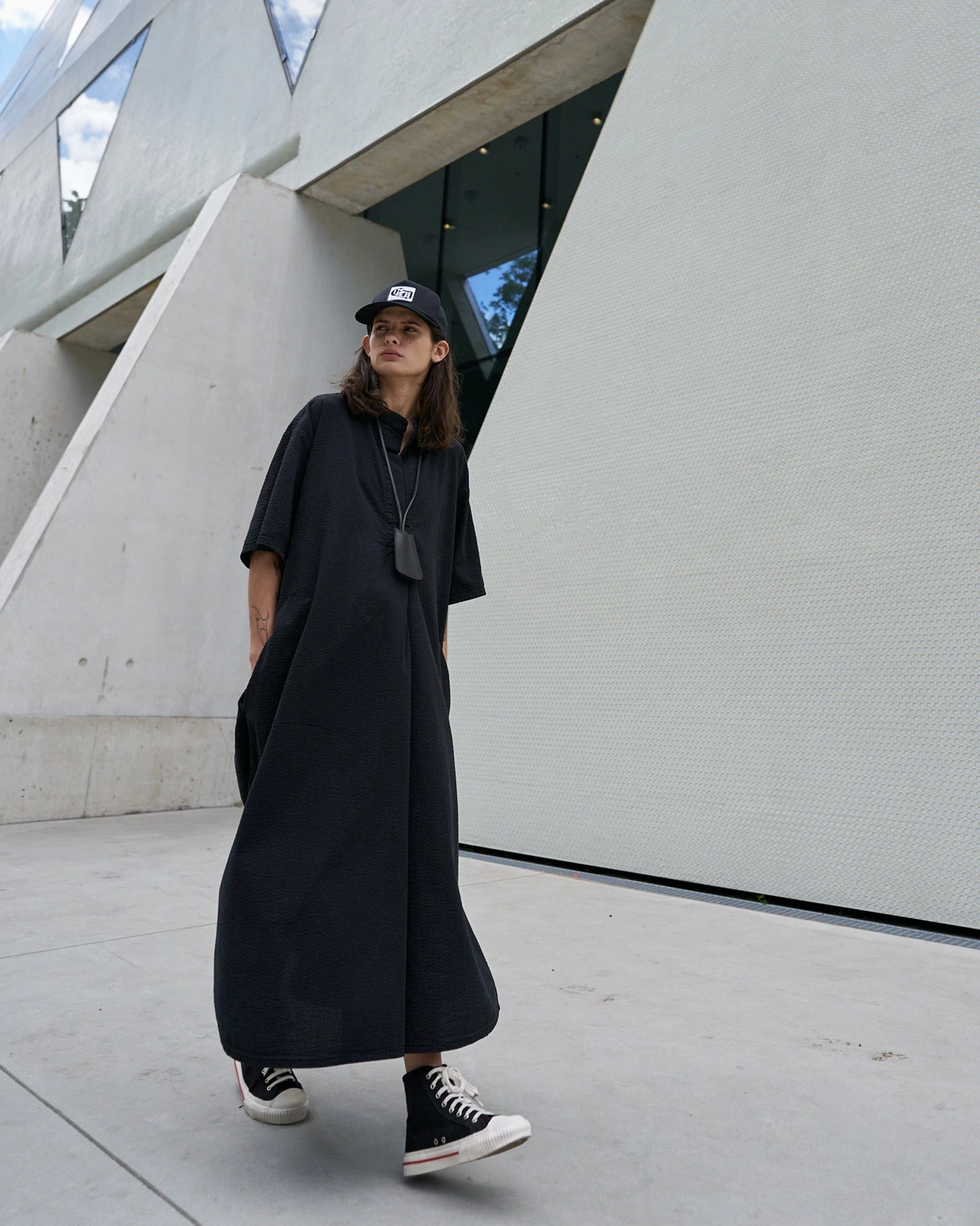 As always, easy does it, so yes – you can rely on this Gardian Dress to get dressed in a split second and look great. Loose and comfy as can be, with dropped shoulders and elbow length sleeves. Black is a no brainer, and this seersucker cotton it’s made from is a perfect Spring & Summer fabric.