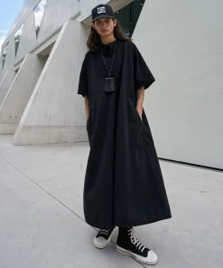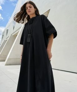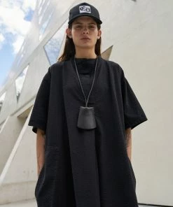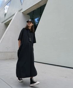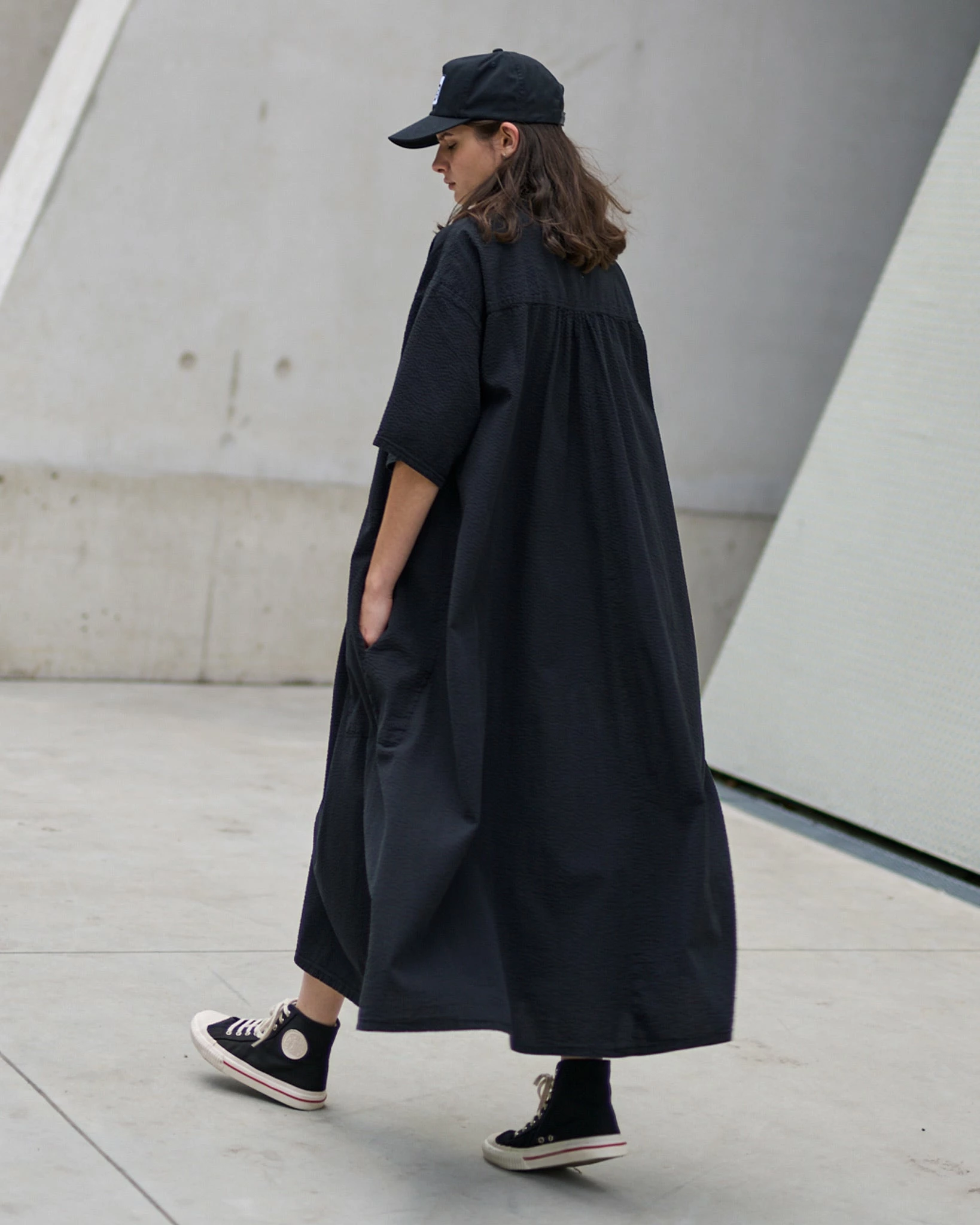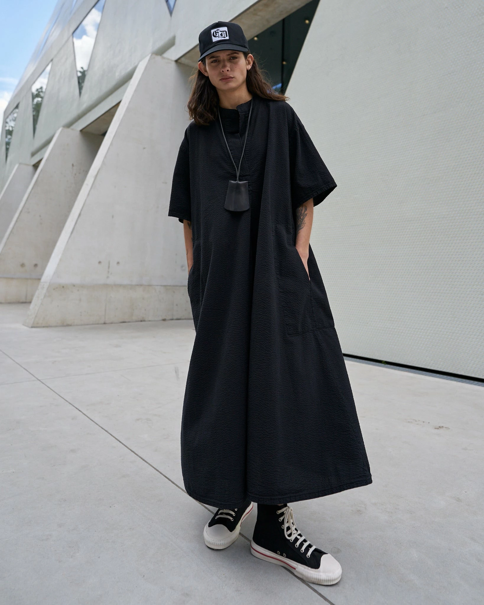 As always, easy does it, so yes – you can rely on this Gardian Dress to get dressed in a split second and look great. Loose and comfy as can be, with dropped shoulders and elbow length sleeves. Black is a no brainer, and this seersucker cotton it’s made from is a perfect Spring & Summer fabric.