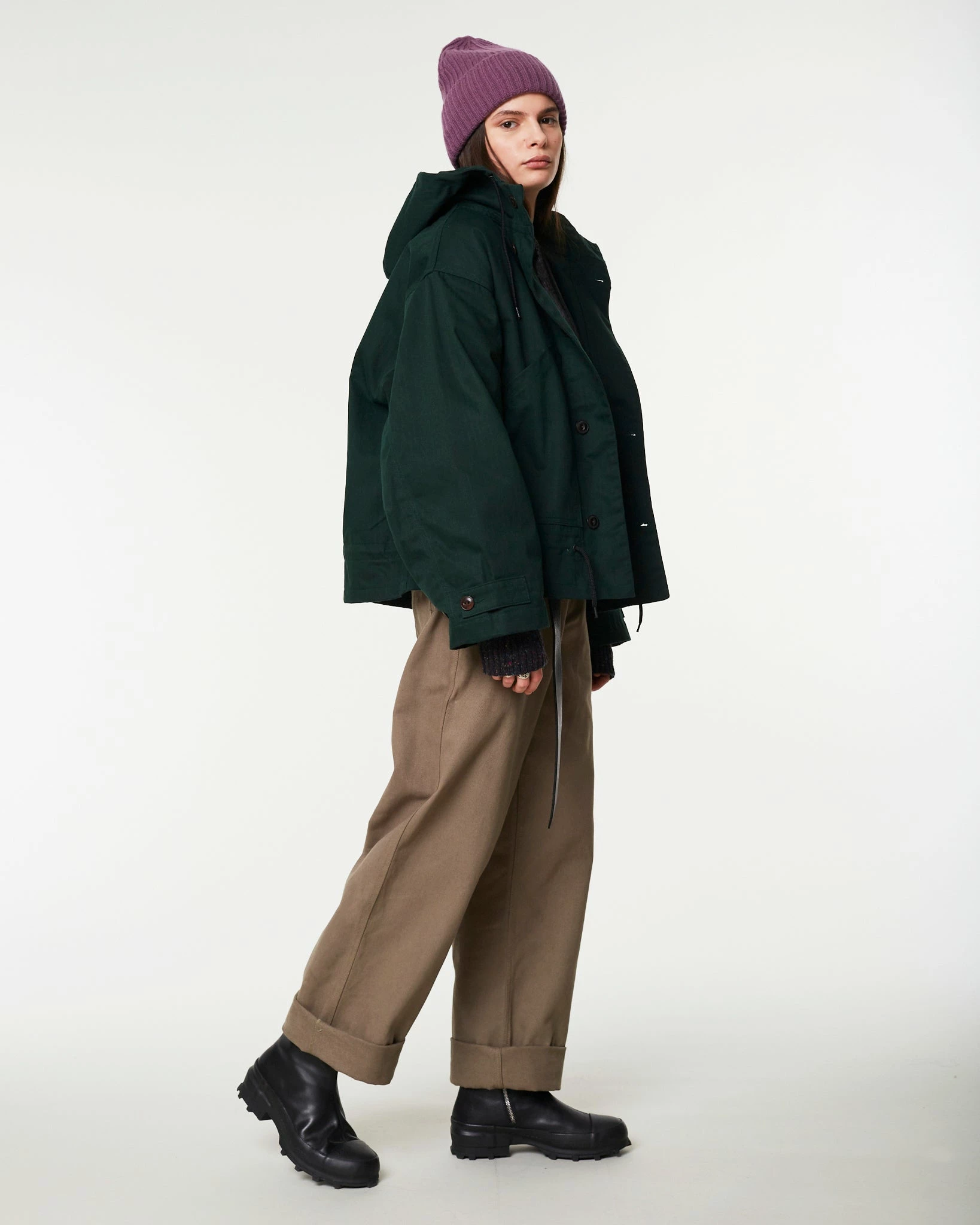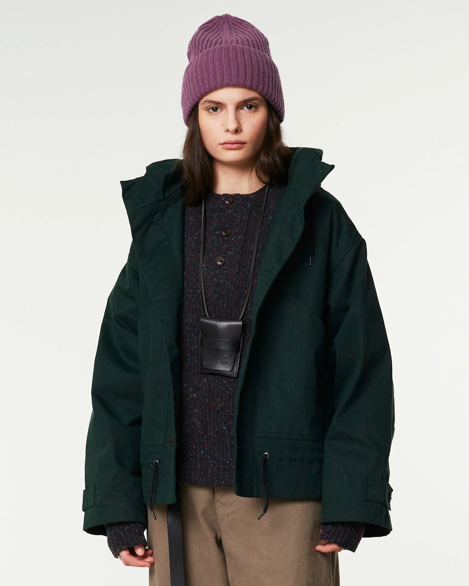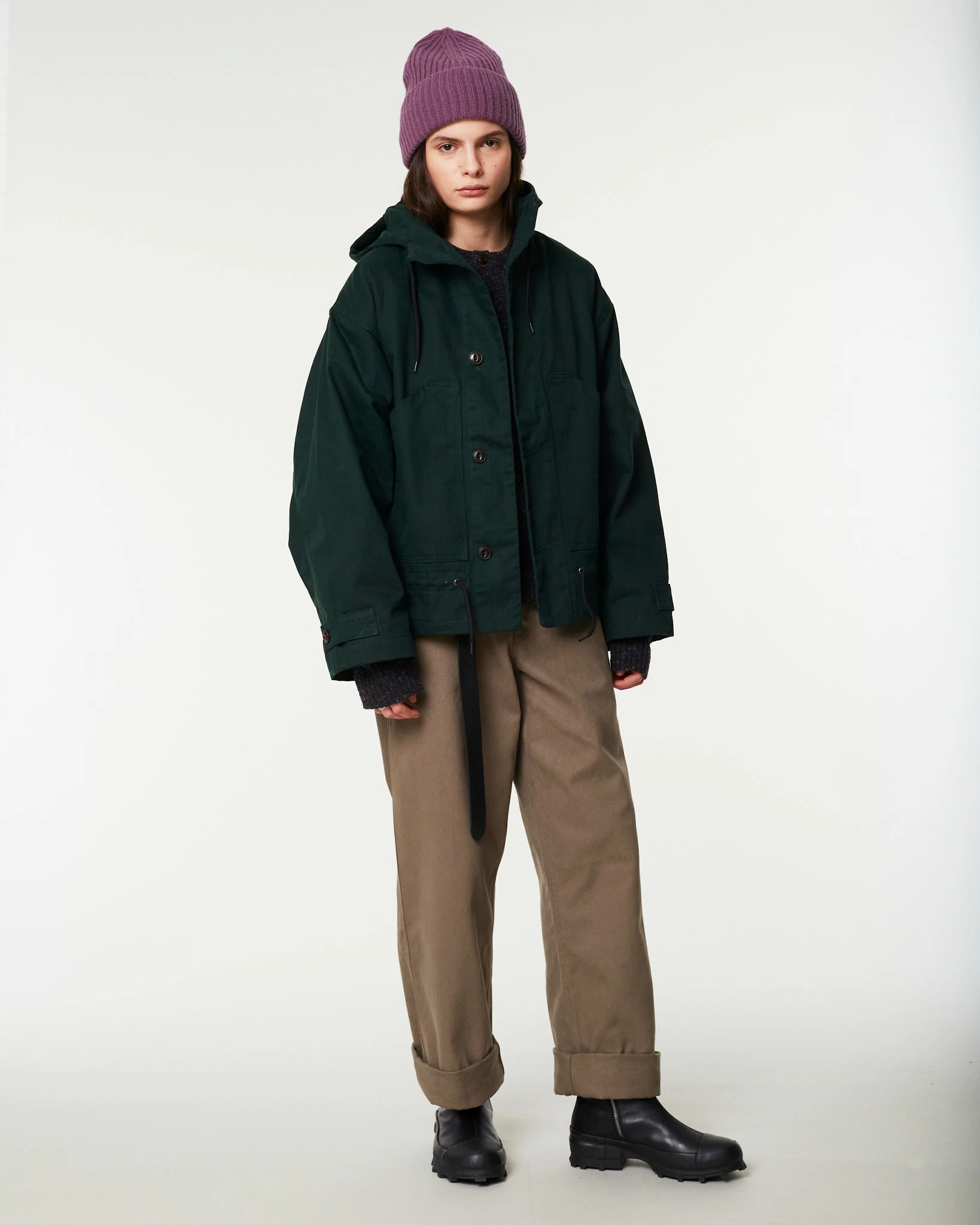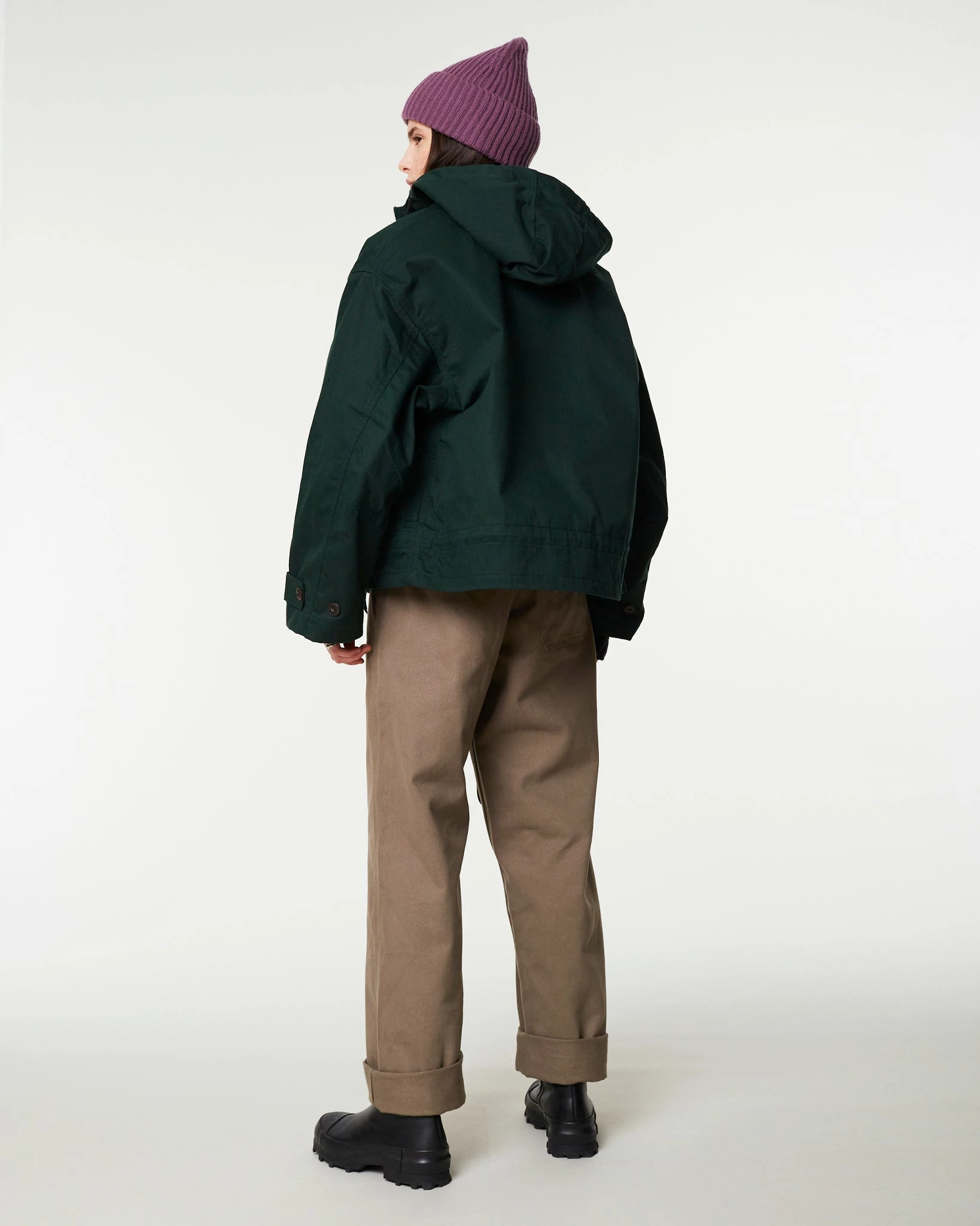 Based on a vintage army jacket, the G.o.D. Nuclear Rain Jacket fits loose and boxy, and comes with a large hood. A nonchalant style, meant to be worn loosely, made from a waxed cotton (sourced from Halley Stevenson in Scotland). Features 2 large front pockets, adjustable cuffs, corozo buttons and a drawstring in the hem.
