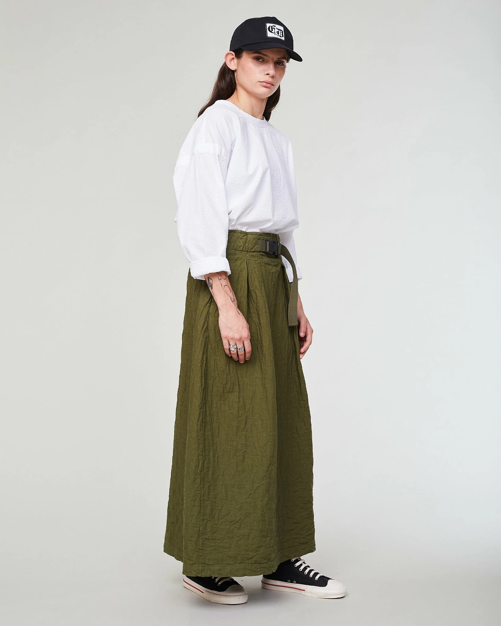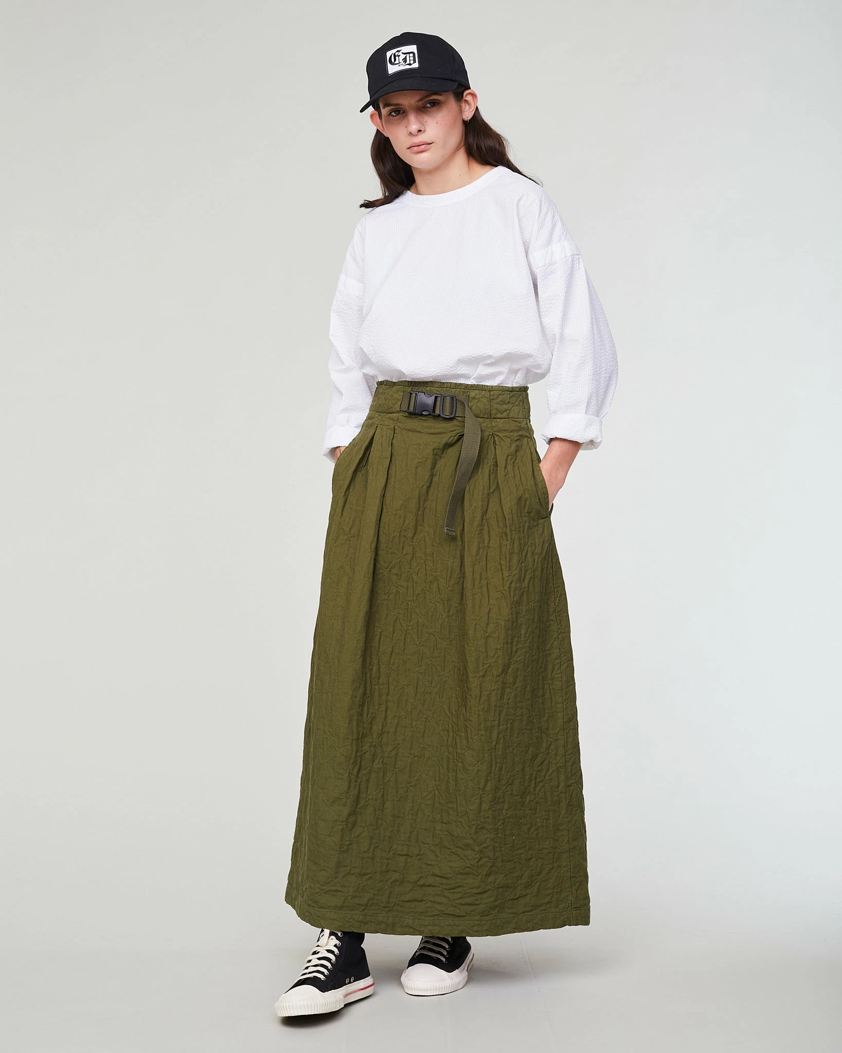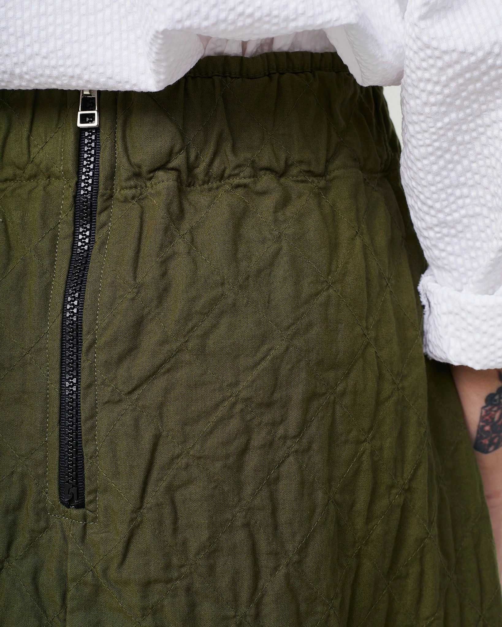 A brand new style in our range of skirts: the Tulip. This is a super comfortable, ankle-length skirt that fits higher on the waist and that can be closed with a more technical belt – hinting at outdoor clothing. Its pleats and large volume give it a very feminine, nonchalant feel. Made from a soft quilted cotton.