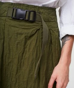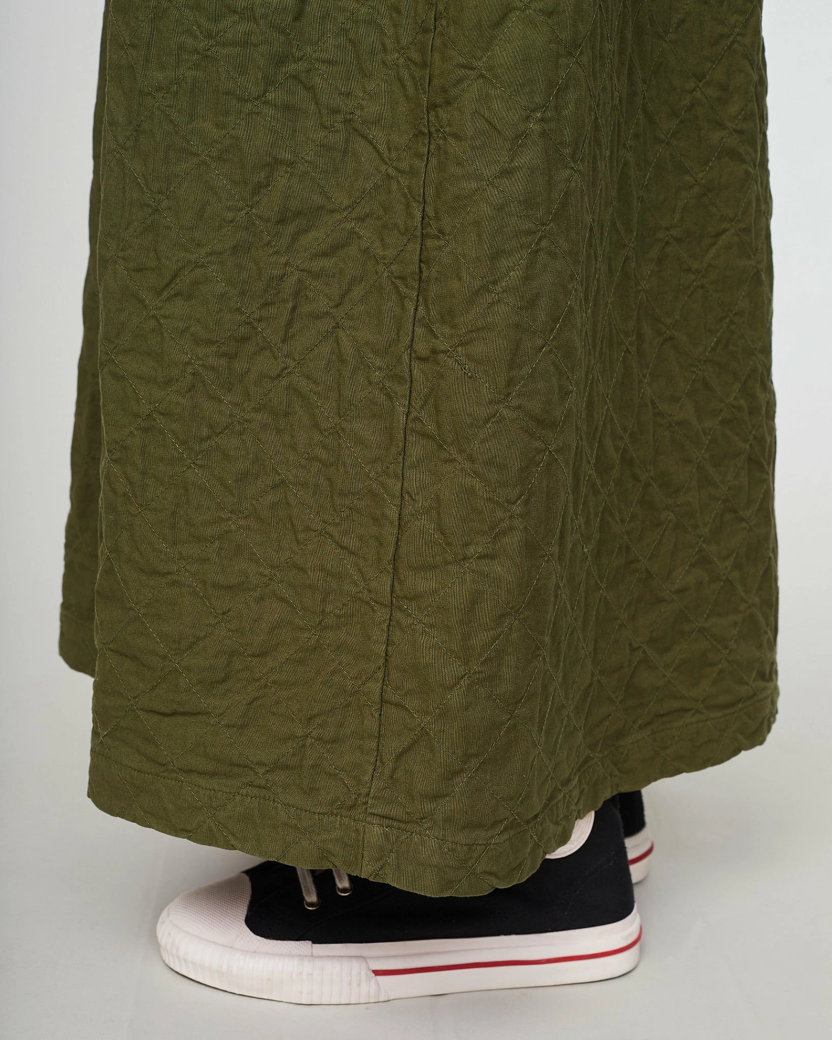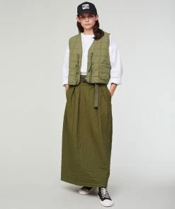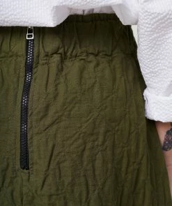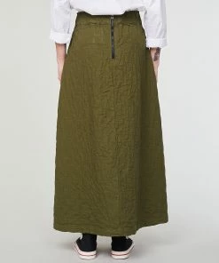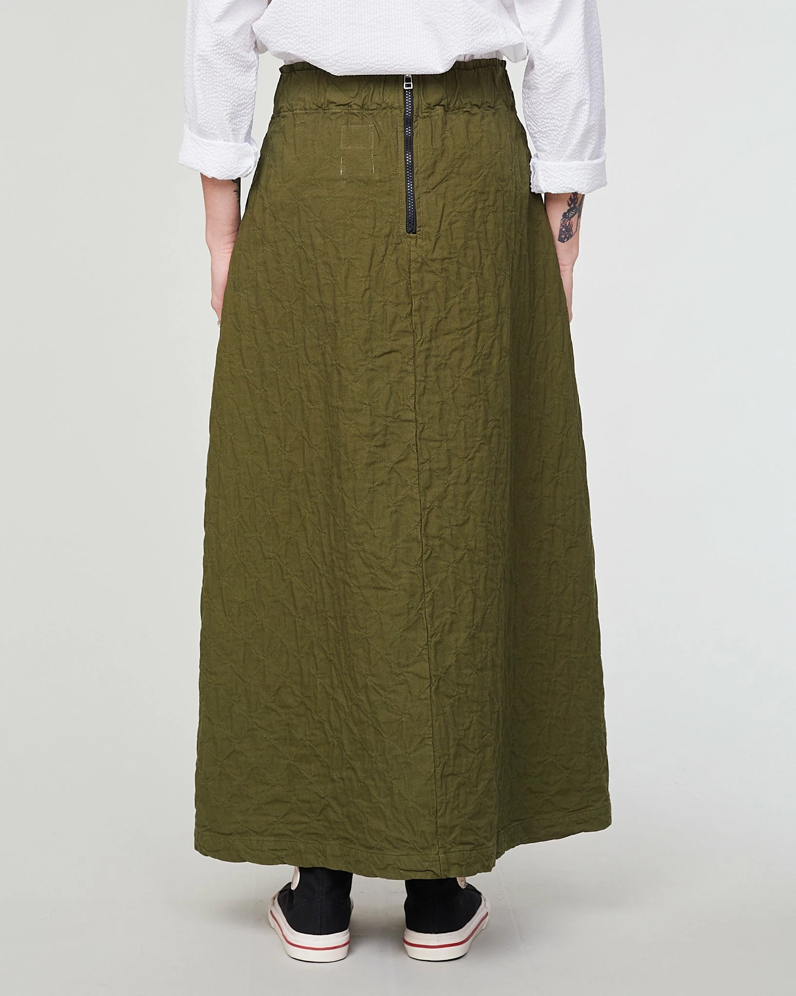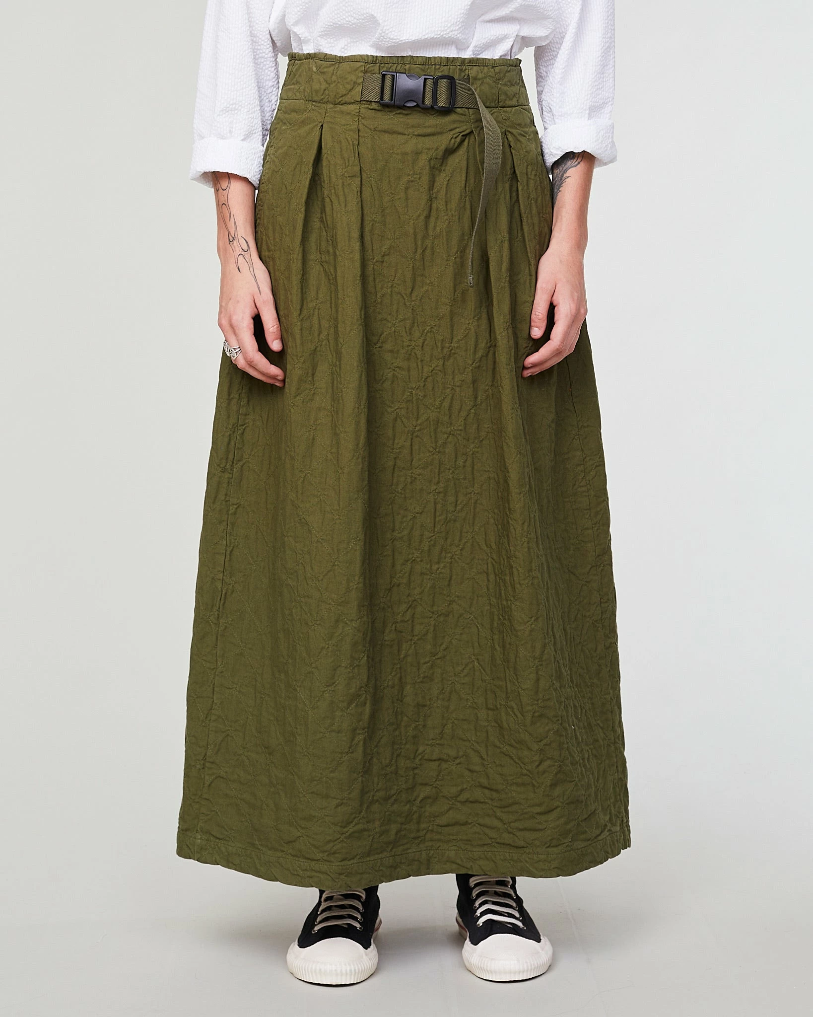 A brand new style in our range of skirts: the Tulip. This is a super comfortable, ankle-length skirt that fits higher on the waist and that can be closed with a more technical belt – hinting at outdoor clothing. Its pleats and large volume give it a very feminine, nonchalant feel. Made from a soft quilted cotton.