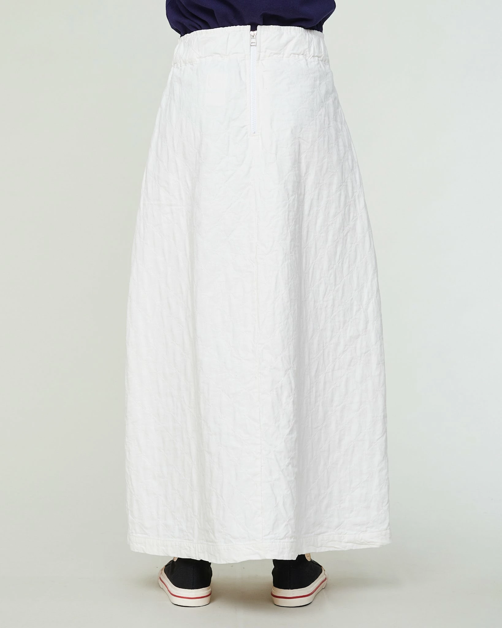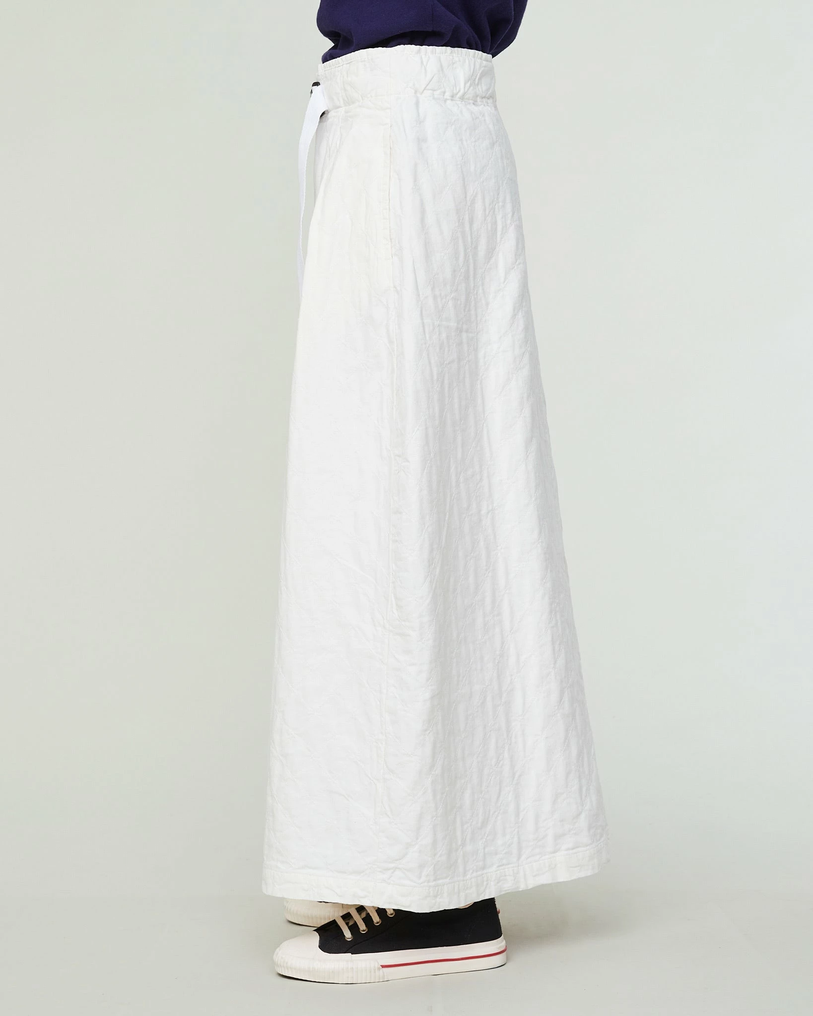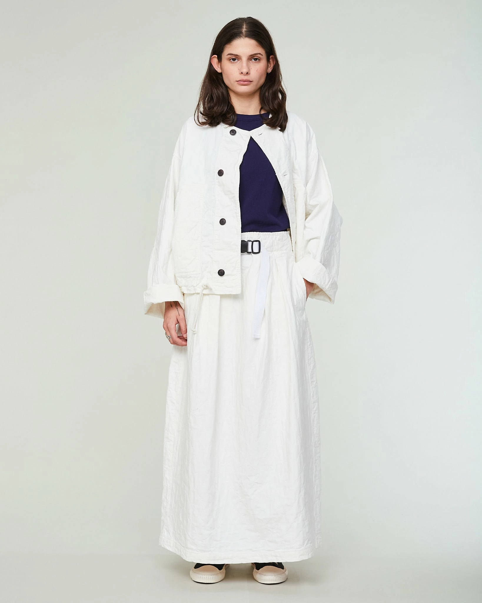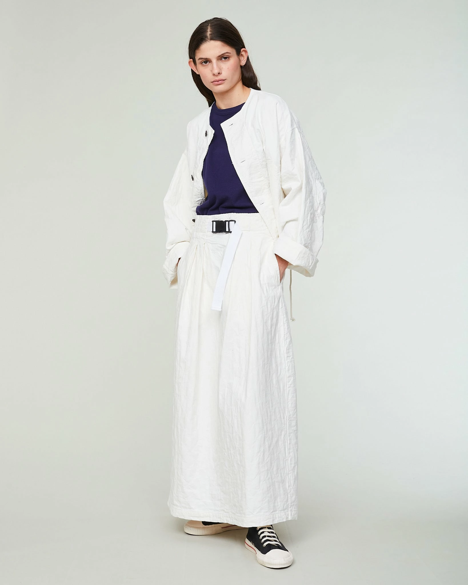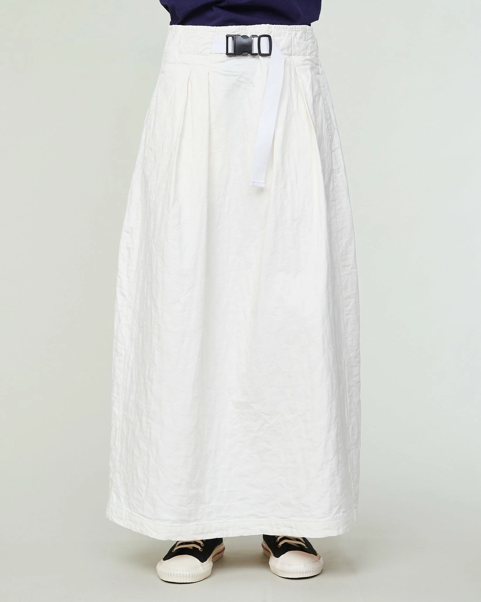 A brand new style in our range of skirts: the Tulip. This is a super comfortable, ankle-length skirt that fits higher on the waist and that can be closed with a more technical belt – hinting at outdoor clothing. Its pleats and large volume give it a very feminine, nonchalant feel. Made from a soft quilted cotton.