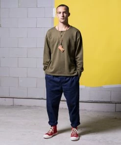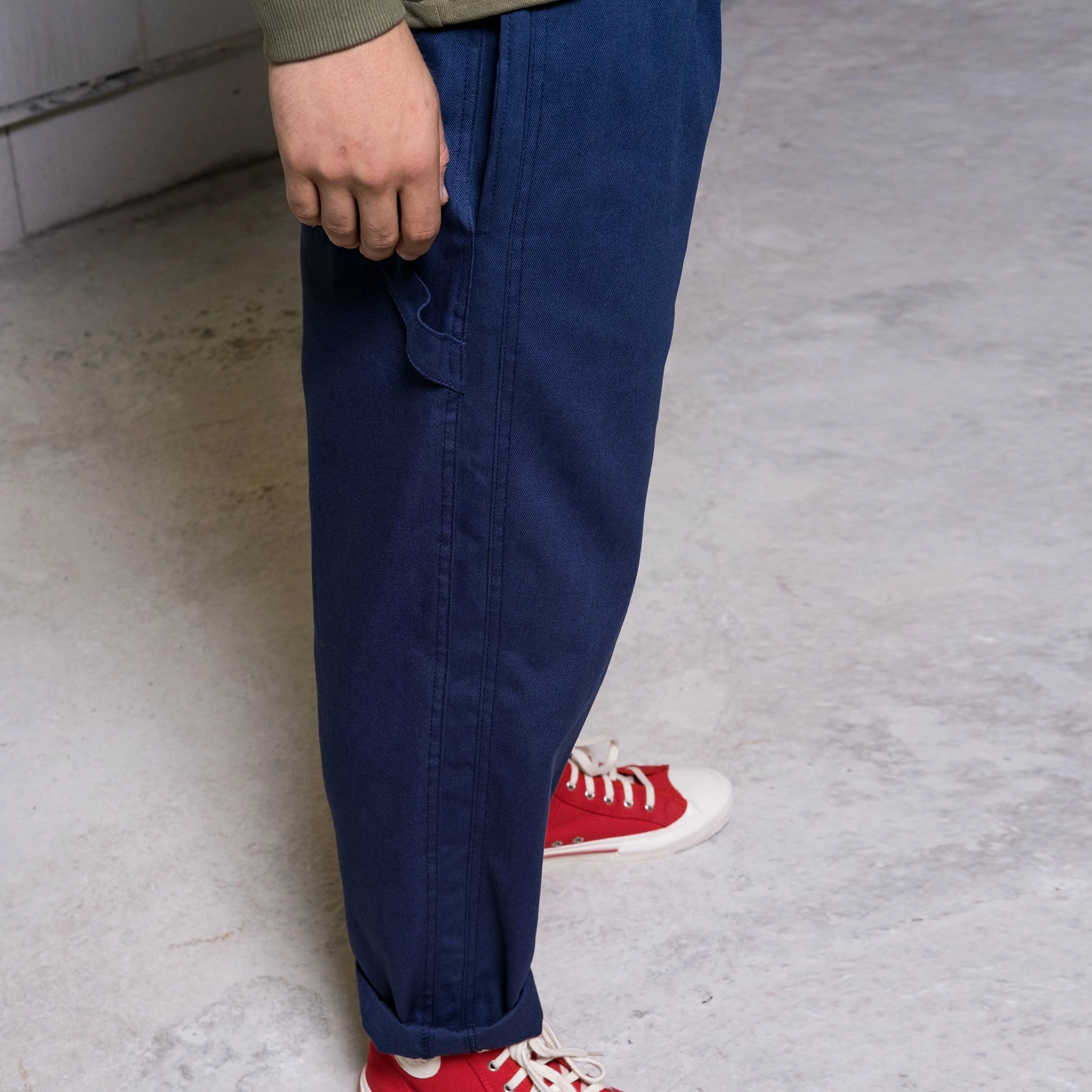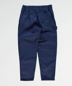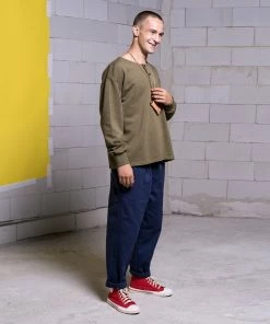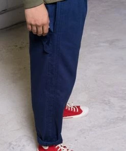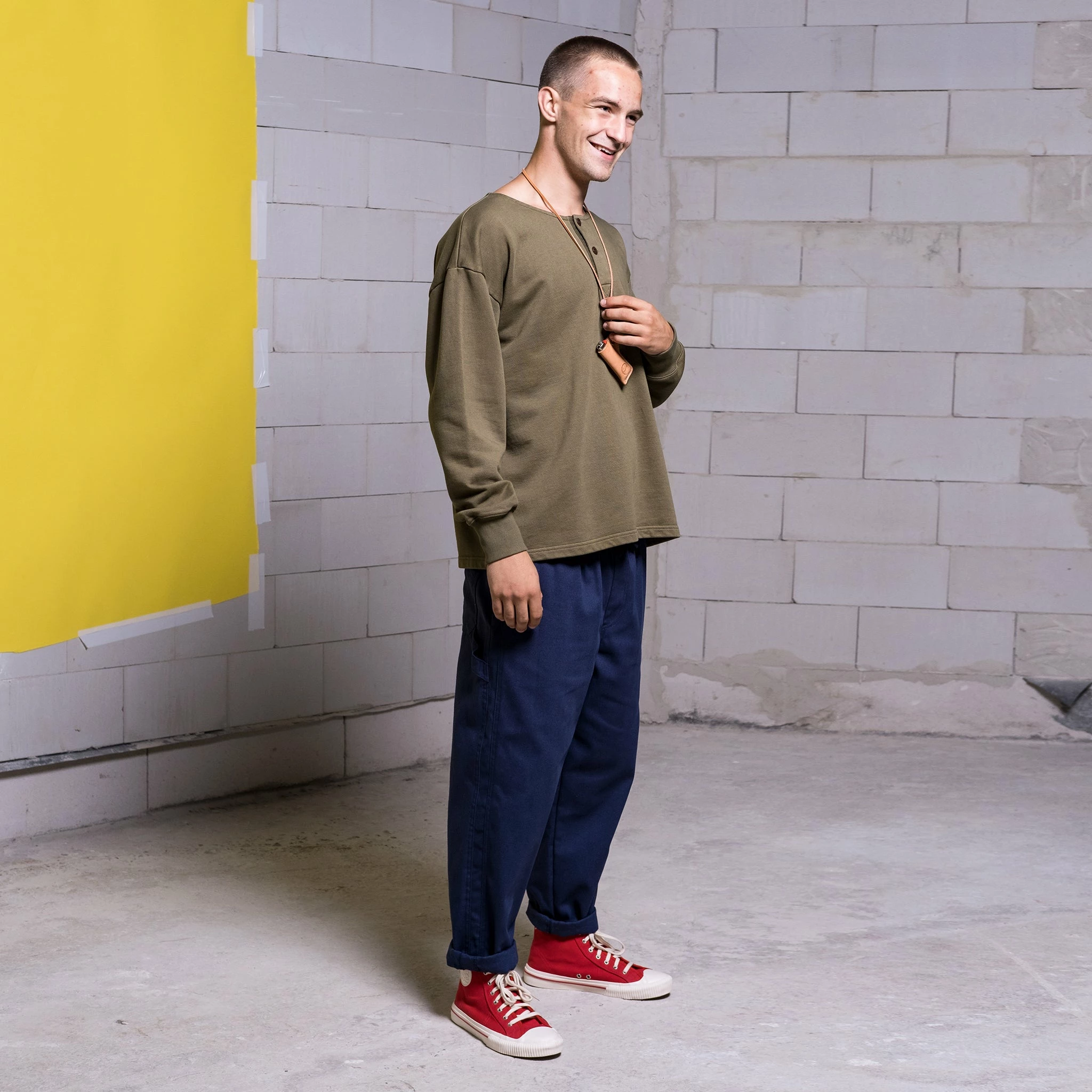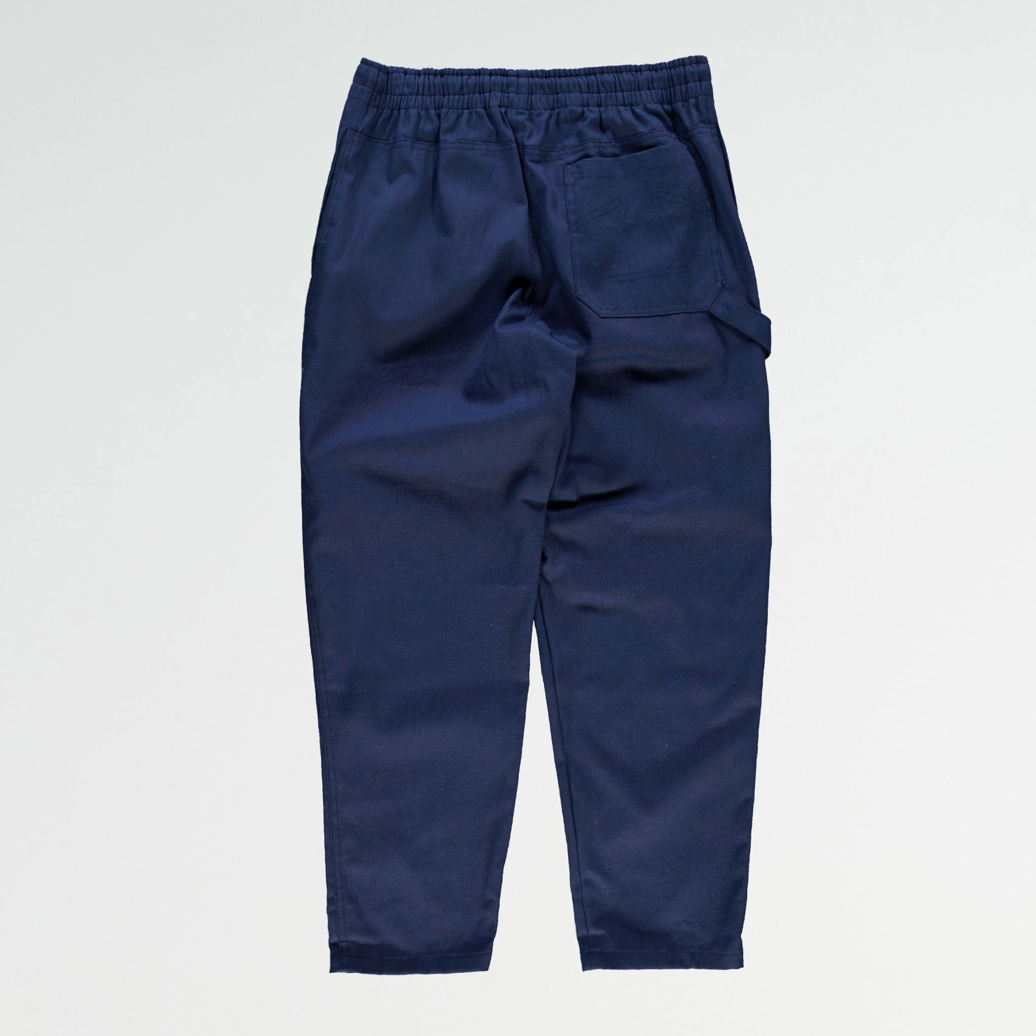 Welcome, welcome Gonz. Our newest fit for men. As we all love comfort, we went all the way here. The Gonz is super comfy and easy to wear, with a loose fit, lowered crotch and tapered legs. Finished with an elasticated waistband and drawstring. Thus navy blue version was made from a sturdy cotton canvas, sourced from the UK.