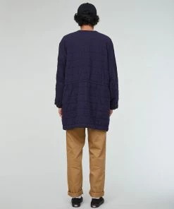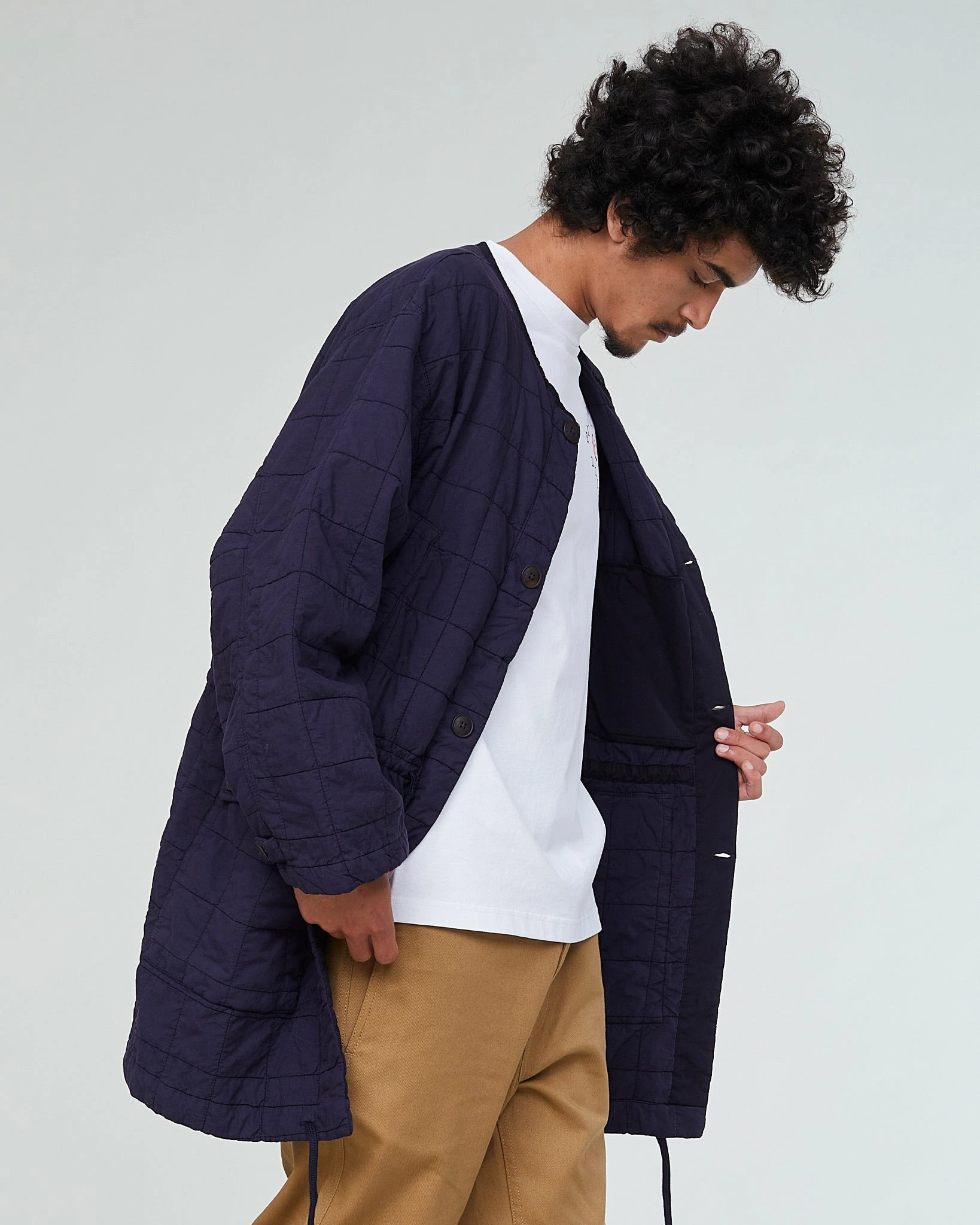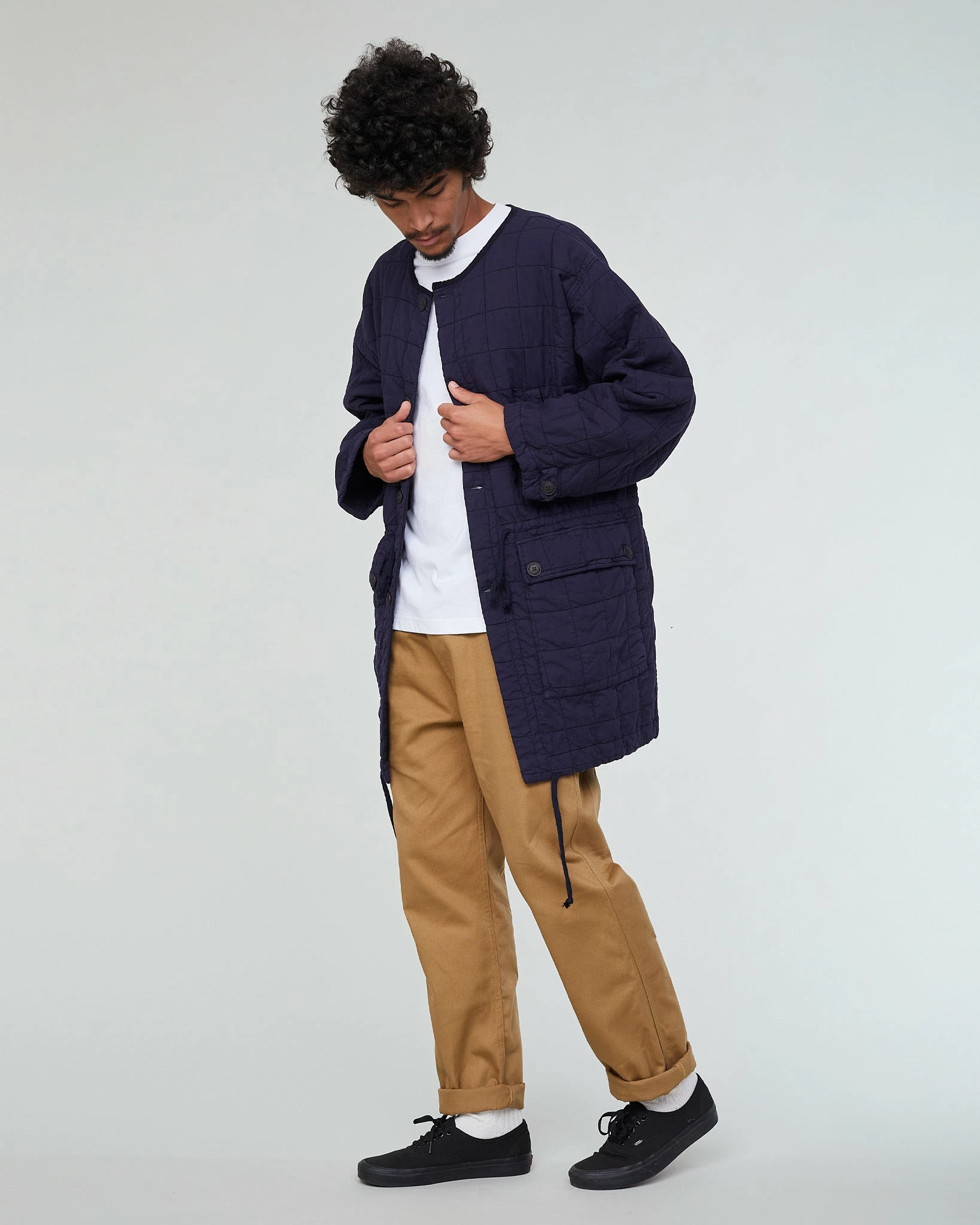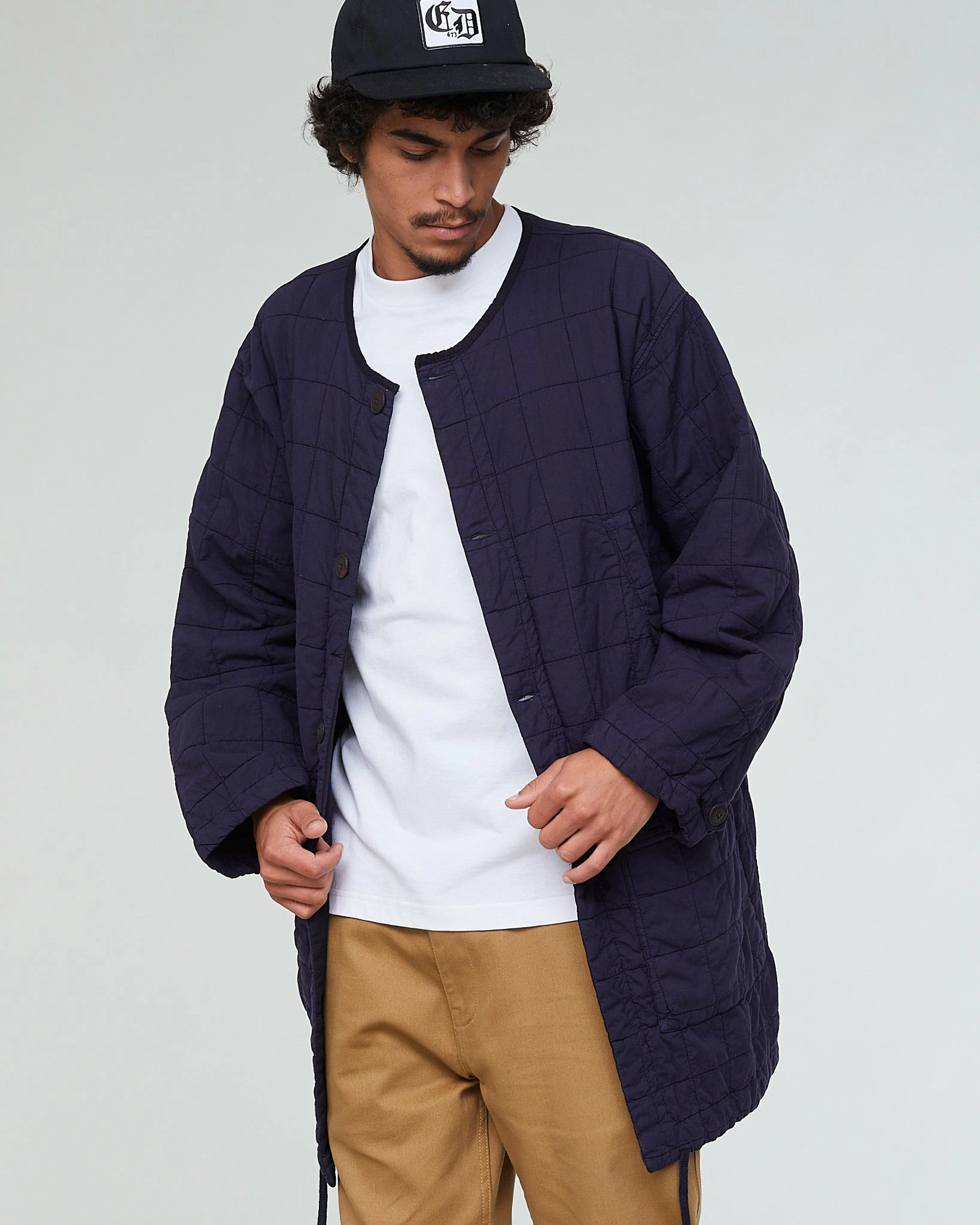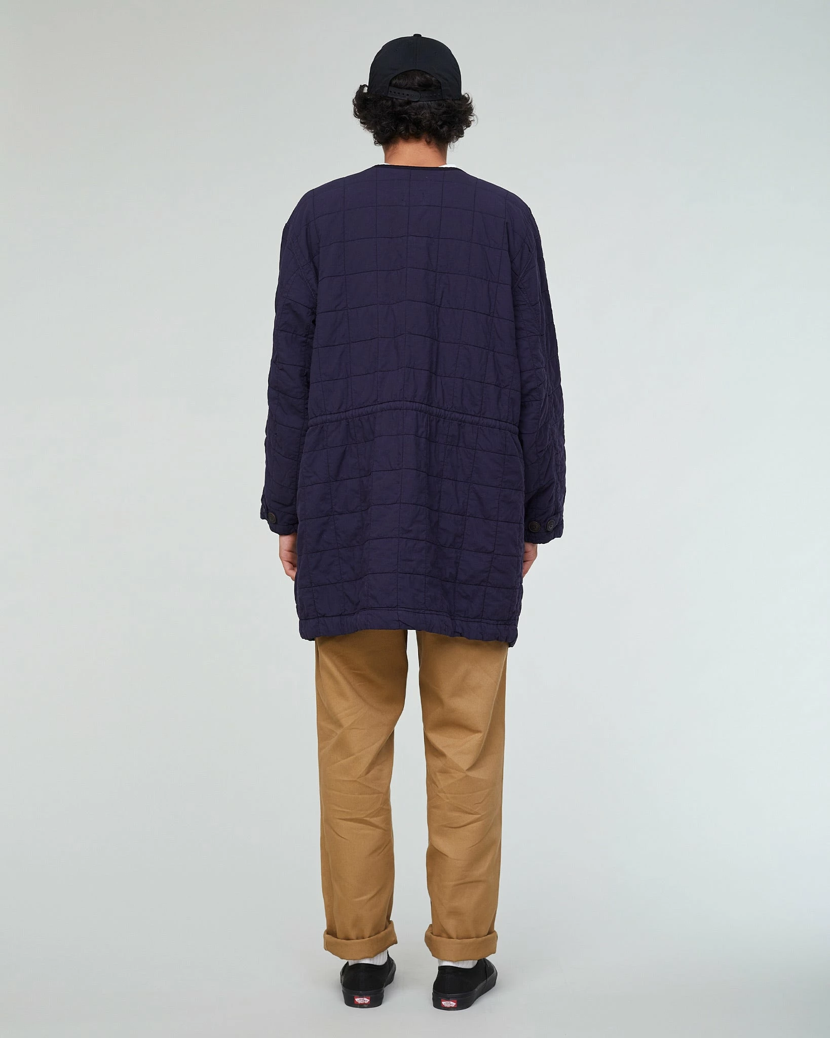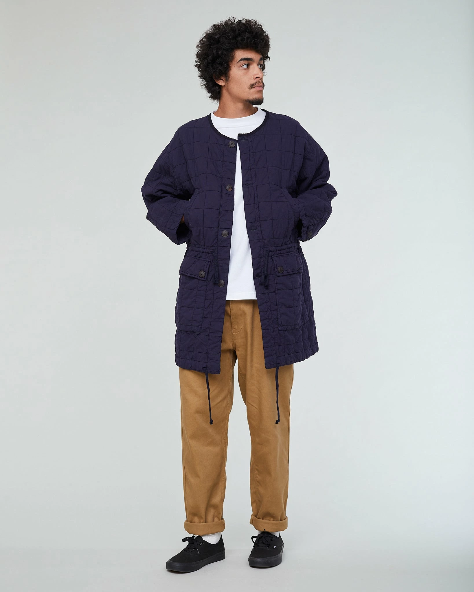 “Let’s make a liner, but make it longer”, that’s the basic idea here. The Power Liner is a unisex style that fits relaxed and easy, with its nearly straight shape and ample fit. In a beautiful and soft quilted cotton, it’s a perfect transitional piece. Comes with two big hip pockets, slash chest pockets and drawstrings on the waist and in the bottom hem.