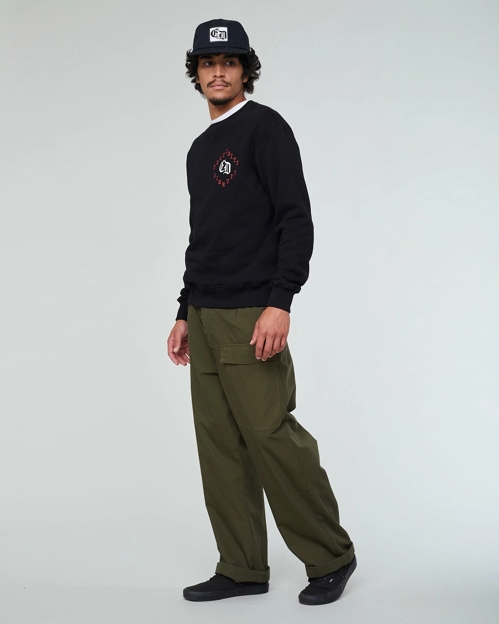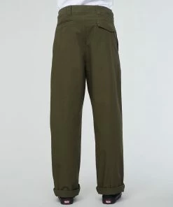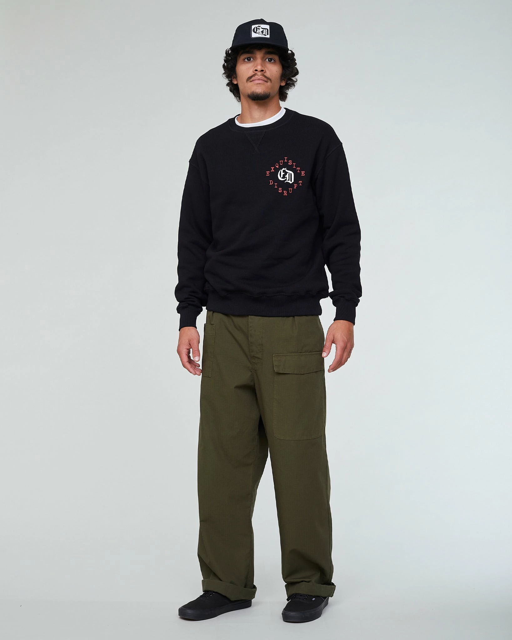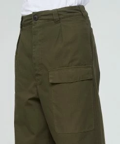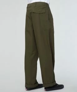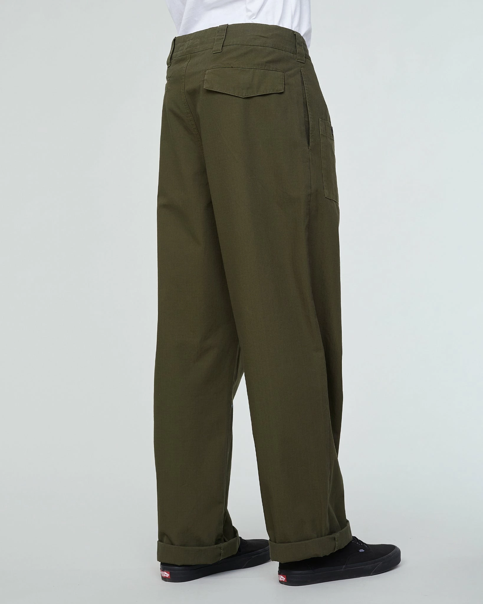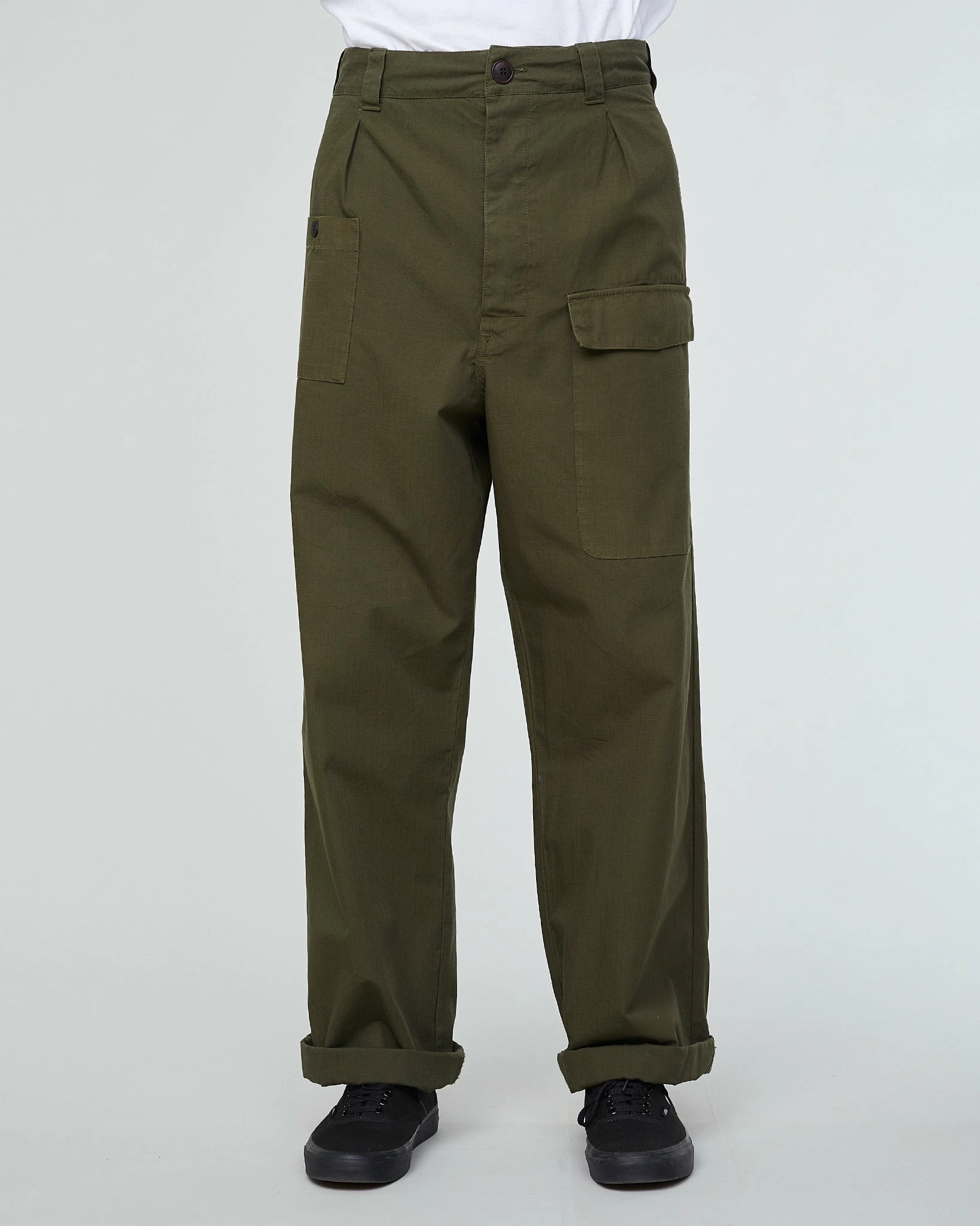Introducing: The Eat Dust Captain Pants. Inspired by a vintage pair of post-WWII Belgian battle dress military trousers, this is a loose fit with straight legs and a regular waist. What especially makes these stand out is the big map pocket on the thigh and the smaller front pocket on the opposite leg. Finished with 2 back pockets. Made from a lighter rip-stop cotton.