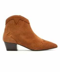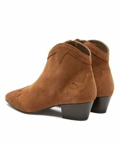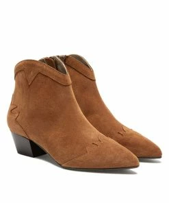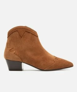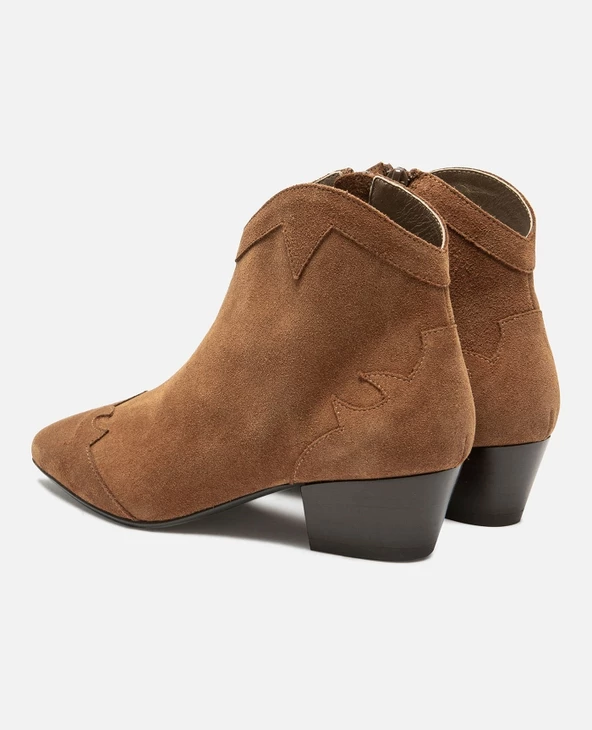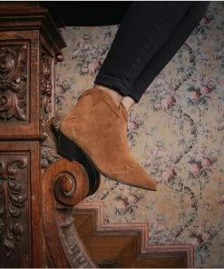 Ces boots camel 脿 talons en cro没te velours s’inscrivent dans la tendance western de la saison avec son bout pointu r茅hauss茅 de d茅tails surpiqu茅s et l茅g猫rement biseaut茅s faisant r茅f茅rence aux c茅l猫bres santiags. Existe en noir.