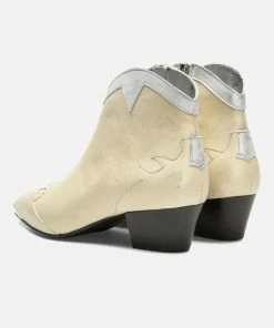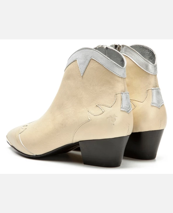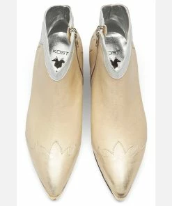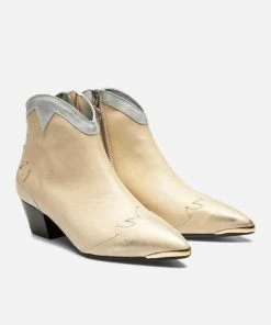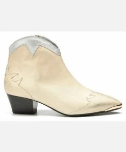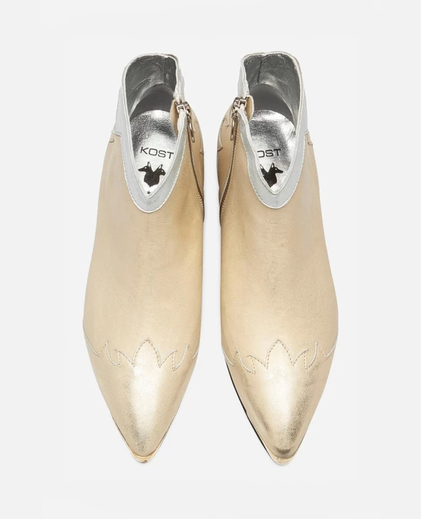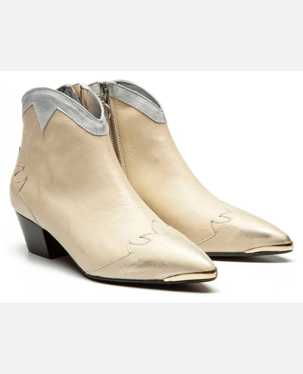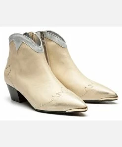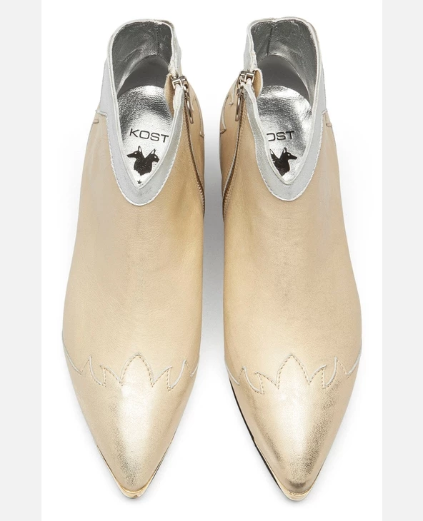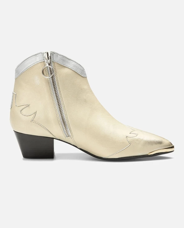 Une bottine Santiago habillé d’un cuir doré à l’aspect usé pour apporter une touche rock à la tenue. Du haut de son talon de 5cm, elle est confortable avec sa doublure cuir et semelle intérieure cuir.