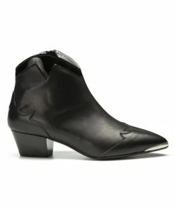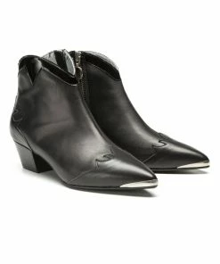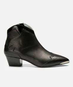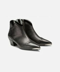 Fabriquée au Portugal, cette bottine pointue en cuir affirme son esprit Santiag avec ses détails surpiqués au talon et à l’avant du pied. Son talon de 5cm assure une silhouette allongée. Sa semelle en gomme assure une bonne adhérence au sol.