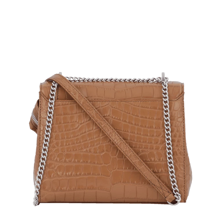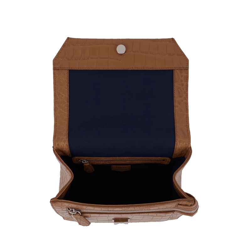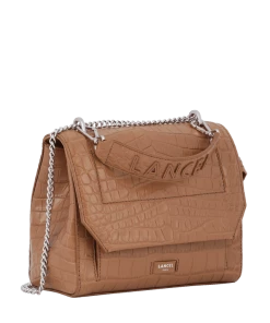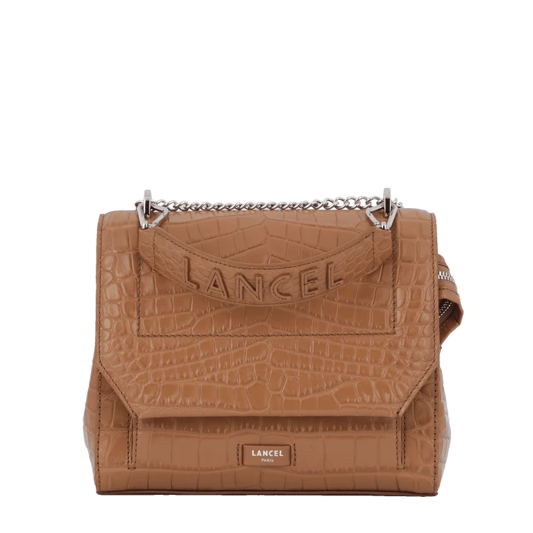history Young and accessible, NINON de LANCEL is our new line of fashion and urban bags, to wear day and night. Modern and multifaceted with its chain and sliding leather shoulder strap offering an ingenious multi-carry, NINON de LANCEL is characterized by its graphic and assertive style. Signature elements of this strong personality line, the maxi logo handle, curved details and asymmetrical zip give it a rock and trendy look. The bags are made of round, lightweight cowhide leather, offering a structured and flexible look. details Shiny crocodile style cowhide leatherFlap bag Textile lining Detachable handle One exterior patch pocket on the back One exterior zipped pocket under the flap One inside patch pocket One inner zipper pocket Sliding chain and leather shoulder strap Made in Italy REF:A10930LHTU size 23,5 x 19 x 12 cm care We advise a careful application of the “crème essentielle” to revive and protect your product.