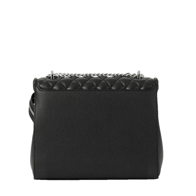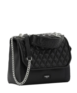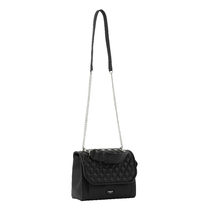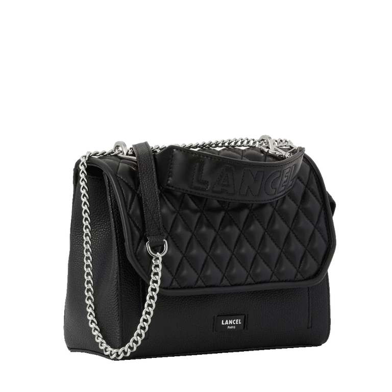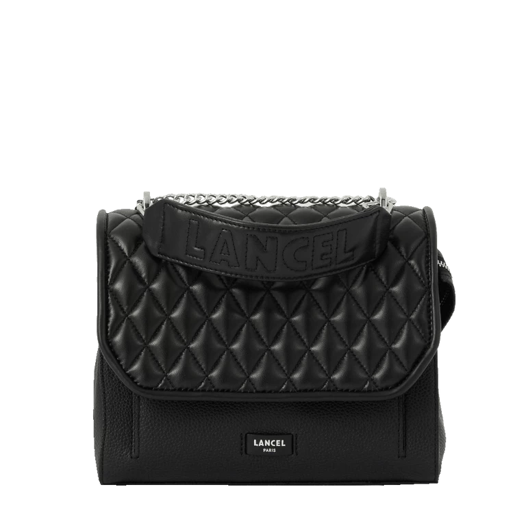 history Young and accessible, Ninon by Lancel is our new line of fashionable and urban bags, to be worn day and night. Modern and multifaceted with its sliding leather and chain shoulder strap offering an ingenious multi-carry, Ninon by Lancel is characterised by its graphic and assertive style. The signature elements of this strong personality line are the maxi logo handle, the curved details and the asymmetrical zip, which give it a trendy rock look.  The bags are made from light, round-grained cowhide leather, which is both structured and supple. details Diagonal pattern quilted grained and smooth cowhide leatherTextile lining Chain and leather shoulder strap Removable handle An exterior patch pocket on the back One outside zipped pocket under the flap One inside patch pocket One inside zipped pocket Made in Italy REF:A1222910TU size 23,5 x 19 x 12 cm care We advise a careful application of the “crème essentielle” to revive and protect your product.