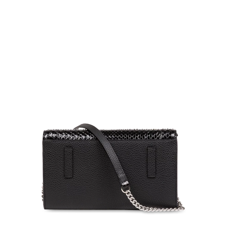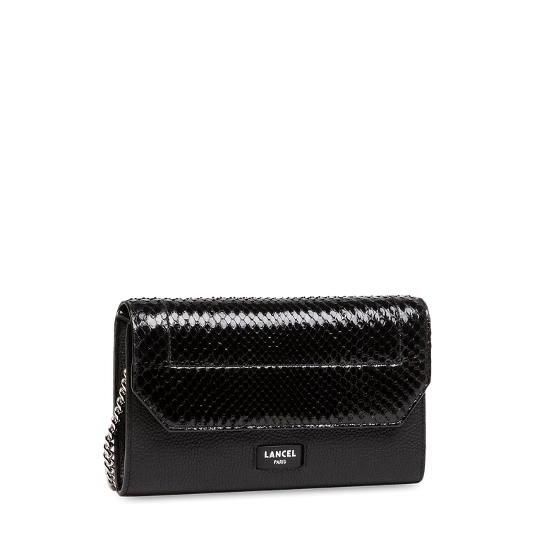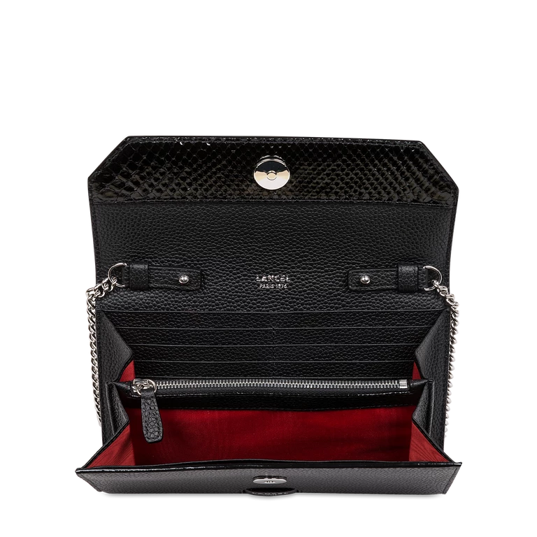 history Young and accessible, Ninon de Lancel is our new line of fashionable and urban bags, to be worn day and night. Modern and multifaceted with its chain and sliding leather shoulder strap offering ingenious multi-wear, Ninon de Lancel is characterized by its graphic and assertive style. Signature elements of this line with a strong personality, the maxi logo handle, rounded details and asymmetric zip give it a rock and trendy look. The bags are made in a round and light cowhide leather, offering a structured and supple look at the same time. details Grained cowhide and pythonTextile lining Removable chain and leather shoulder strap Two leather loops at the back for wearing on the belt Two compartments for tickets, papers, tickets Two multifunction patch pockets Ten card slots A zipped coin compartment Compatible with the latest smartphones Made in Europe REF:A1147210TU size 20 x 12 x 2 cm